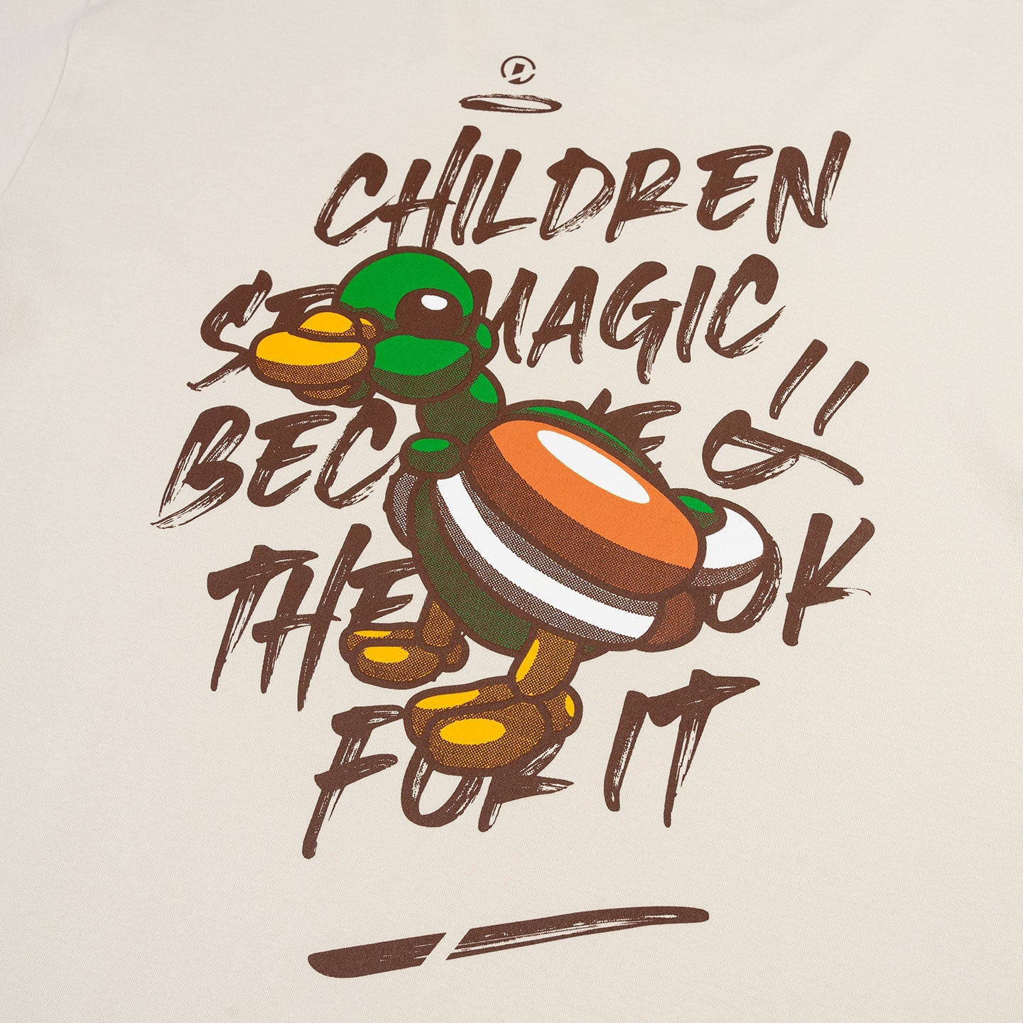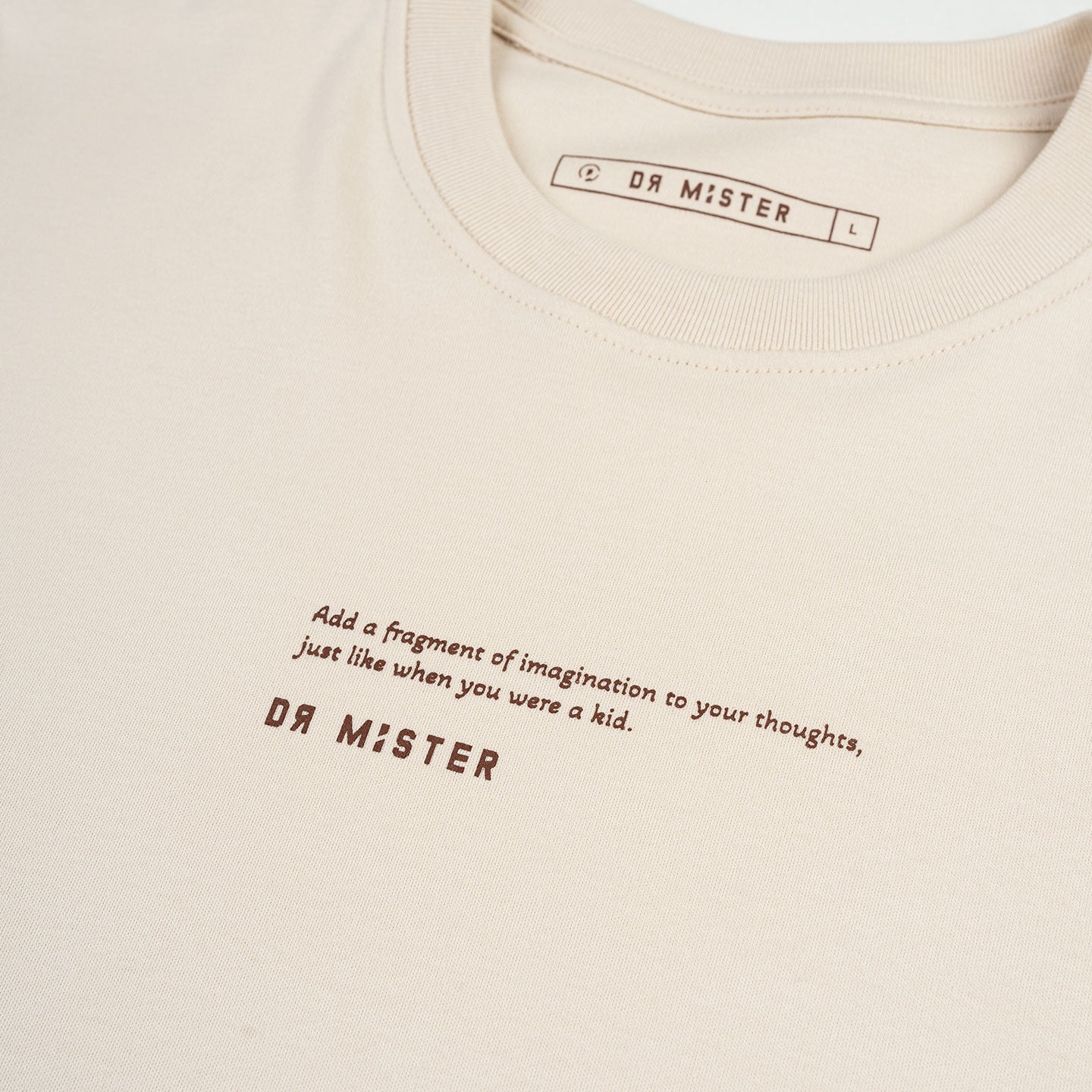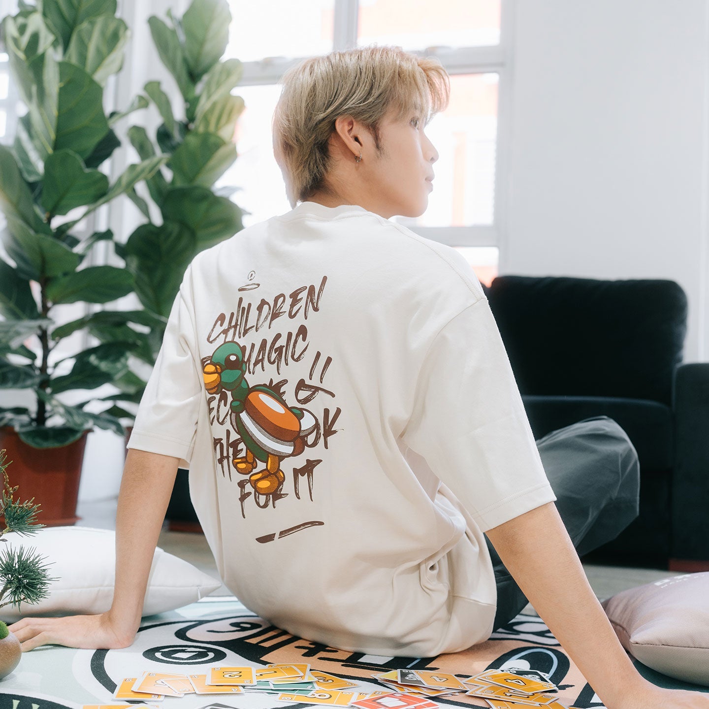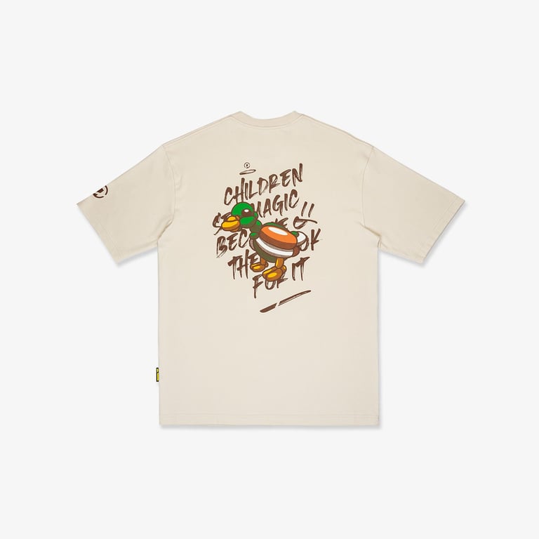 Beige oversized tee, made from pre-shrunk interlock cotton, features the usual oversized collection phrases at the back, complements with the new design of a balloon mallard, that symbolise change or new beginning. The front is printed minimally with the rationale of the collection together with our logotype. Left sleeve with round graphic logo printed.