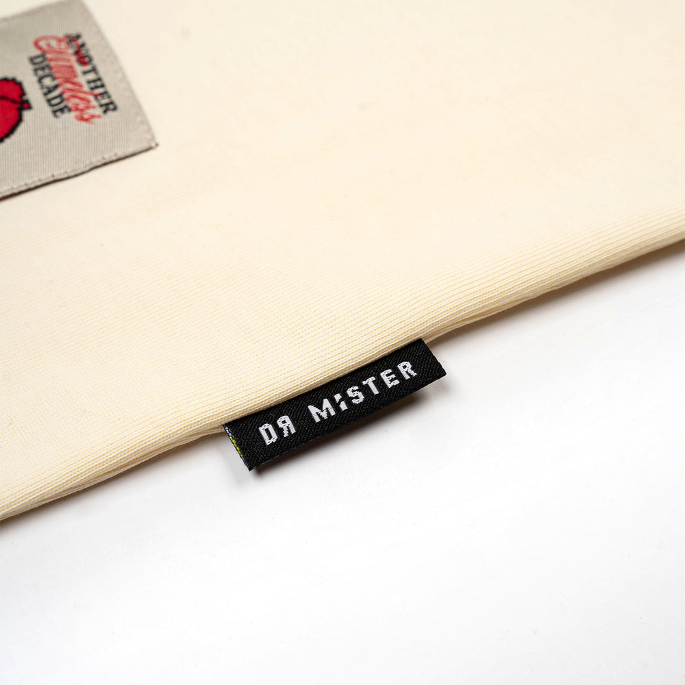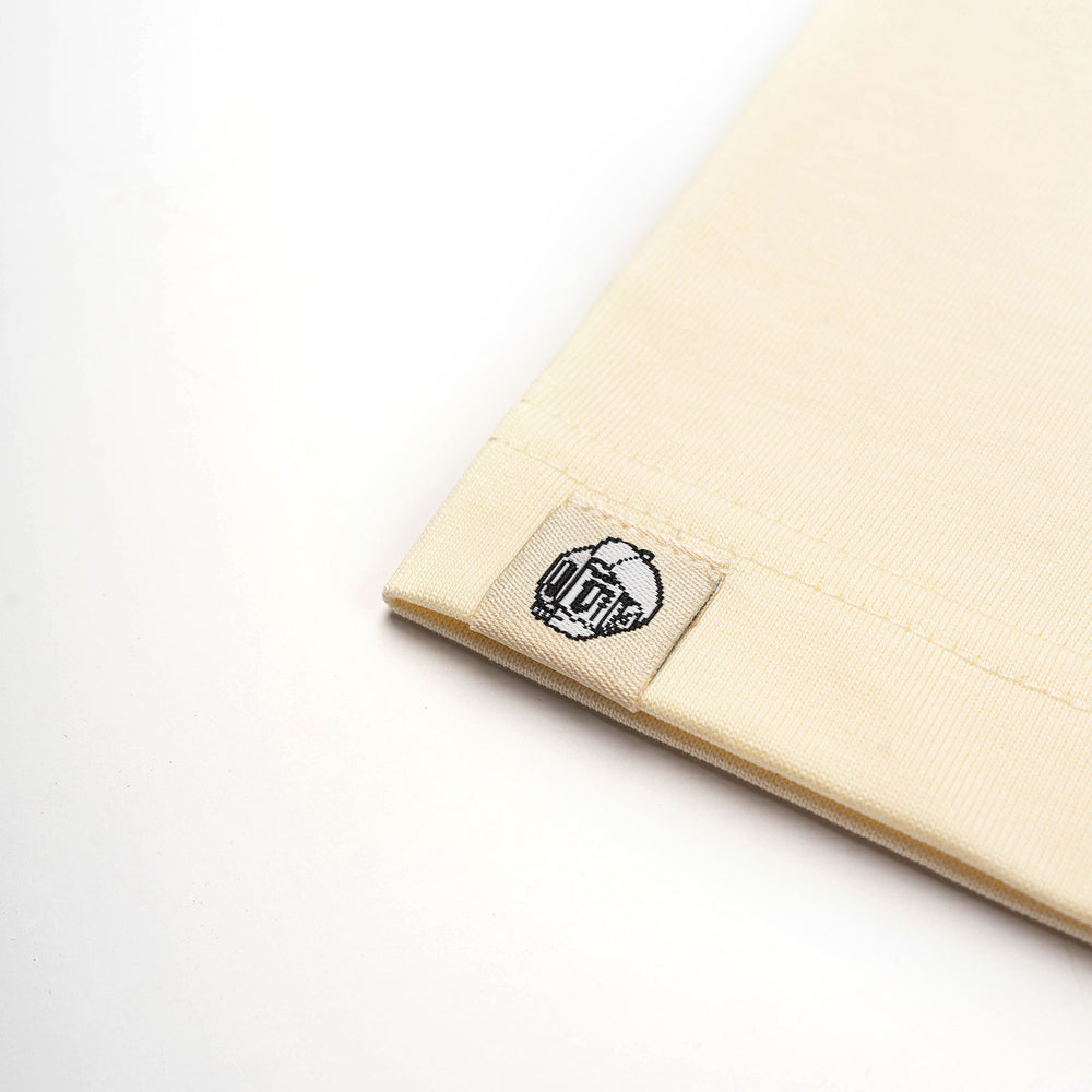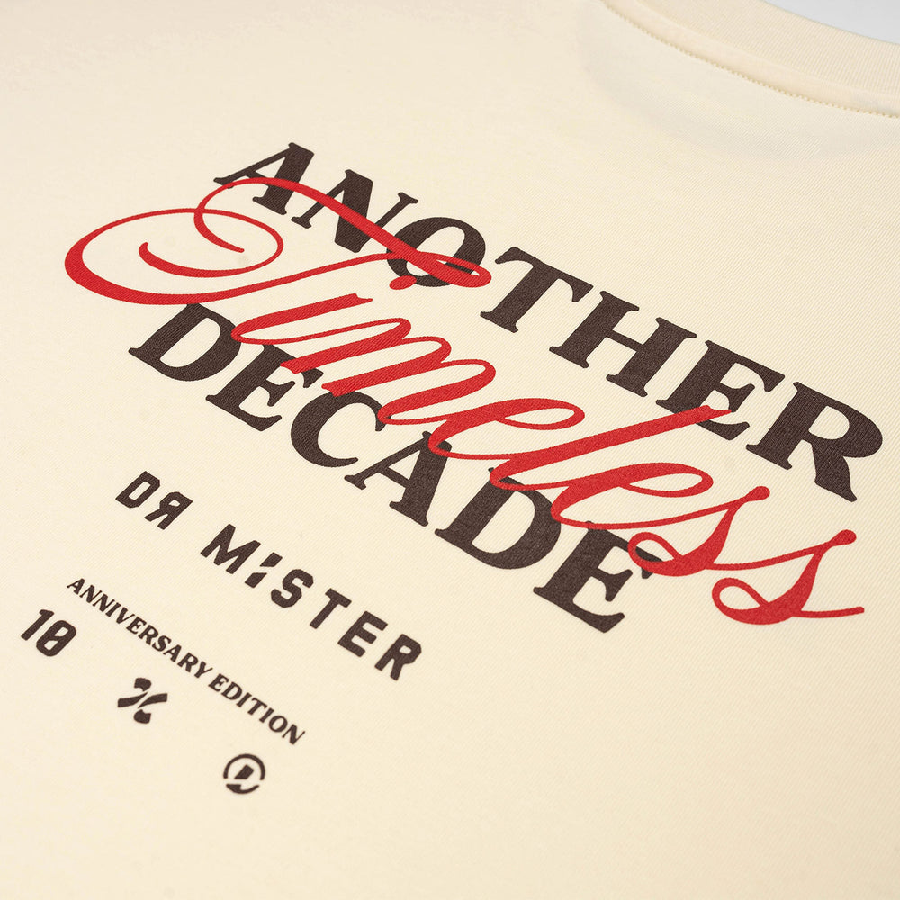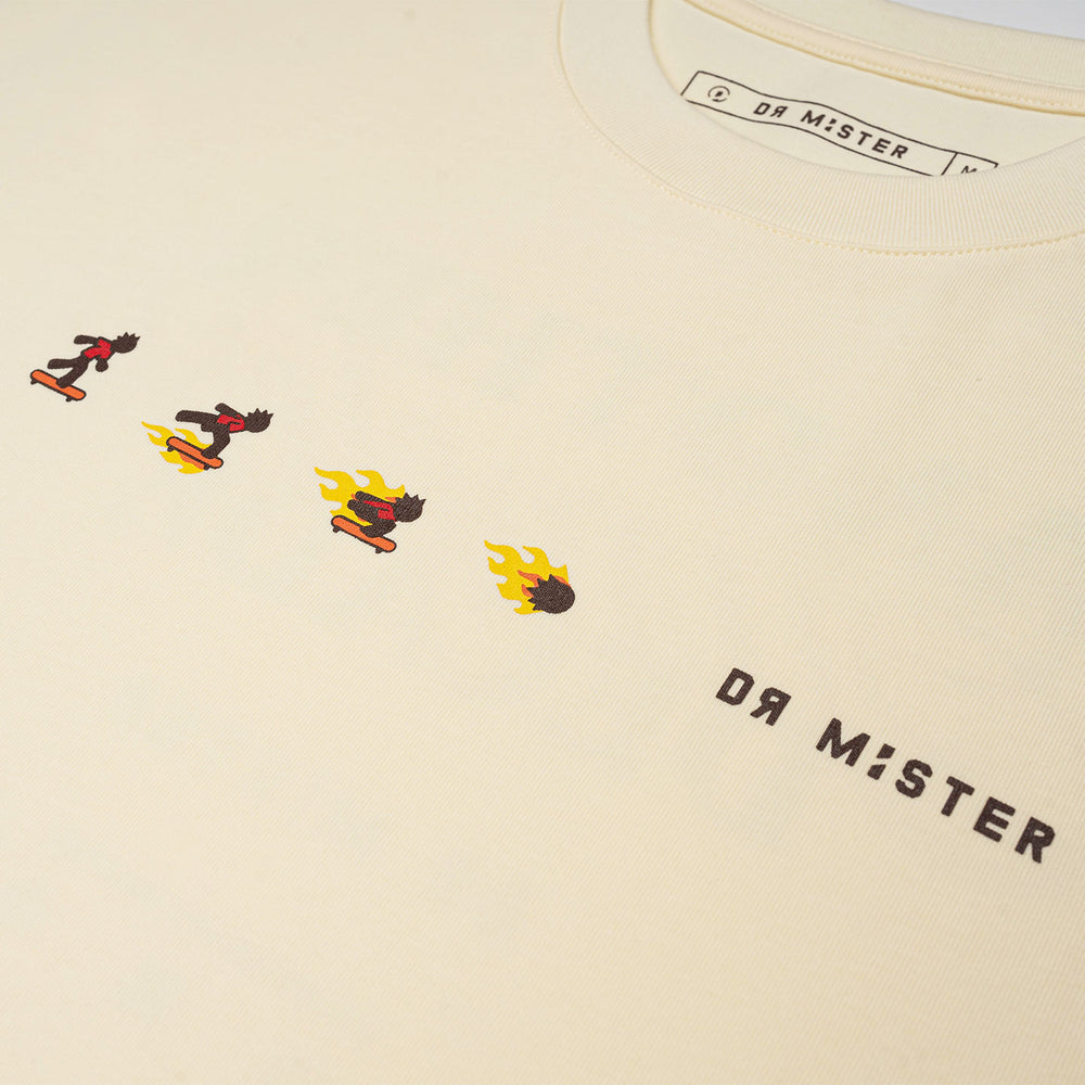 Made from pre-washed combed cotton, the cream yellow tee features a spiky-haired boy in motion, skateboarding through time, each frame showing his transformation until he blazes into a fireball. The back showcases an oversized anniversary slogan graphic.