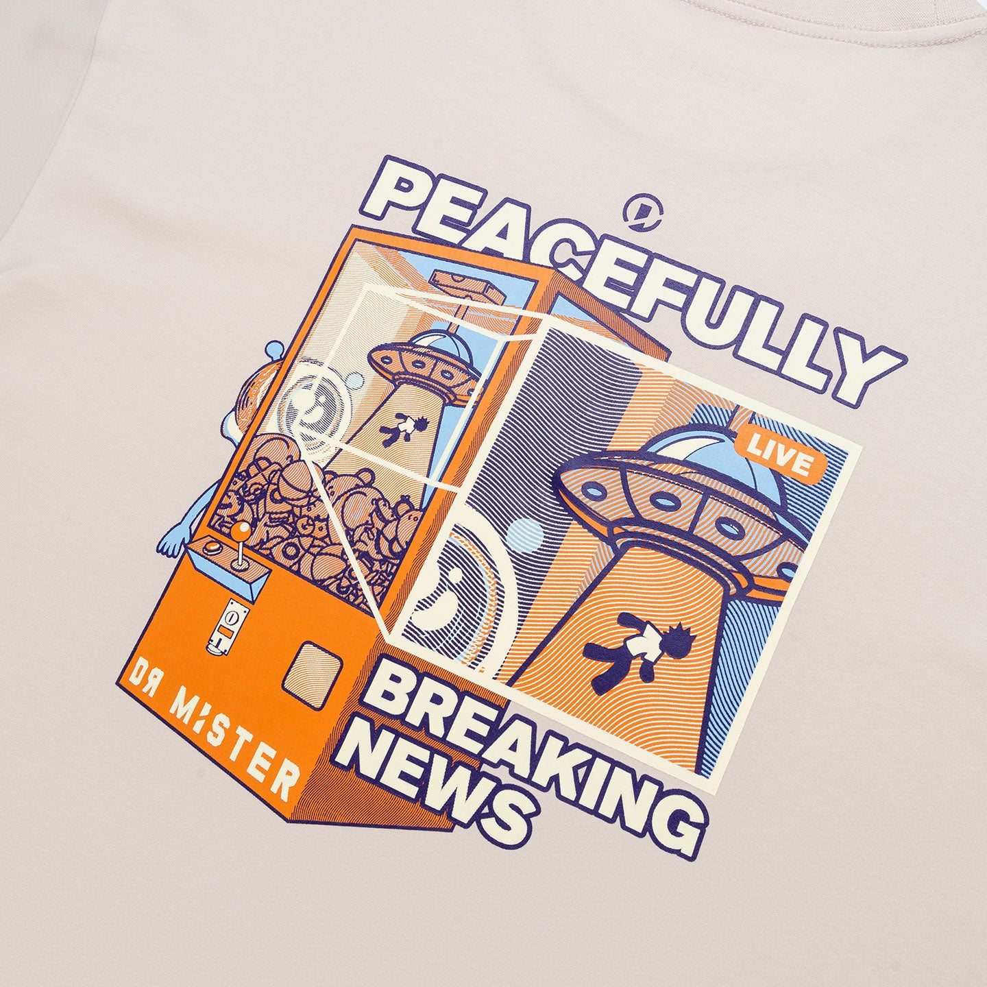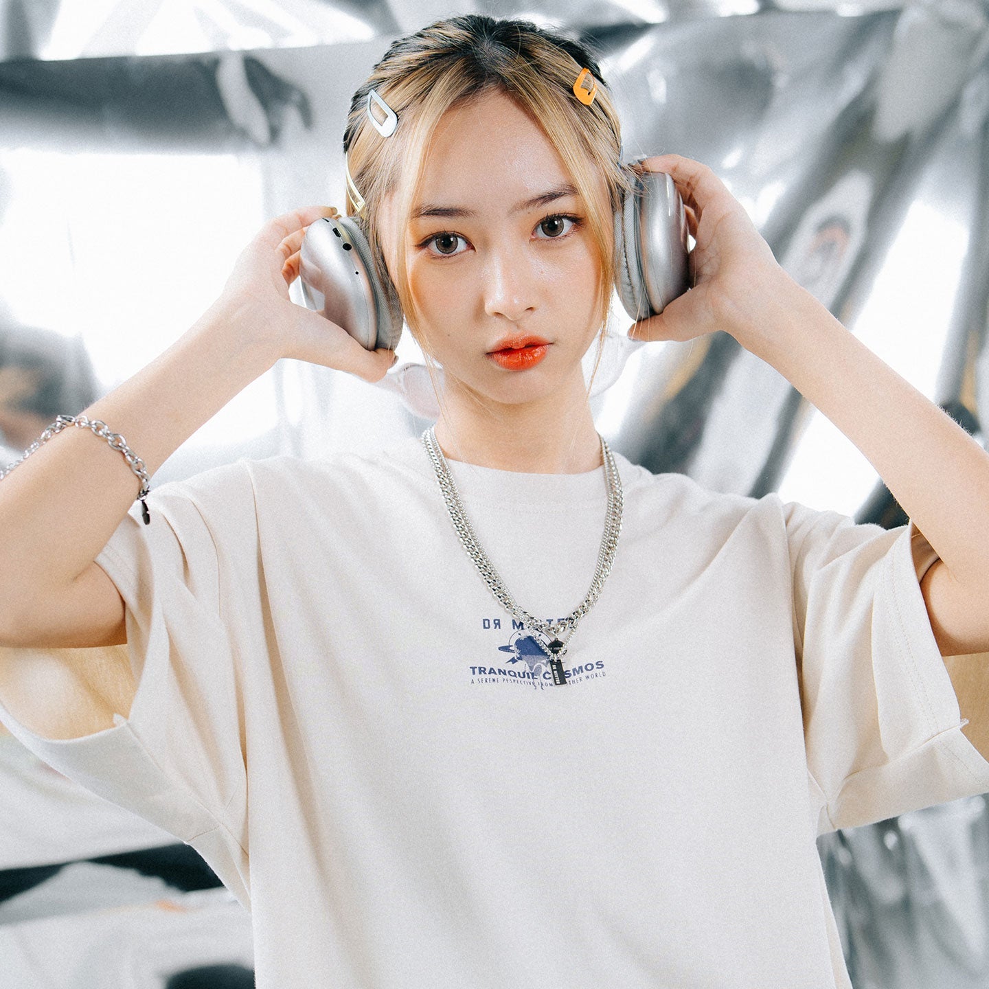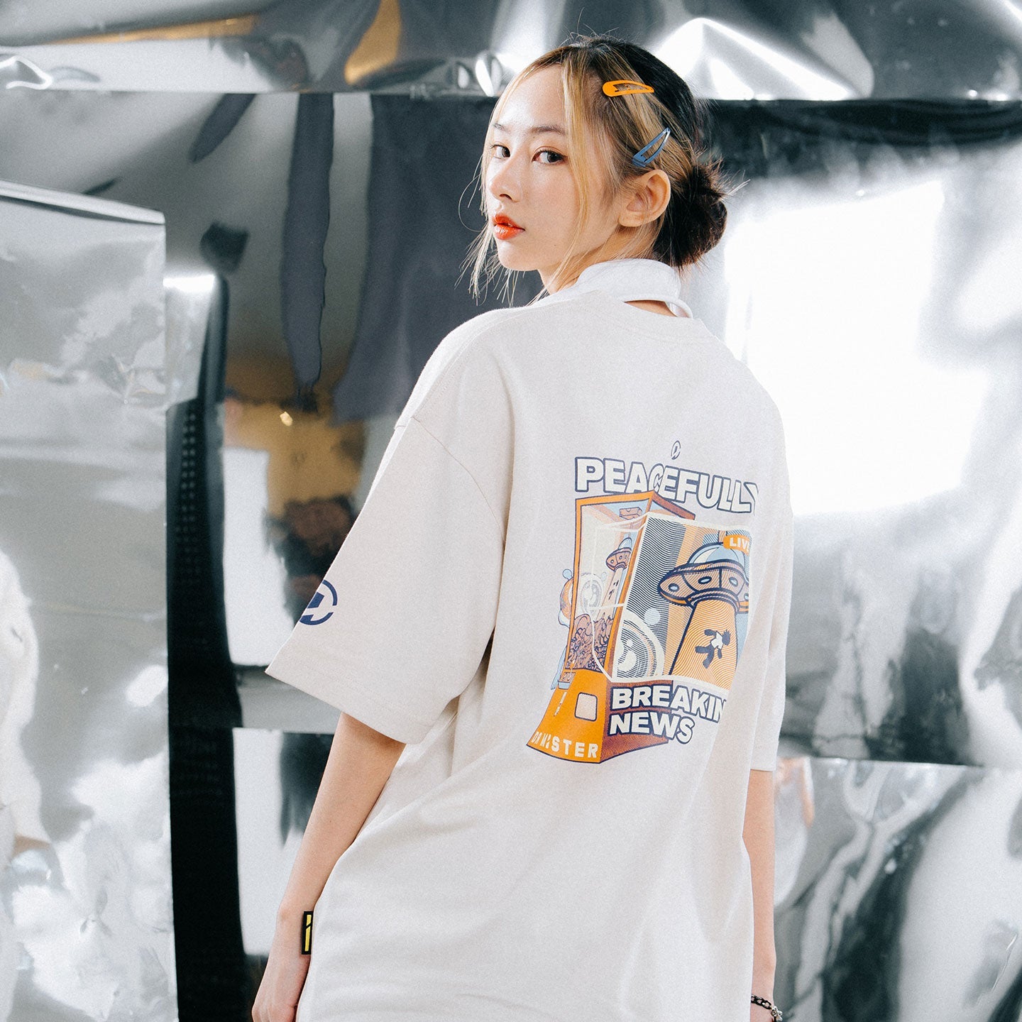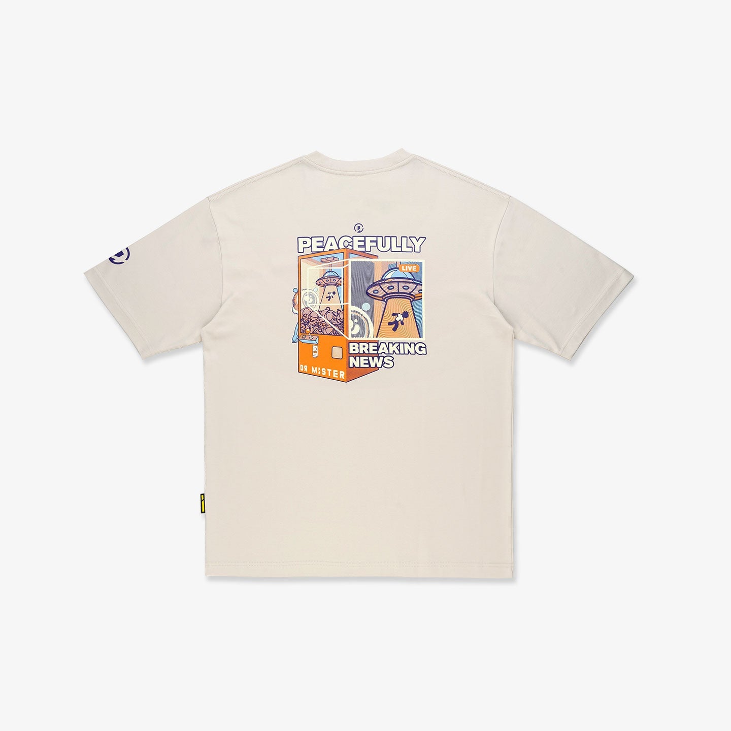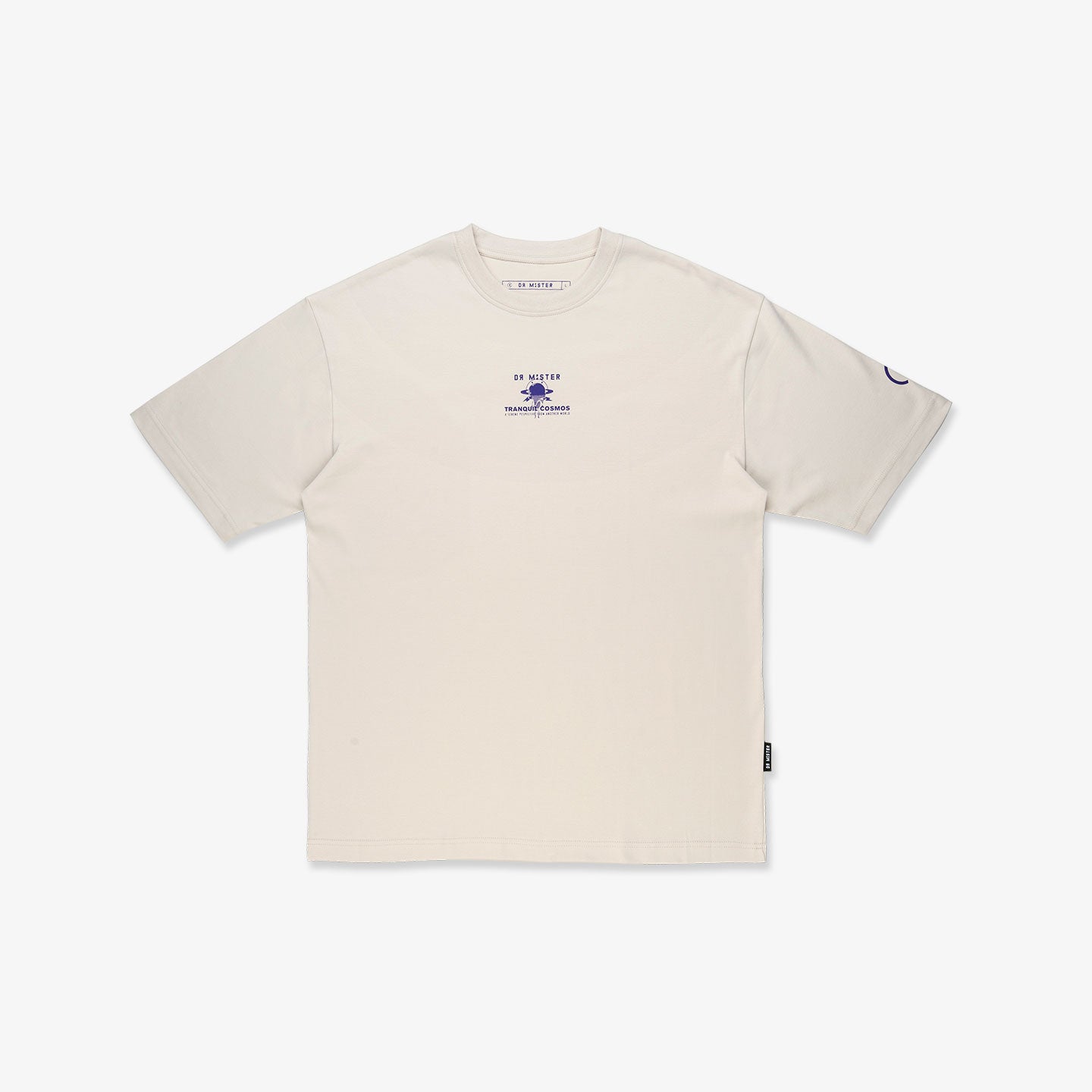 Beige colour oversized fit t-shirt, featuring tranquil cosmos wording and accompanied by an alien graphic displayed on the front. The back of the t-shirt showcases the graphics of an alien peacefully interacting with a crawl machine, while the media manipulated the image to grab attention. Our brand logo is printed on left sides of the sleeve. Crafted with our signature pre-shrunk interlock combed cotton, offering unparalleled comfort and quality.
