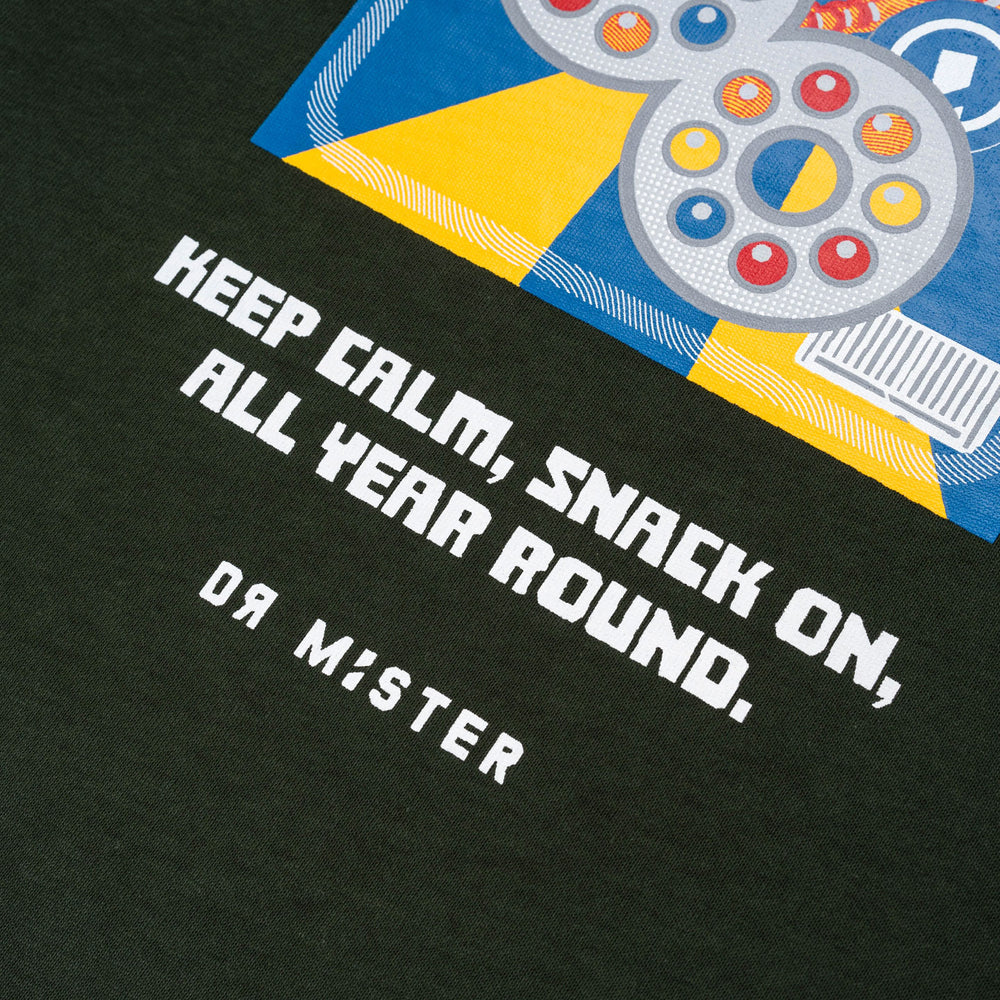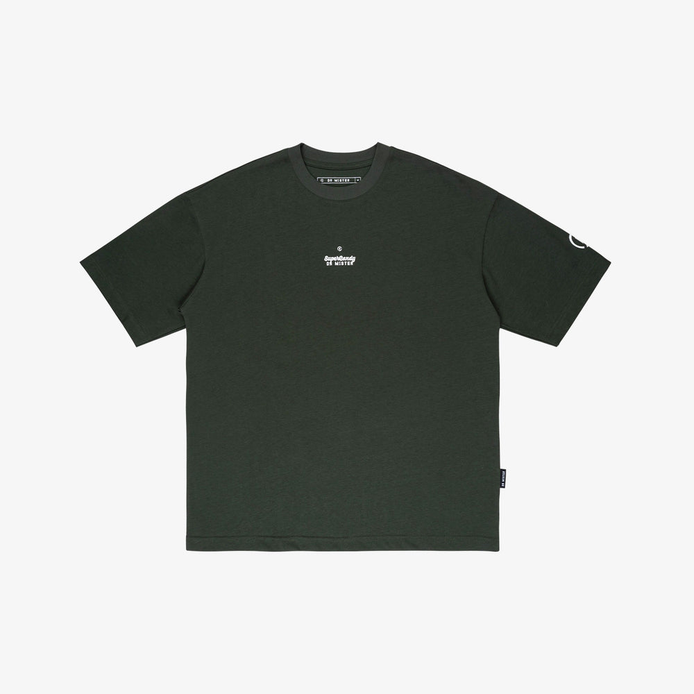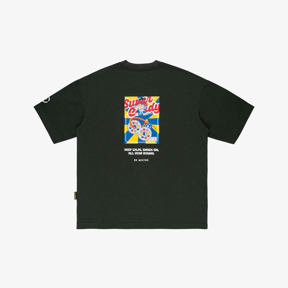 Crafted from interlock combed cotton, the olive green casual tee displays a candy pack that mimics the texture, colors, and details of a real candy wrapper. The design highlights playful eyeglass chocolate candy set against a striking sunburst background in classic blue and yellow. The front is completed with bold “Super Candy” in groovy font, a logotype and graphic logo.