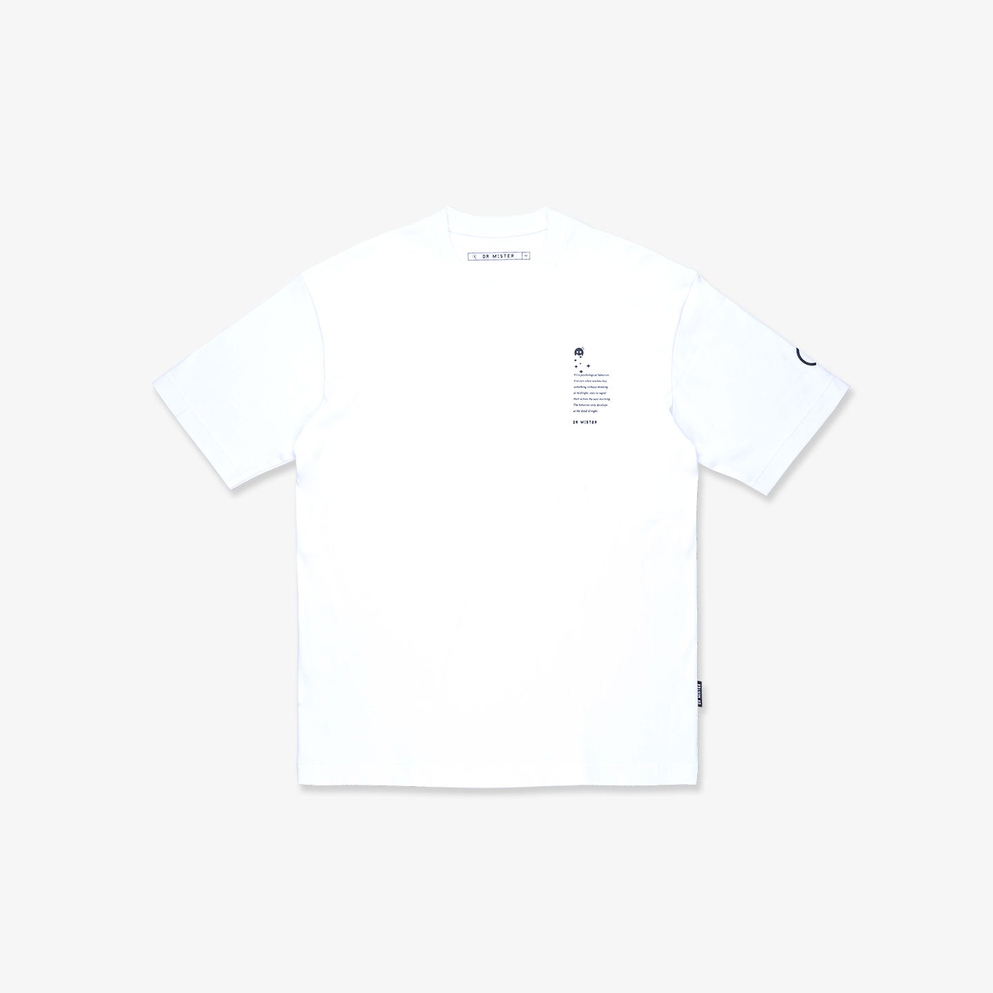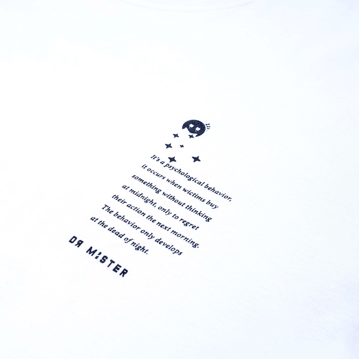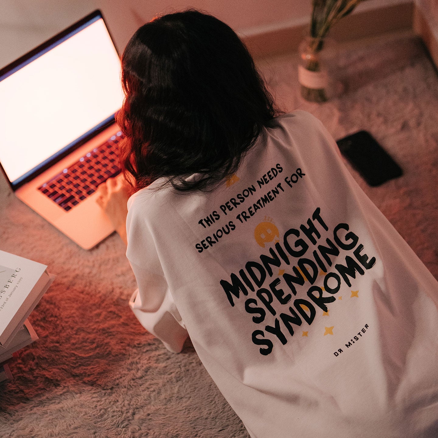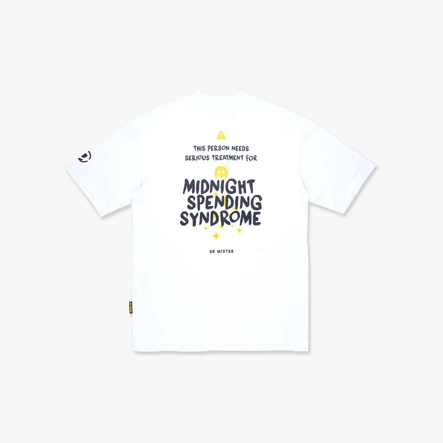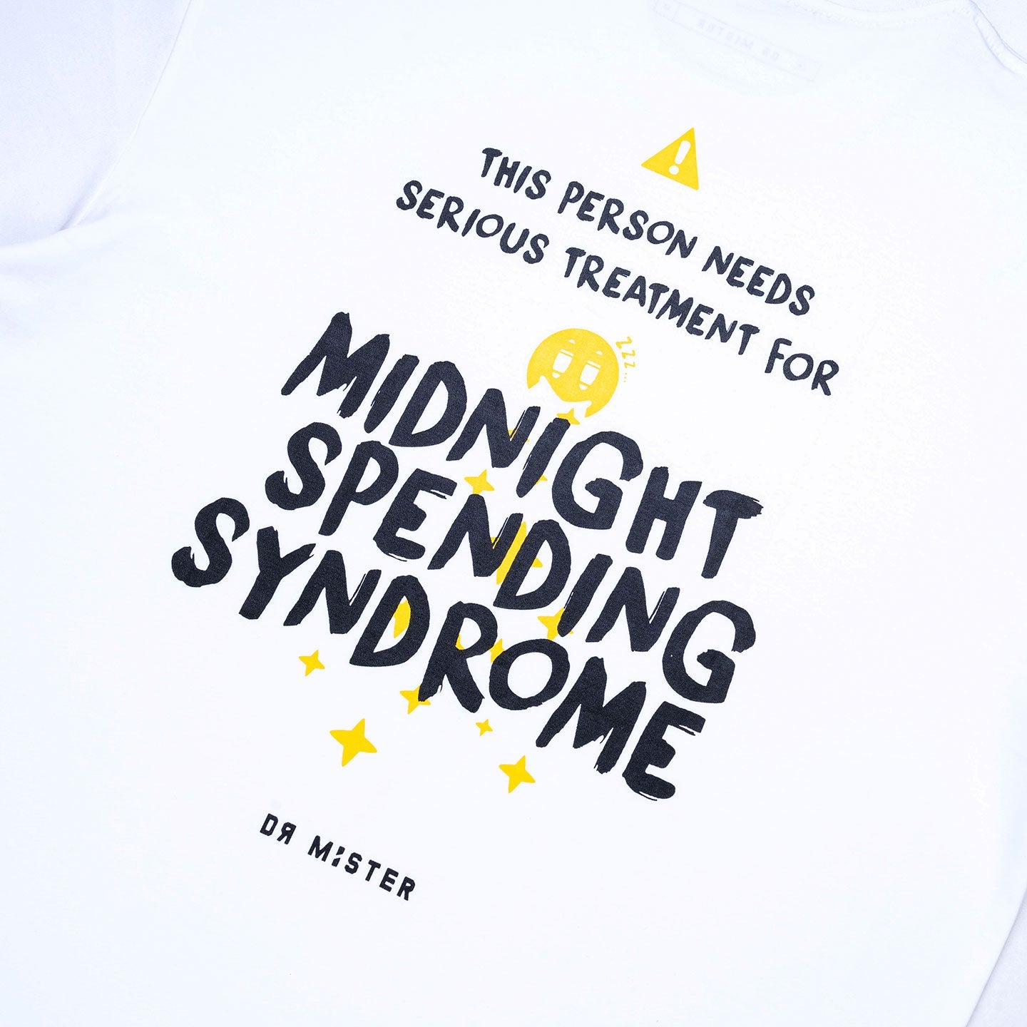 A trendy white tee made from pre-shrunk interlock combed cotton fabric, featuring an attention-grabbing graphic design. The phrase "Midnight Spending Syndrome" is prominently featured on the back of the t-shirt. The front of the shirt showcases the collection's messages. It is designed with an oversized and fit cutting style.