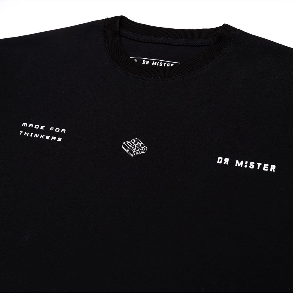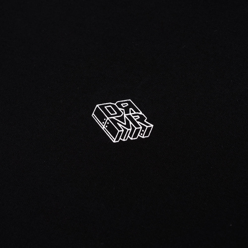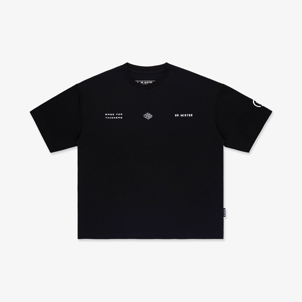 The Black Broad Tee showcases a chrome coloured isometric of our brand abbreviation “DRMR” at the back. The front minimally features the “Made by thinkers, for thinker” Phase together with a mini brand abbreviation and logotype.