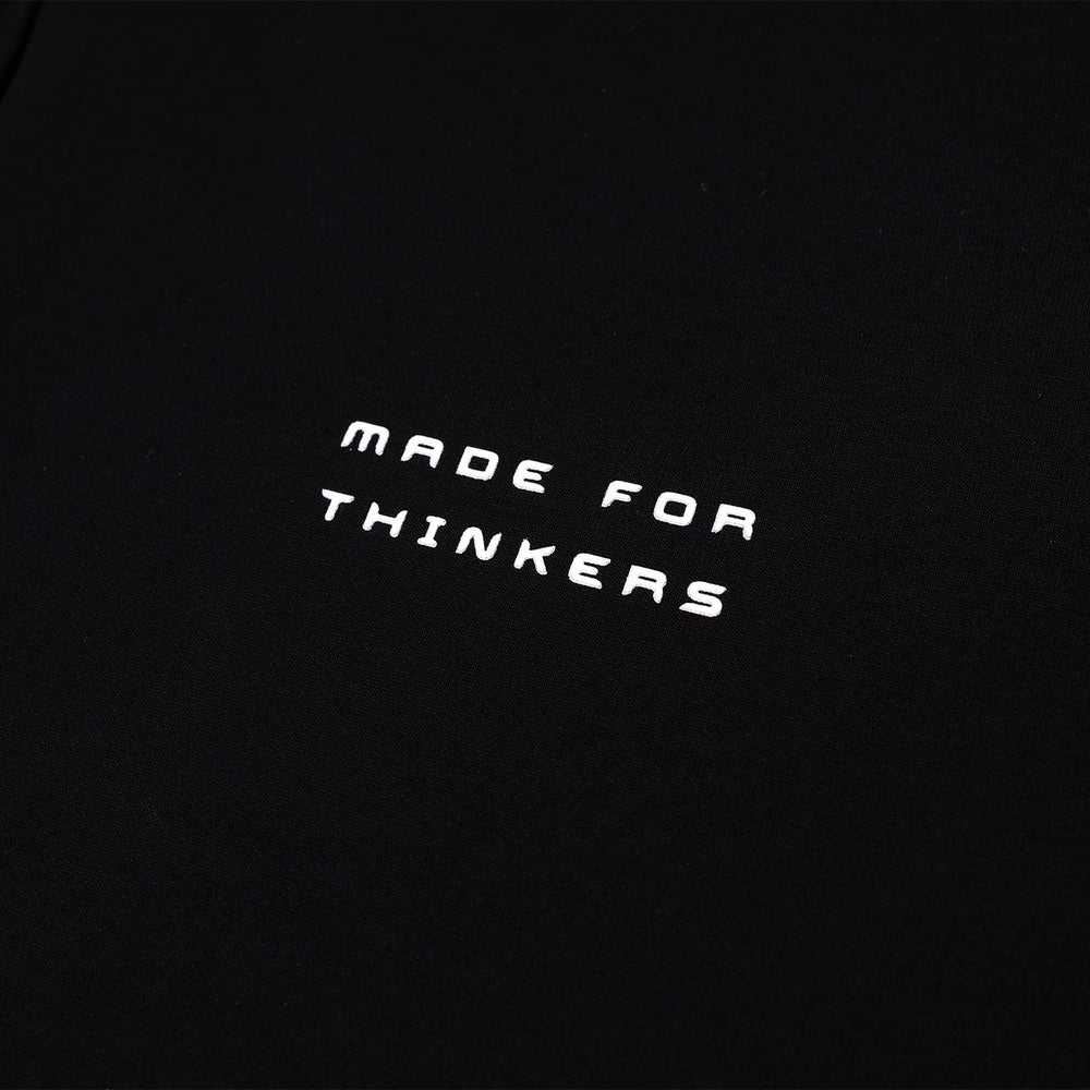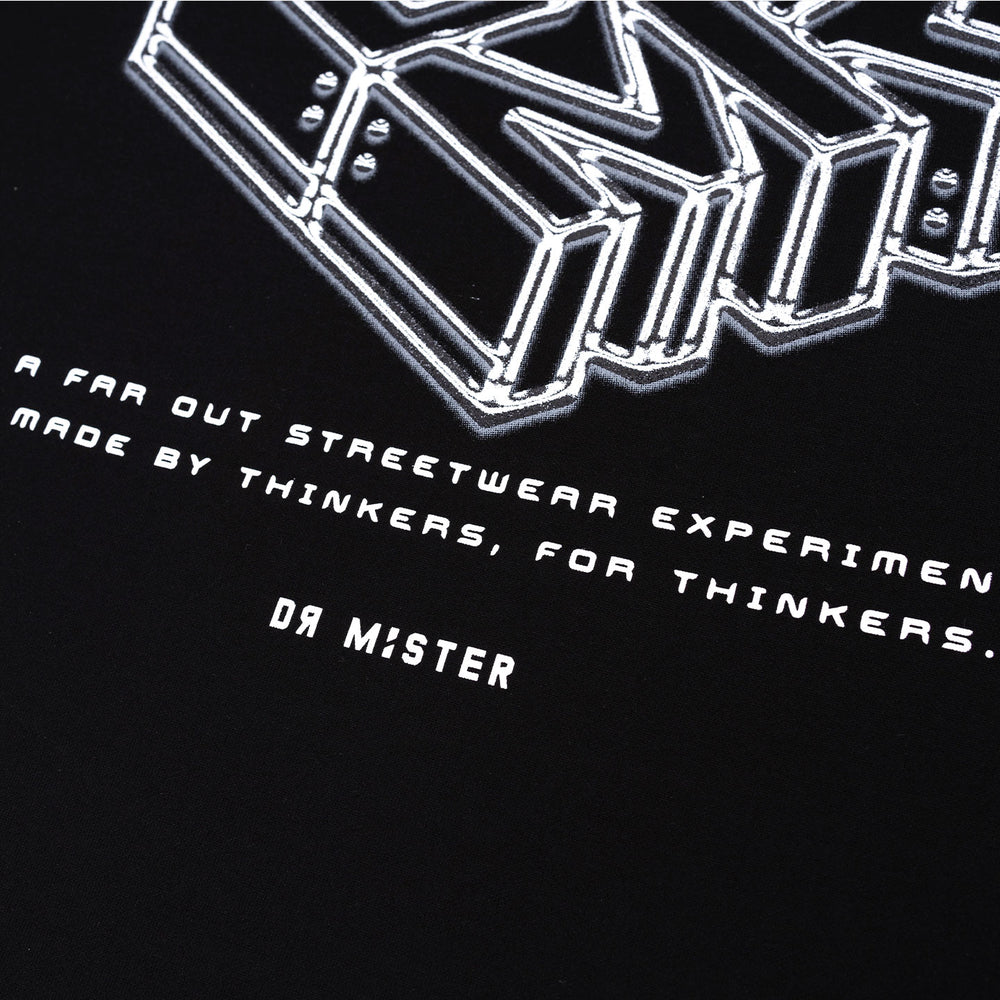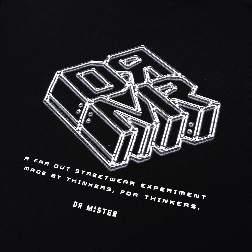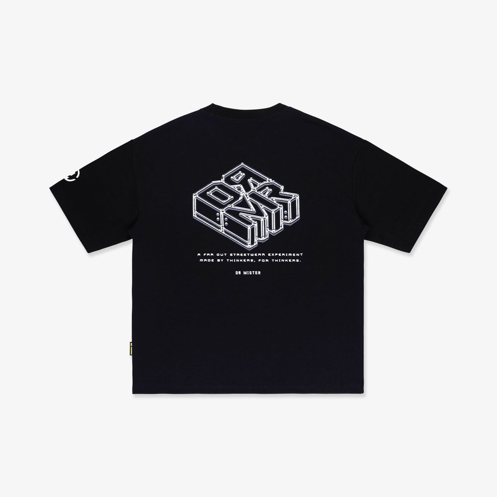 The Black Broad Tee showcases a chrome coloured isometric of our brand abbreviation “DRMR” at the back. The front minimally features the “Made by thinkers, for thinker” Phase together with a mini brand abbreviation and logotype.