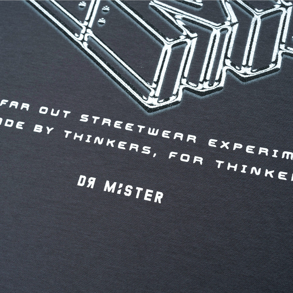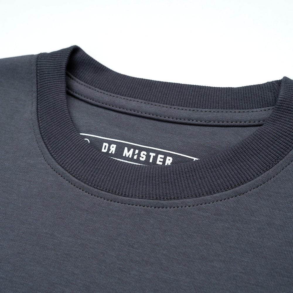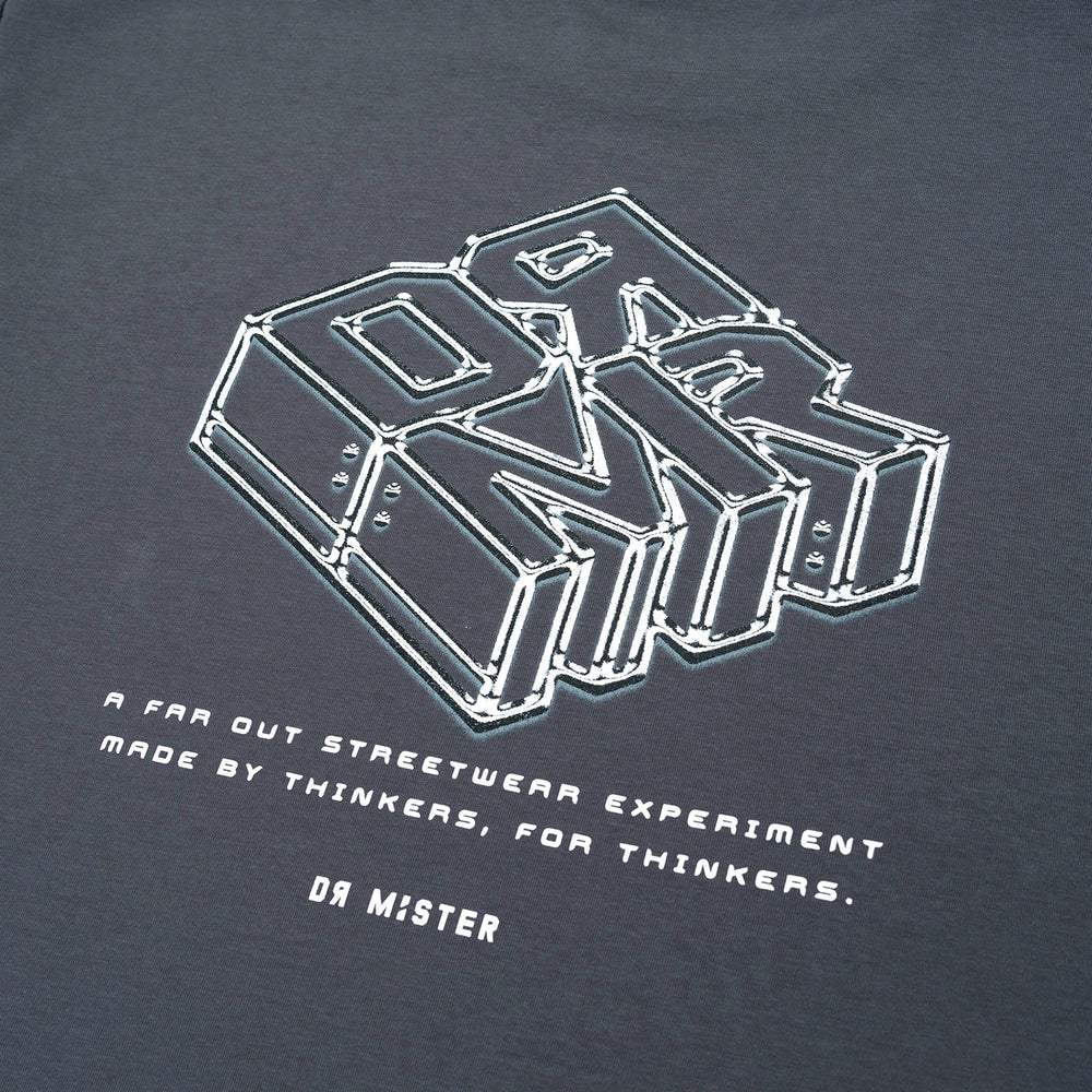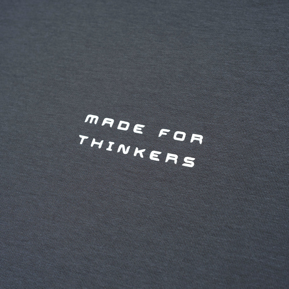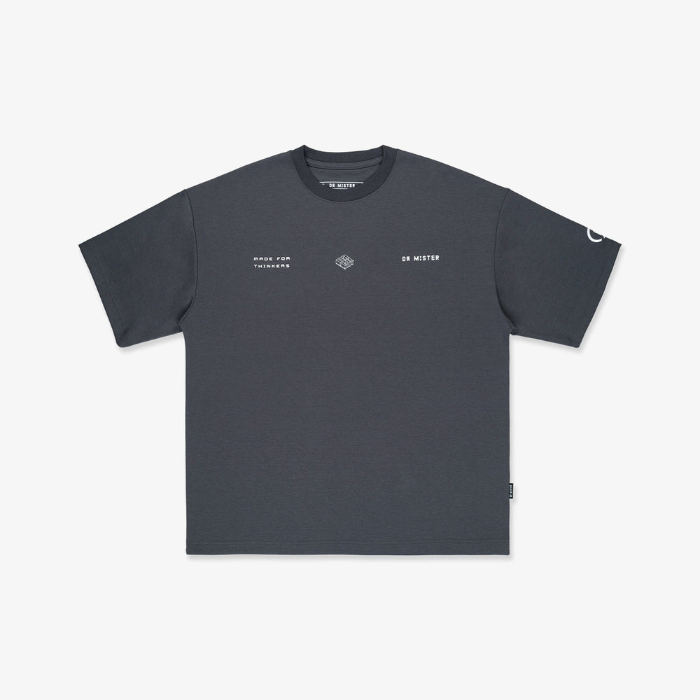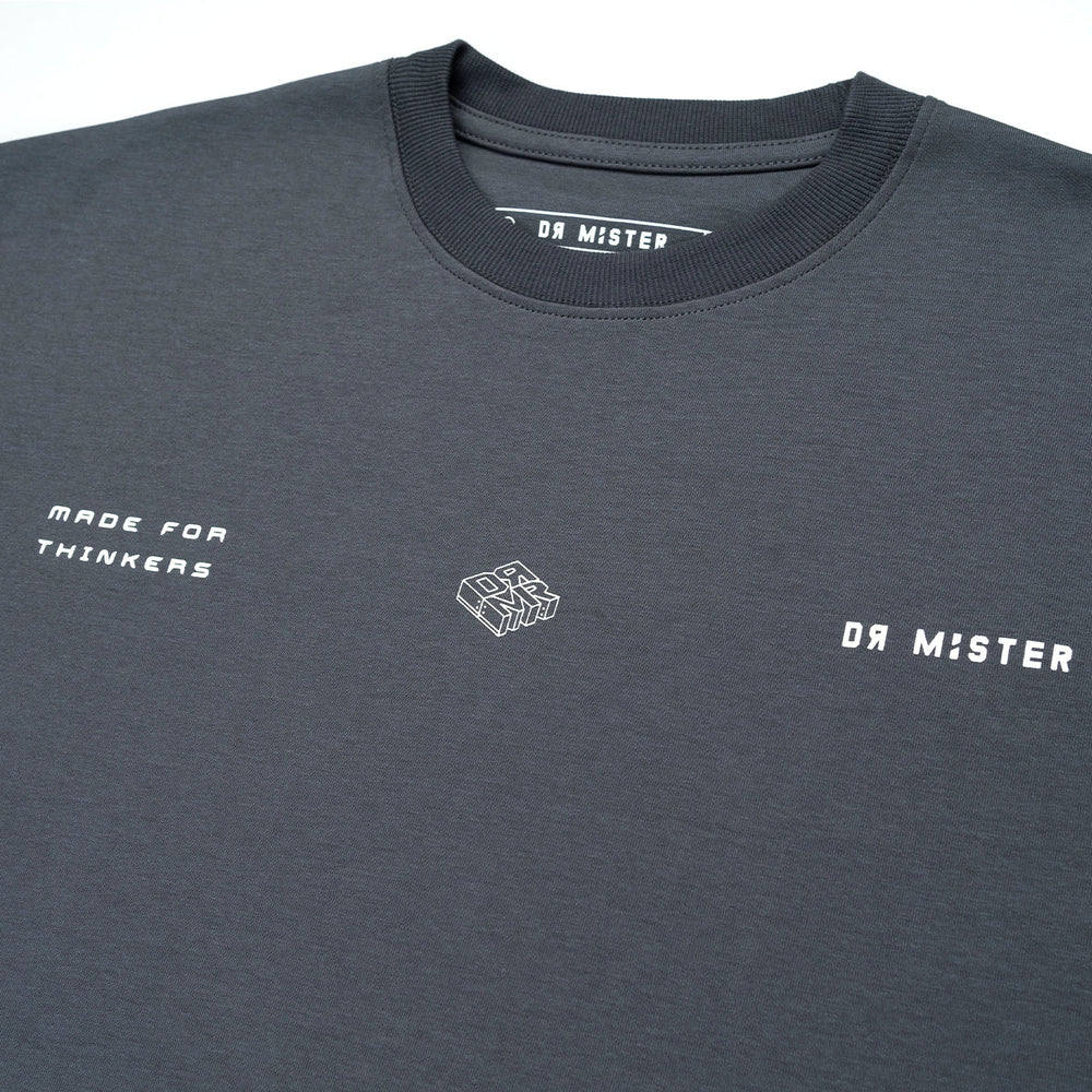 The Grey Broad Tee showcases a chrome-coloured isometric of our brand abbreviation “DRMR” at the back. The front minimally features the “Made by thinkers, for thinker” Phase together with a mini brand abbreviation and logotype.