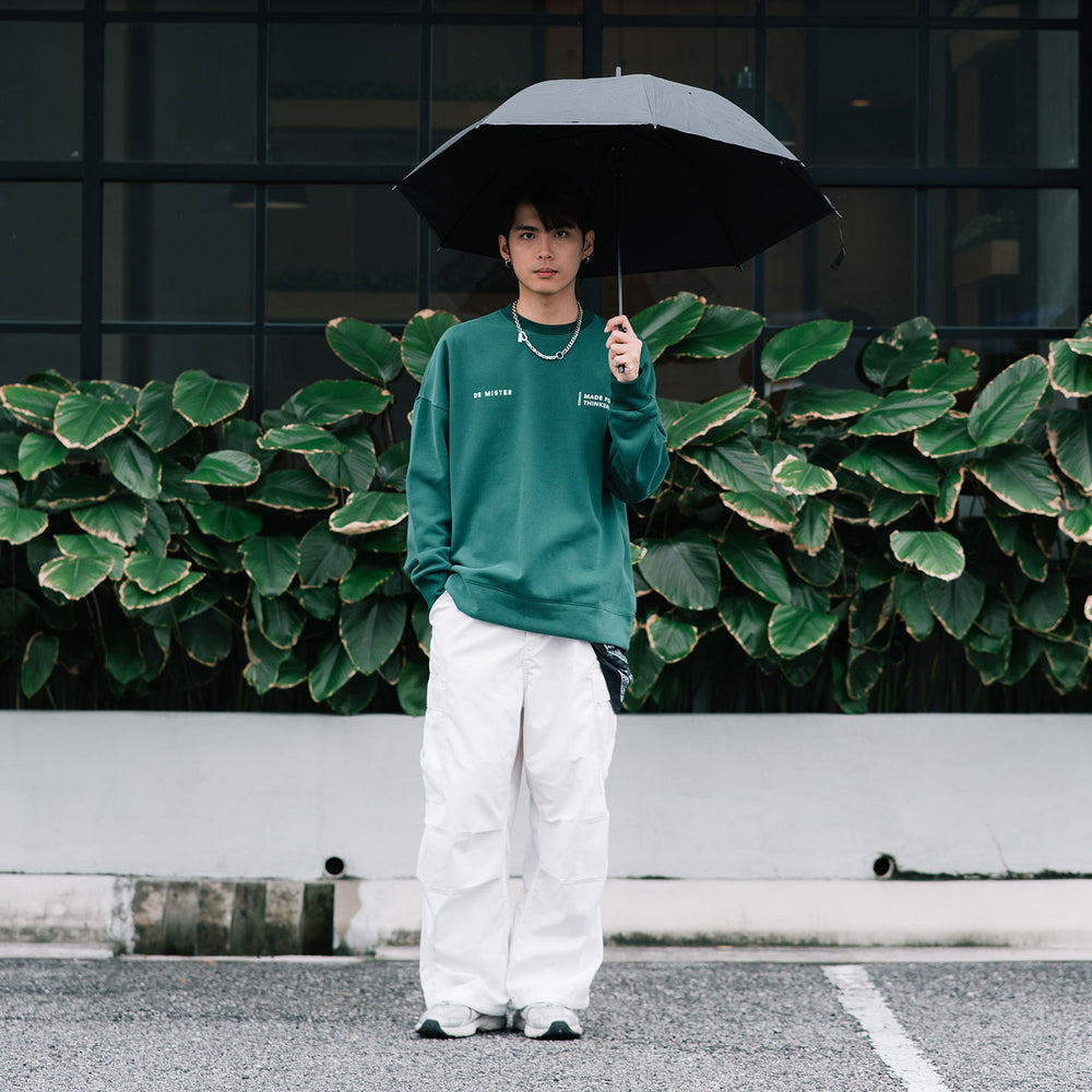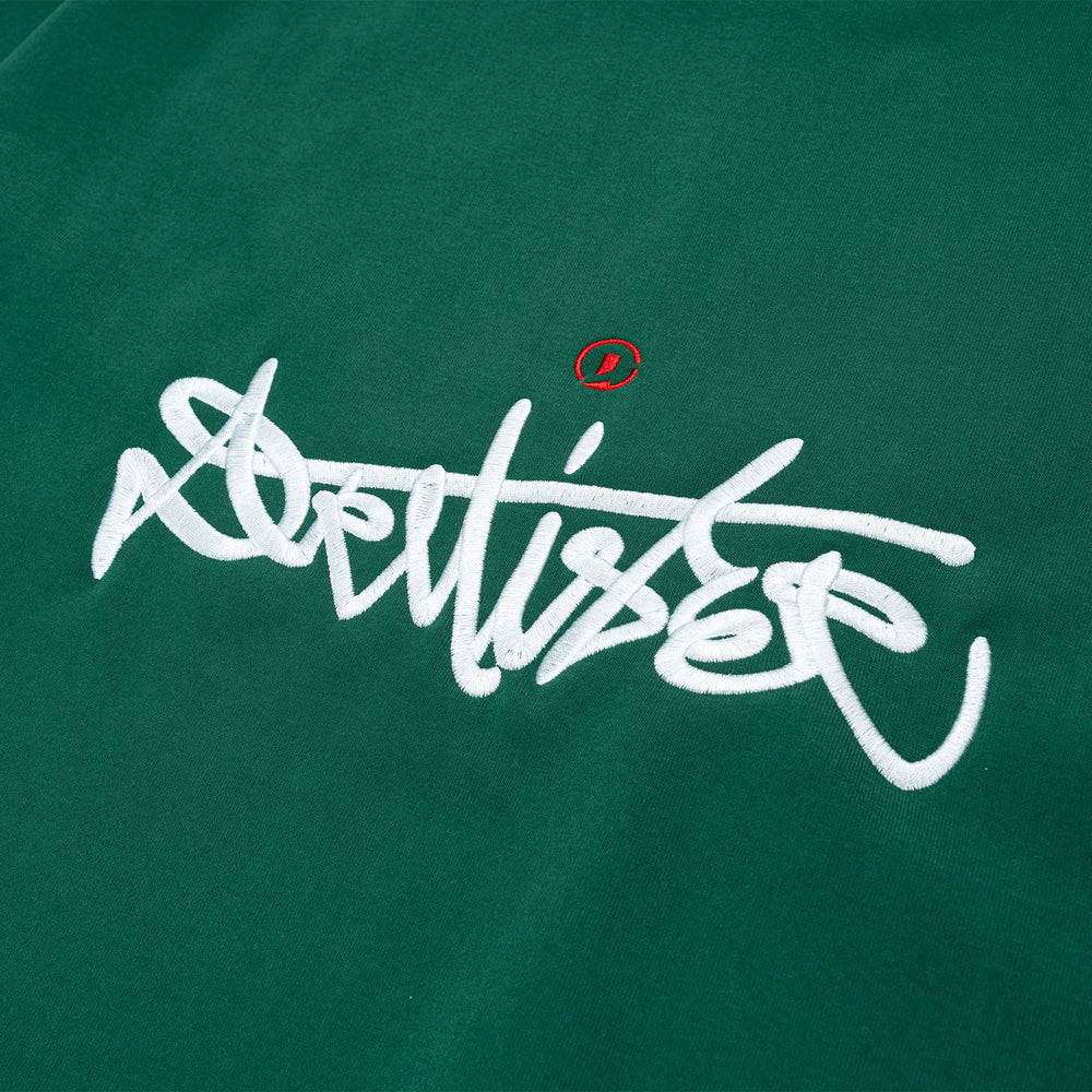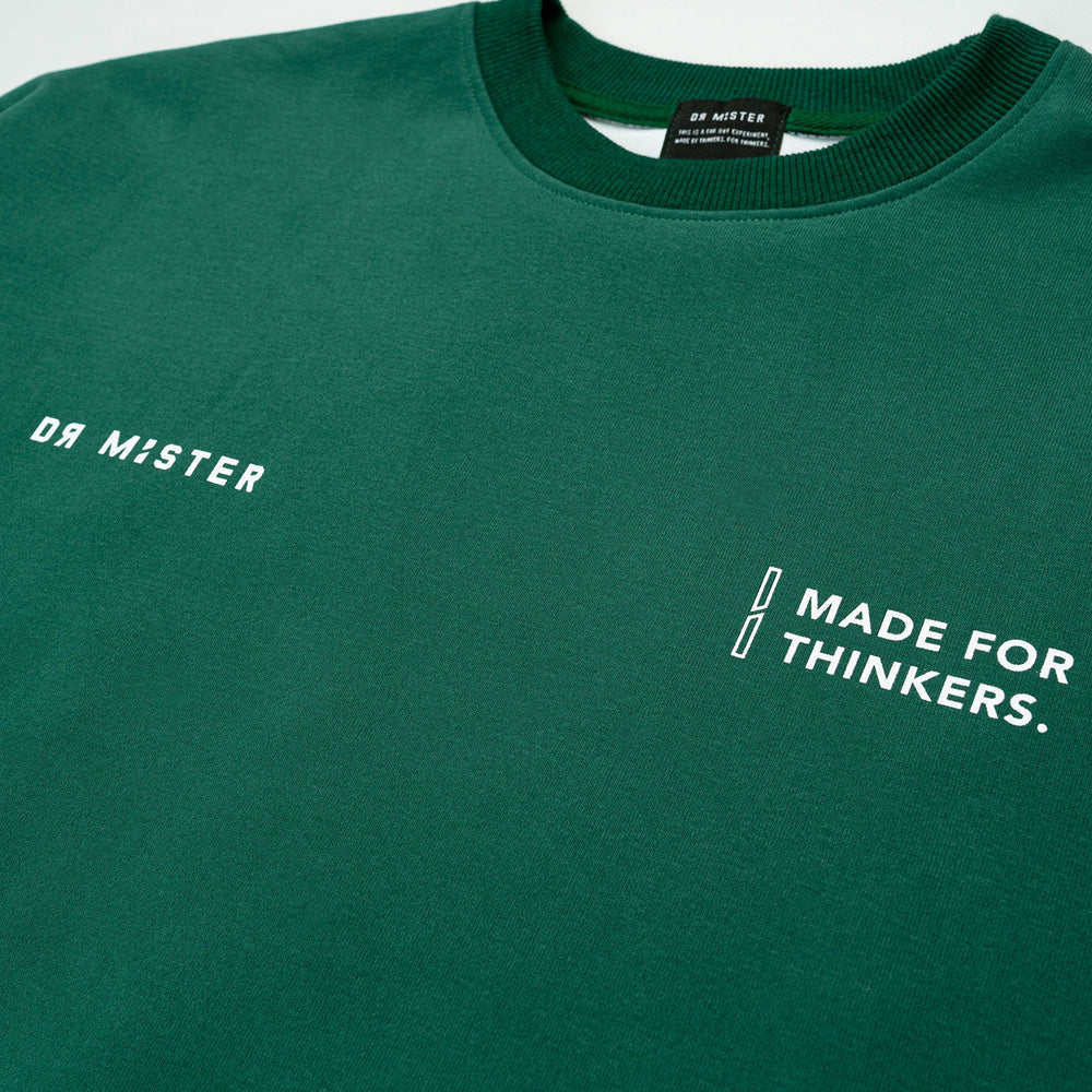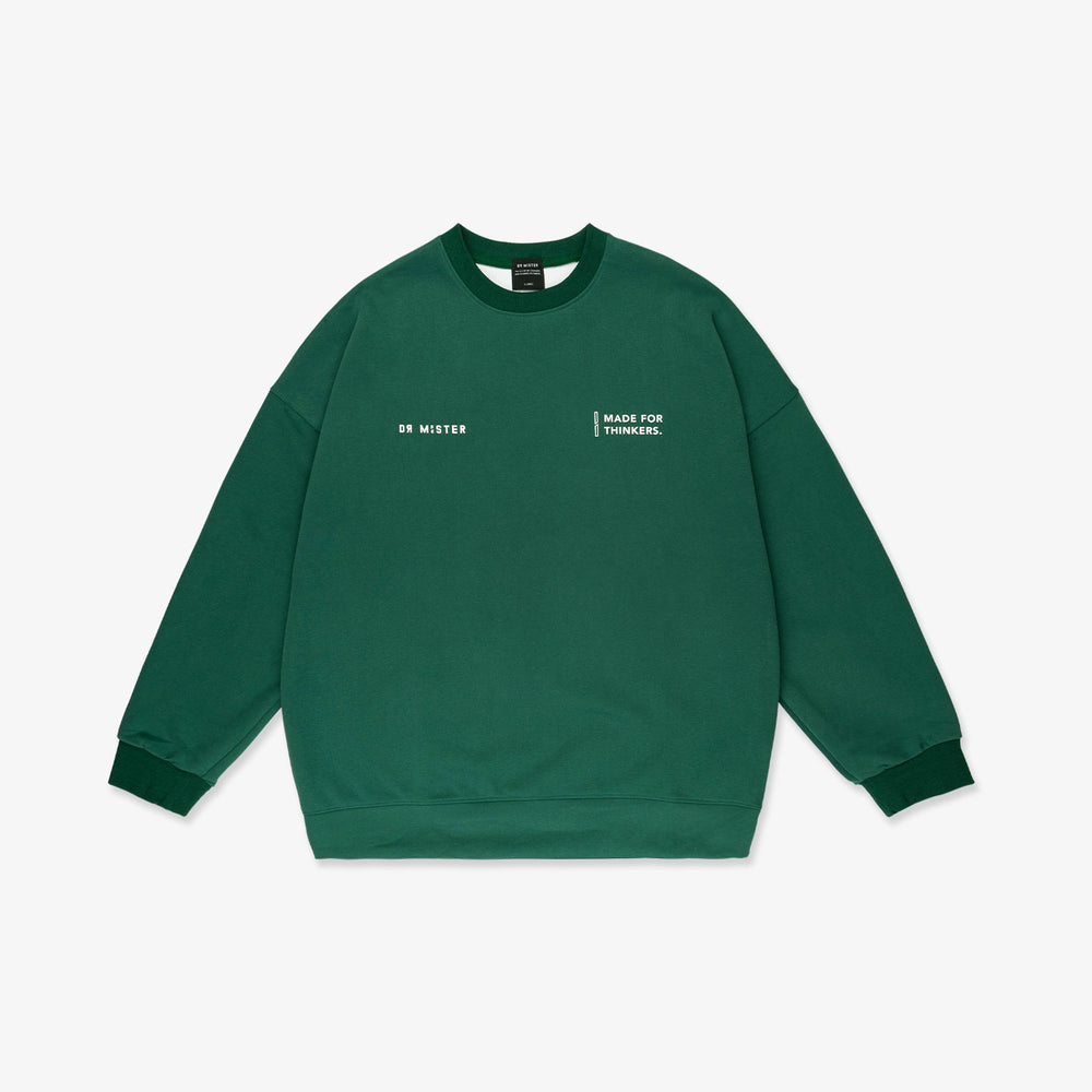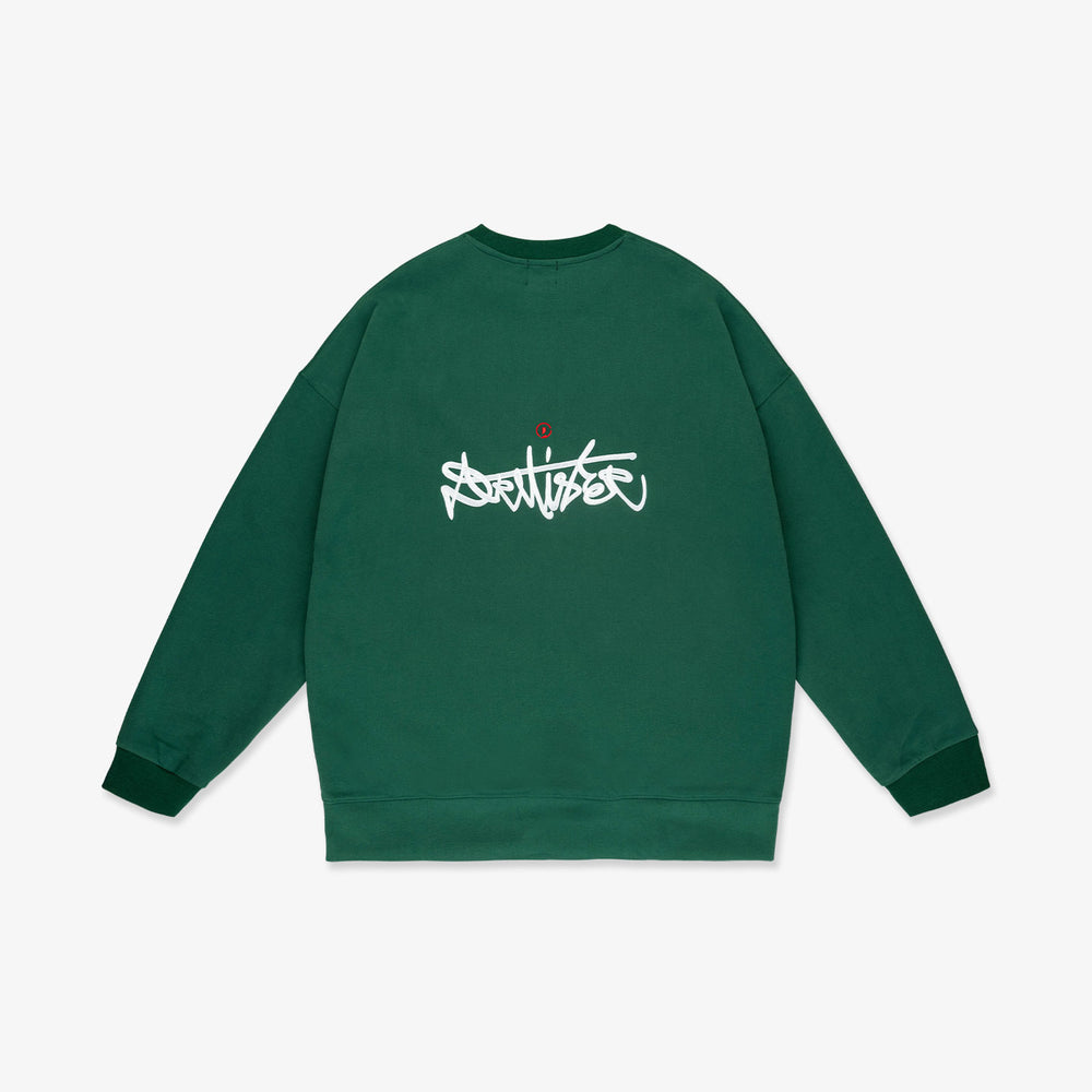 Crafted from a heavyweight 380gsm cotton-polyester blend in green, the sweatshirt features a dropped shoulder cut. The front showcases the logotype on the right, while the brand motif and slogan appear on the left. The back displays a vast horizontal signature logo in shiny white embroidery, accompanied by a tiny red embroidered graphic logo at the top.