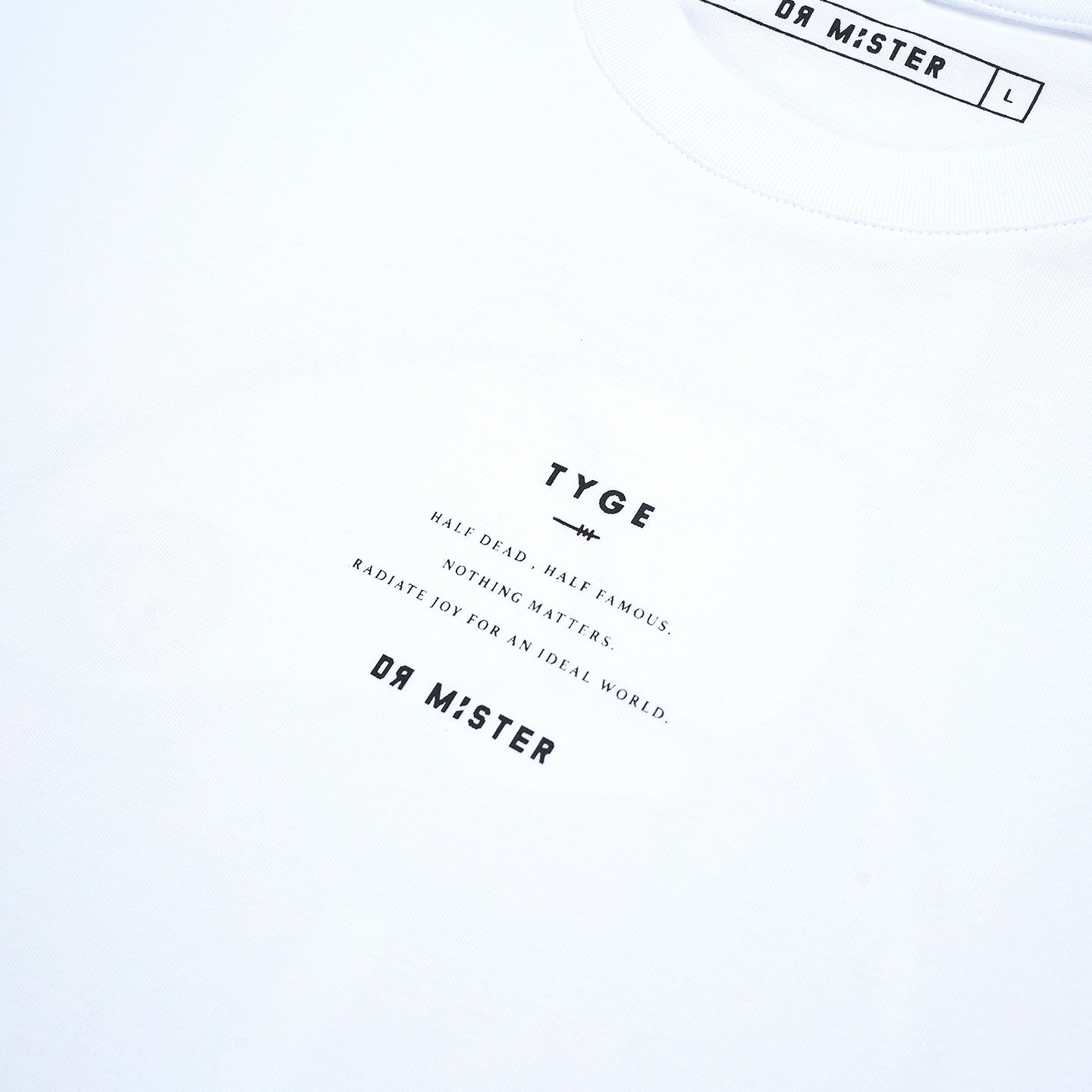 The limited edition white broad tee is made in our brand new 230gsm combed cotton. The broad tee is adorned with an oversized design at the back that combines the introductory “Tyge” character with its dissected skull graphic. The tagline for the limited Edition Tee is ‘Half Dead, Half Famous. Nothing Matters’. is arranged at the front together with the brand new “Tyge” collection tagline.