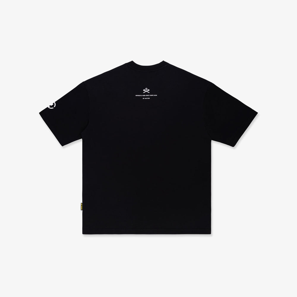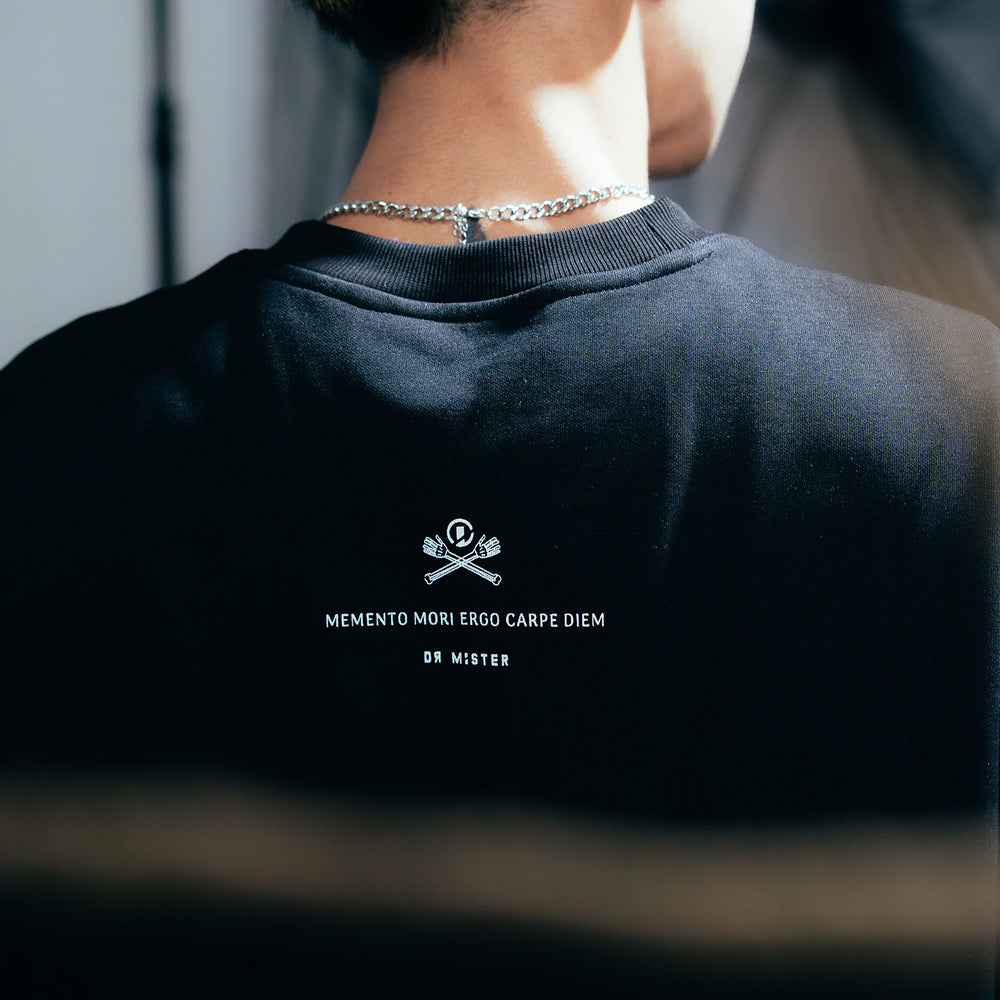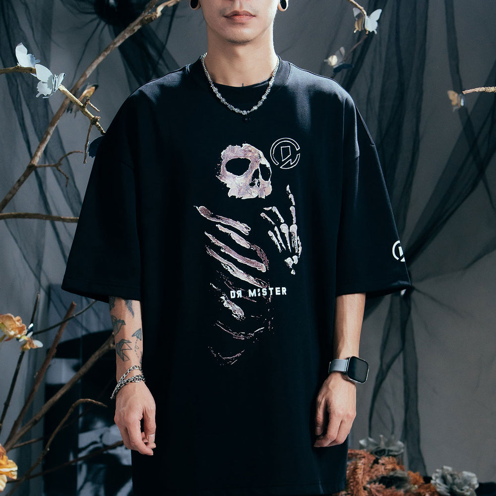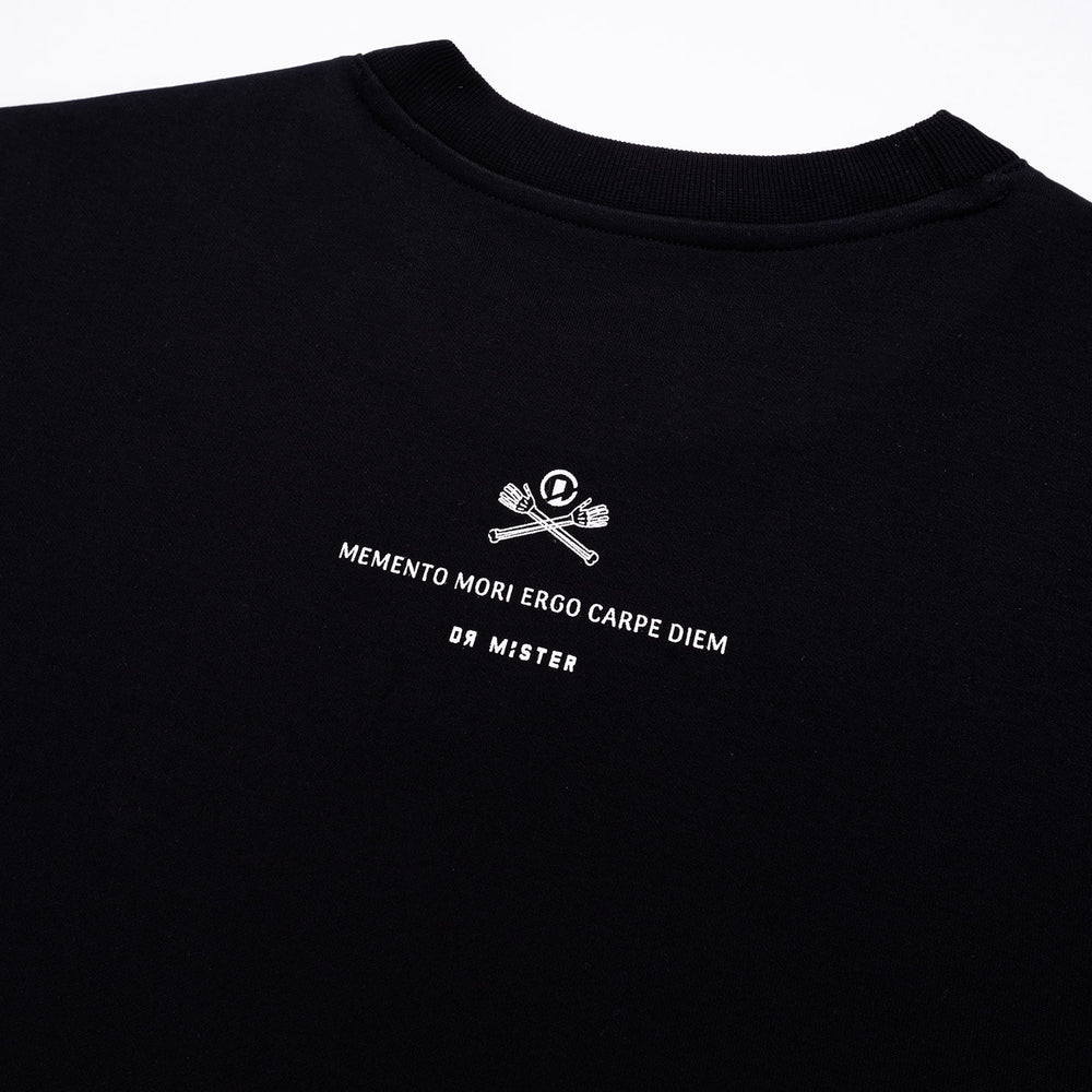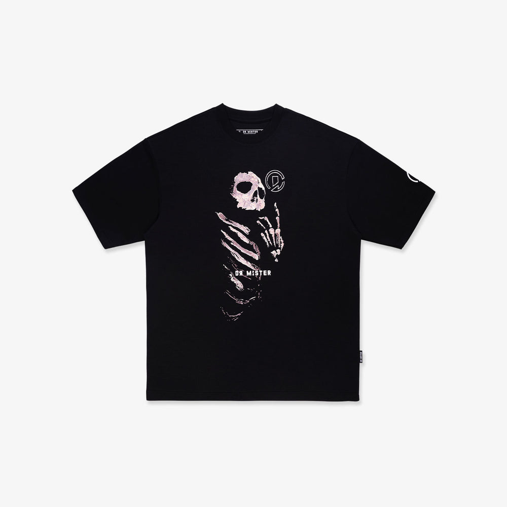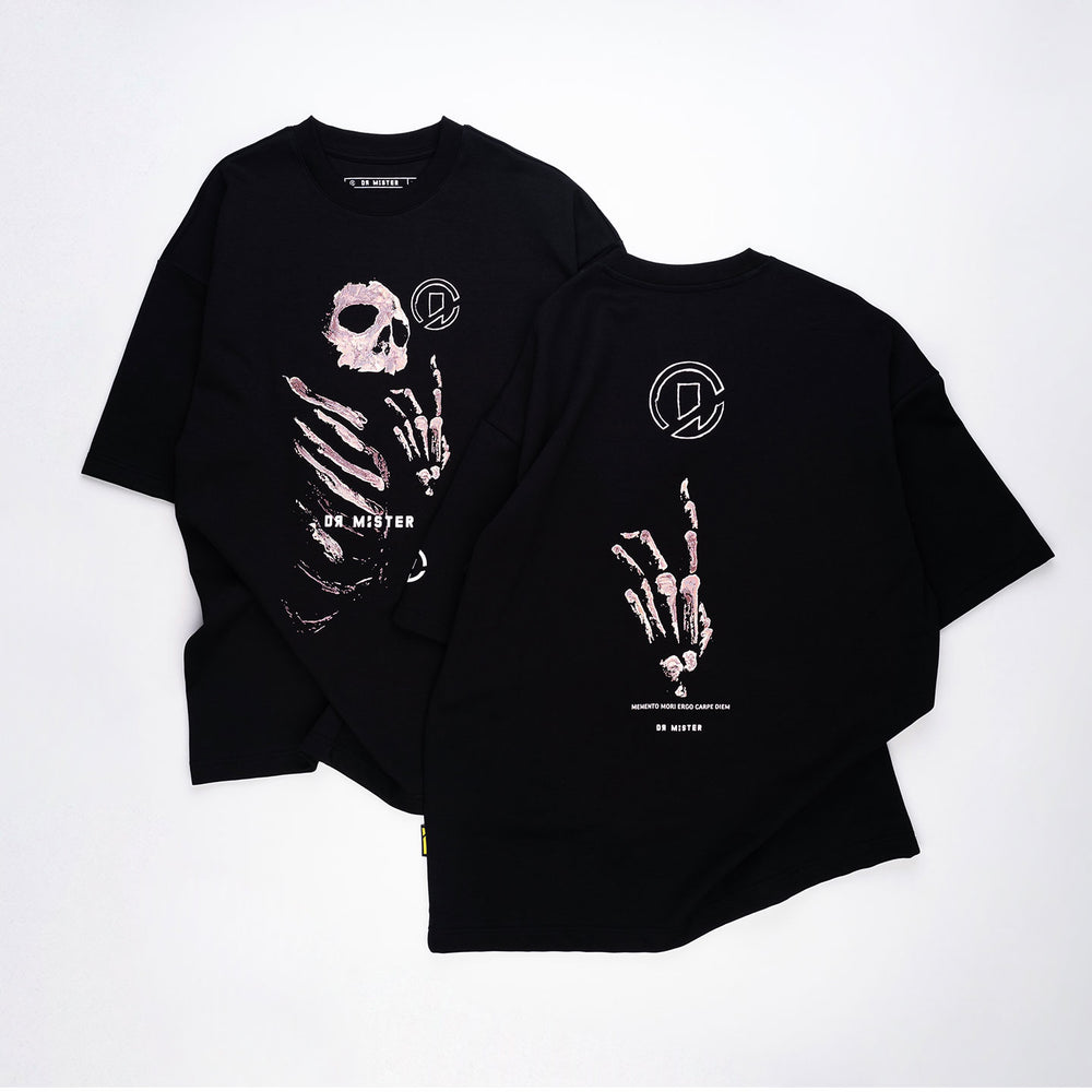This black broad tee is crafted from heavyweight cotton-polyester fabric. The main design on the front features a full skeleton body, with a hand reaching up to touch our round graphic logo, giving the appearance of igniting the "logo." The back showcases our branding along with the collection’s phrase. The round graphic logo is printed on the left sleeve.