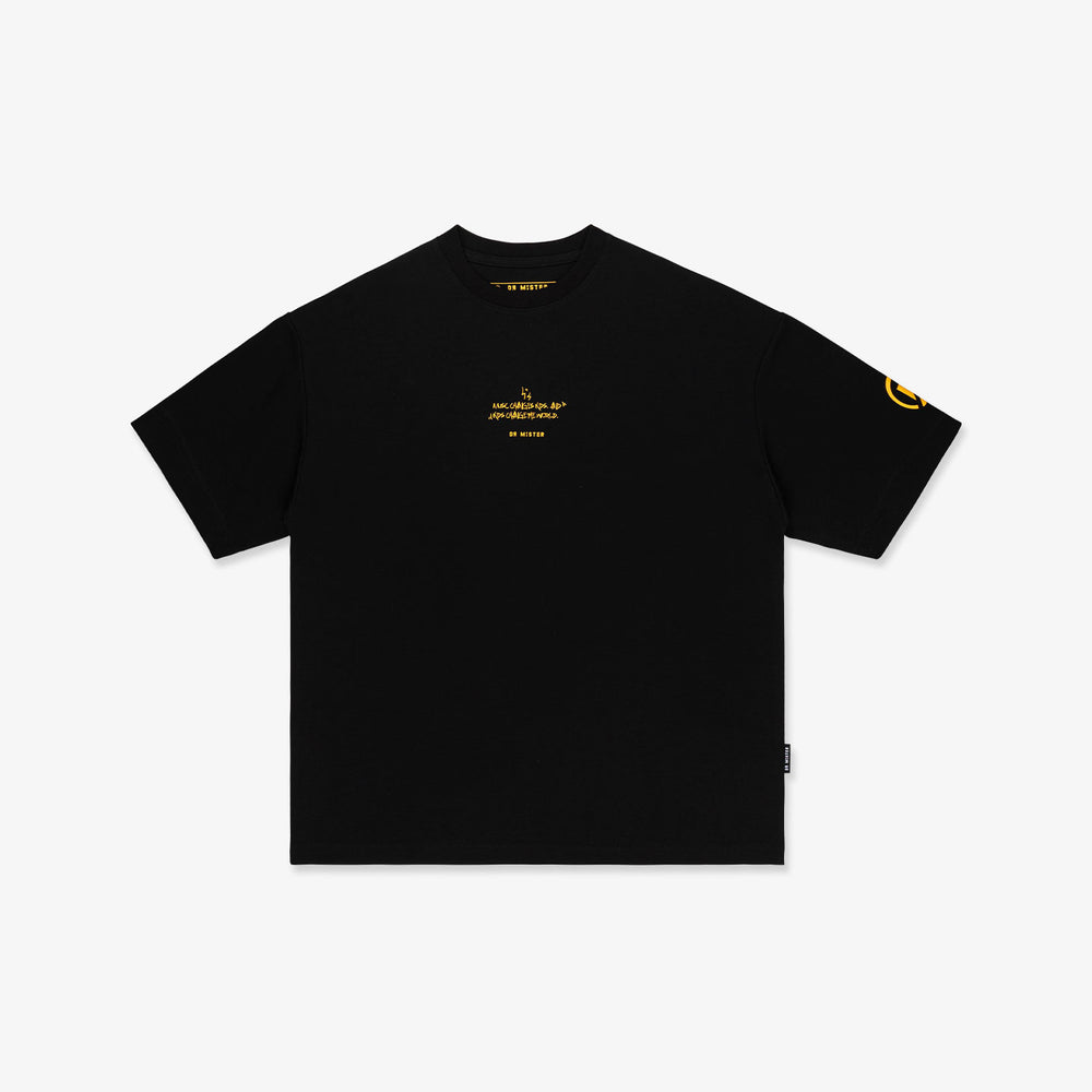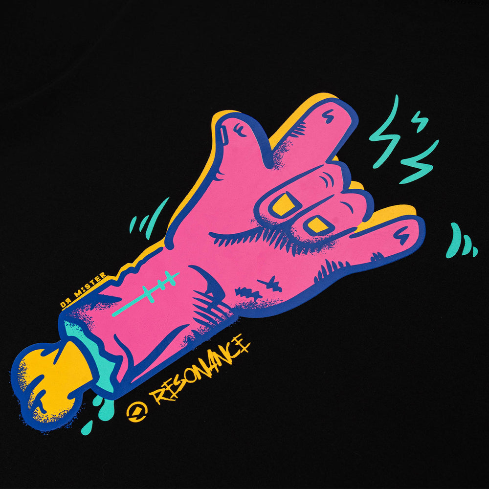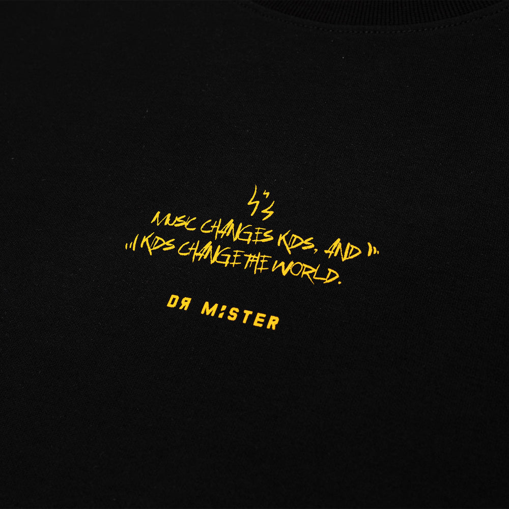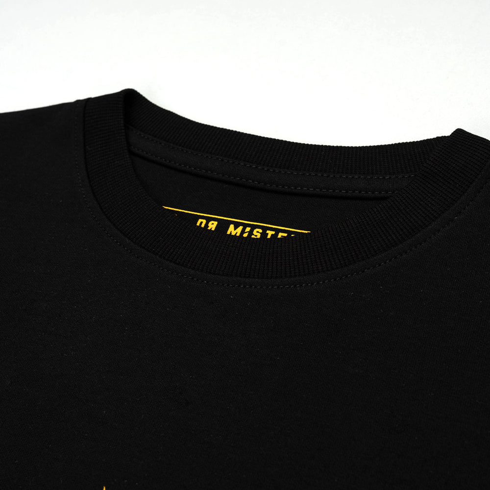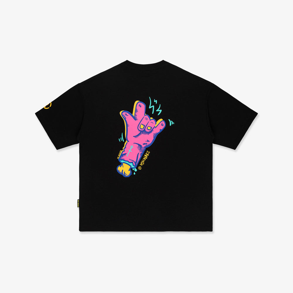Crafted from a premium cotton-polyester hybrid, this black broad tee comes in the broad oversized cut. The front showcases the collection phrase in a unique font and the brand name in classic yellow, adding a nostalgic touch. The back features a bold, colourful graphic of a severed rock hand sign, symbolizing an eternal love for music.