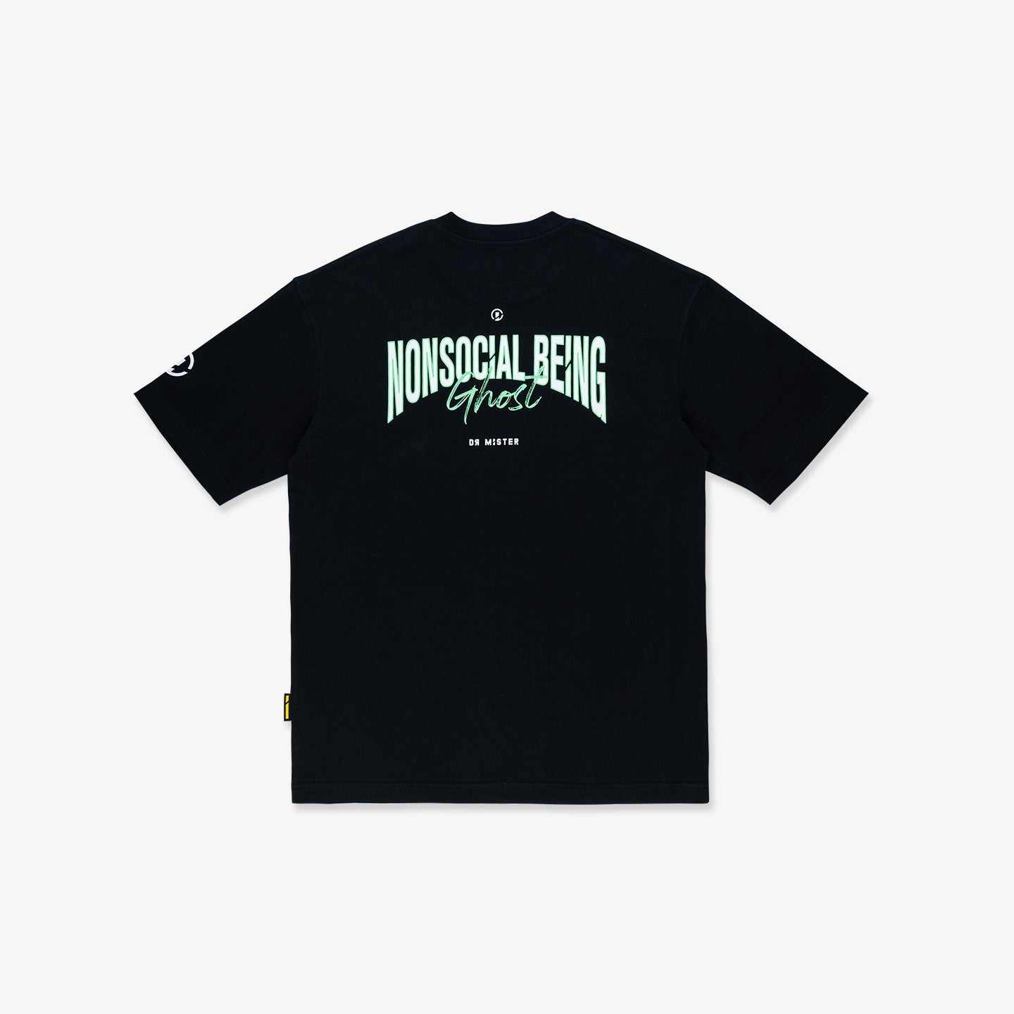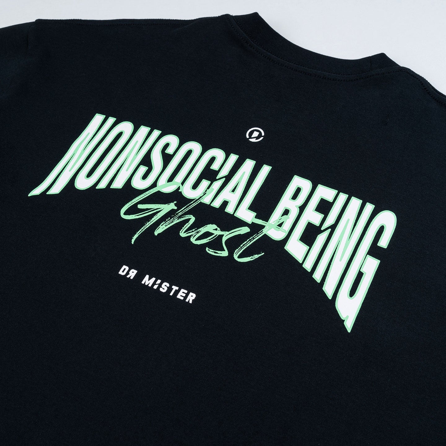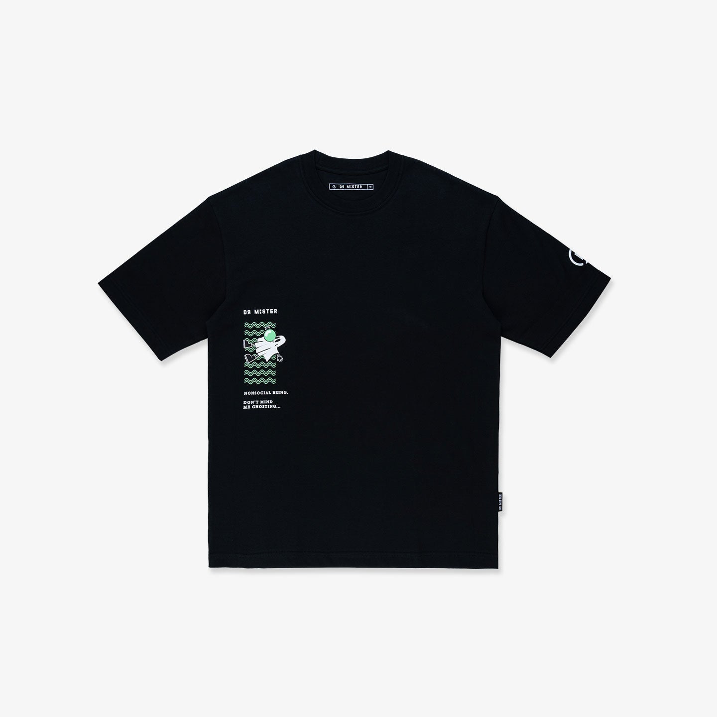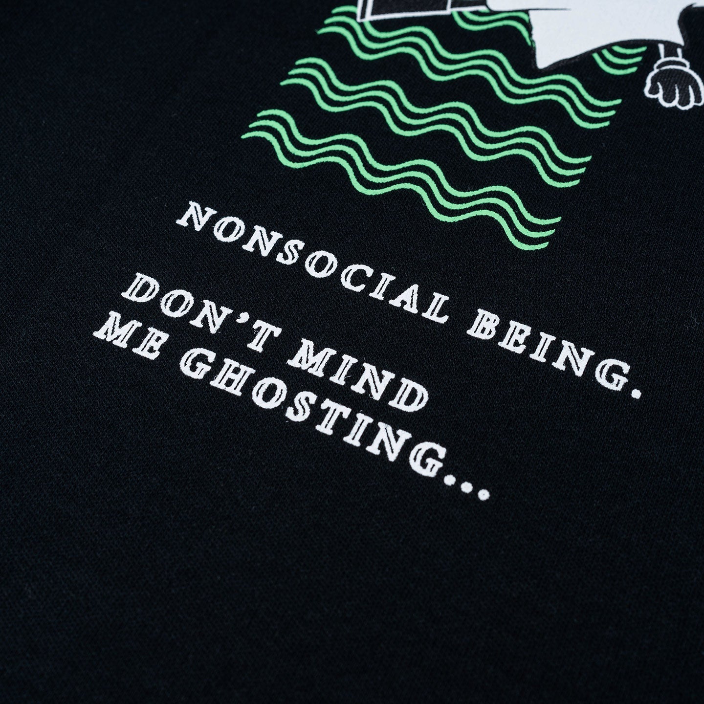 Black cotton oversized tee printed with a floating sheet ghost, printed with the collection dialogue “Don’t mind me ghosting”. The back is printed with a college-inspired “Nonsocial being” Type overlapped with a scripted word - “Ghost”. Made with our signature interlock cotton fabric, heavily blend yet breathable.