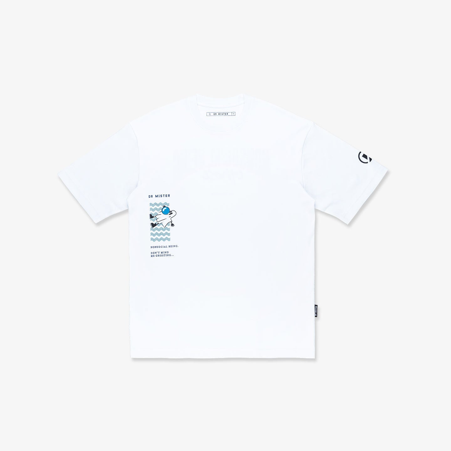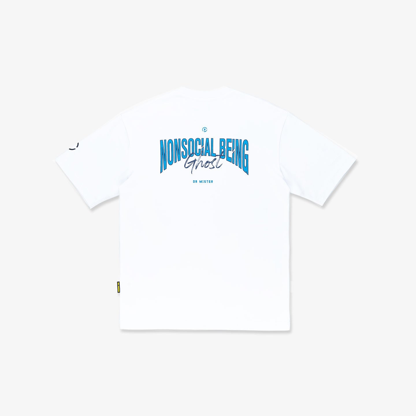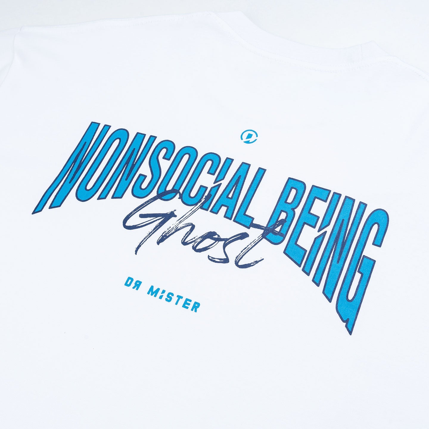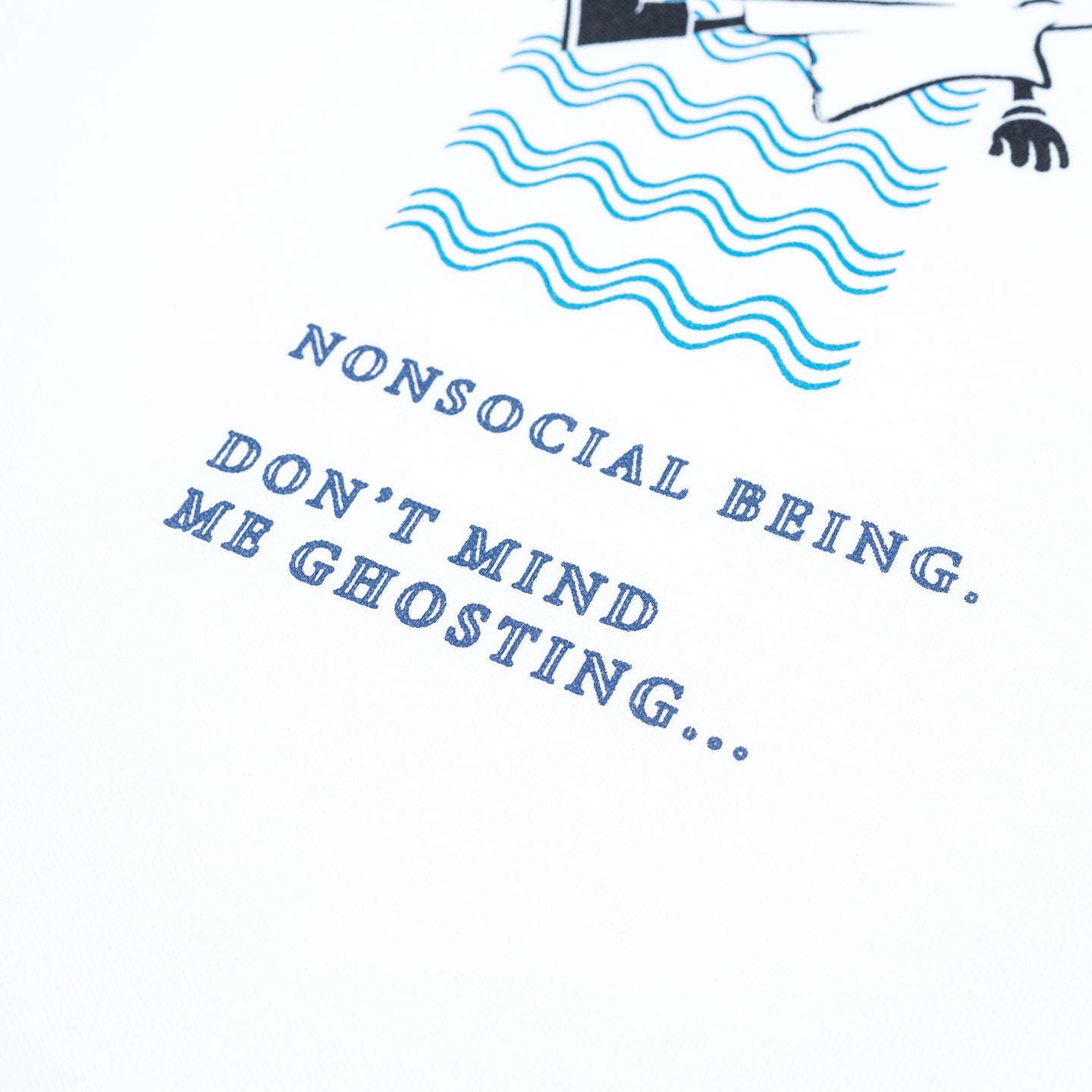 White cotton oversized tee printed with a floating sheet ghost, printed with the collection dialogue “Don’t mind me ghosting”. The back is printed with a college-inspired “Nonsocial being” Type overlapped with a scripted word - “Ghost”. Made with our signature interlock cotton fabric, heavily blend yet breathable.