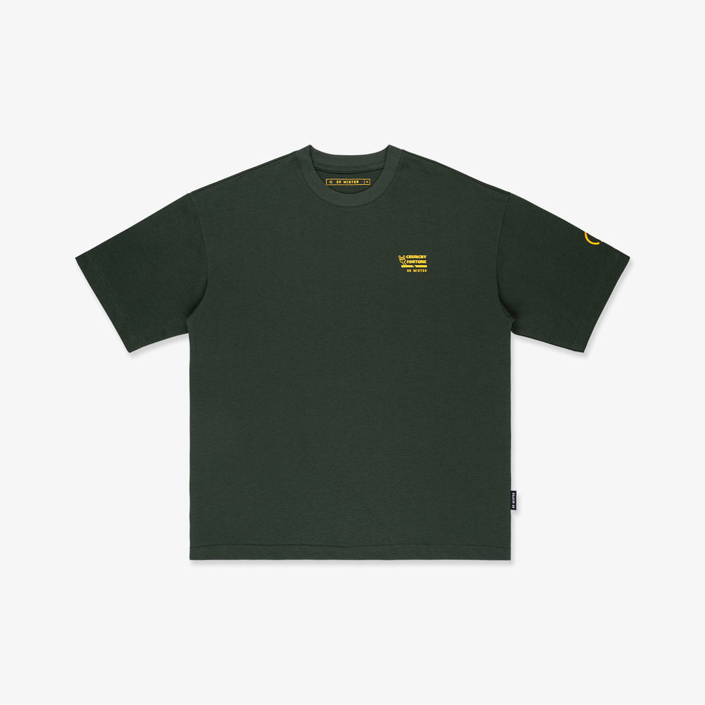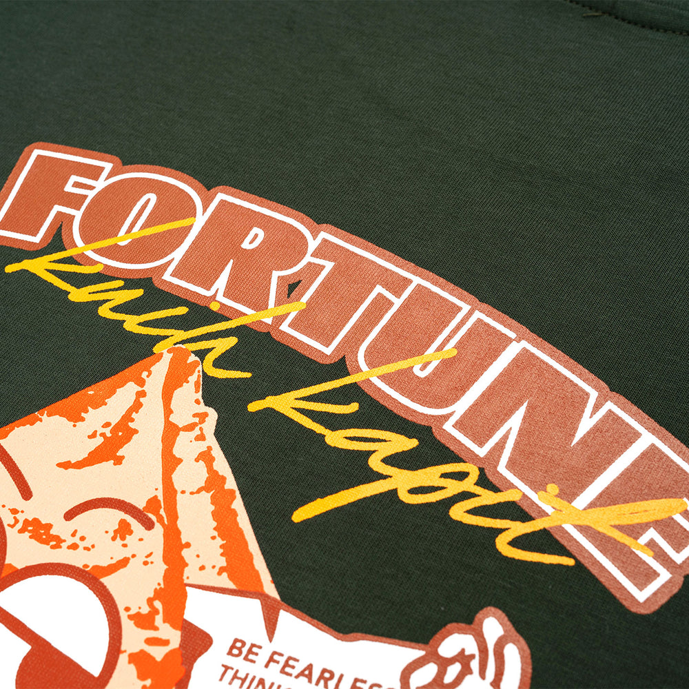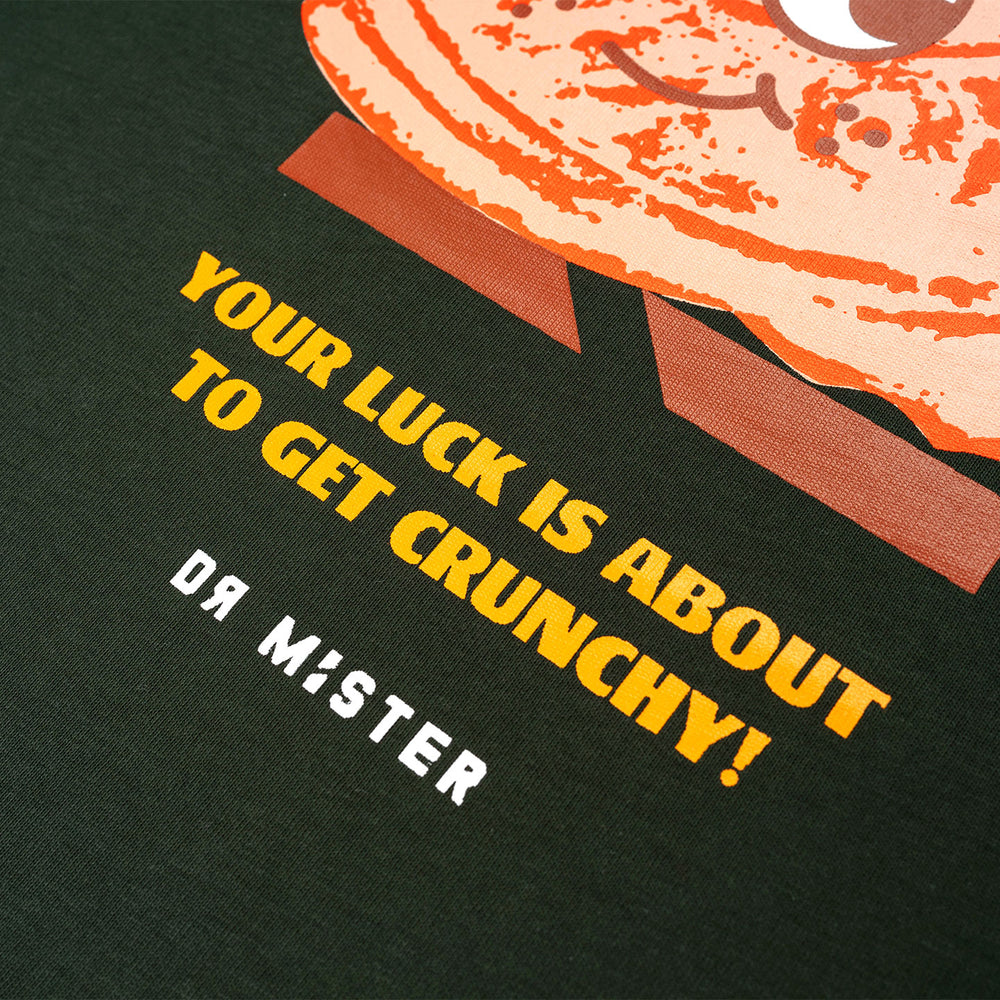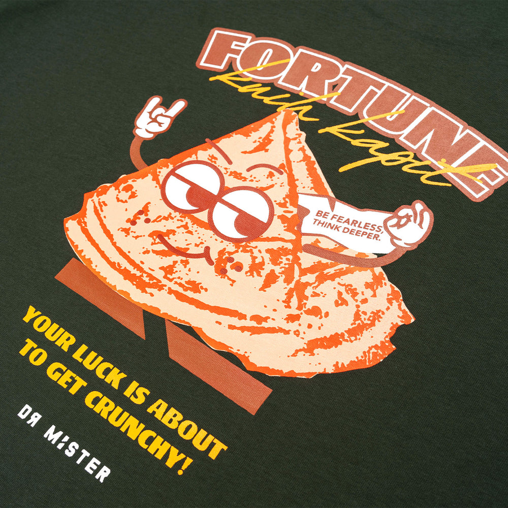 Cut from high-quality interlock combed cotton fabric, the pine green loose tee offers a lively graphic of Kuih Kapit with a fortune message to “Be Fearless, Think Deeper” The graphic is paired with the tee’s name in multiple fonts and the tagline, “Your luck is about to get crunchy!” The front showcases a rock hand sign logo, brand motif, and “Crunchy Fortune” above the logo.