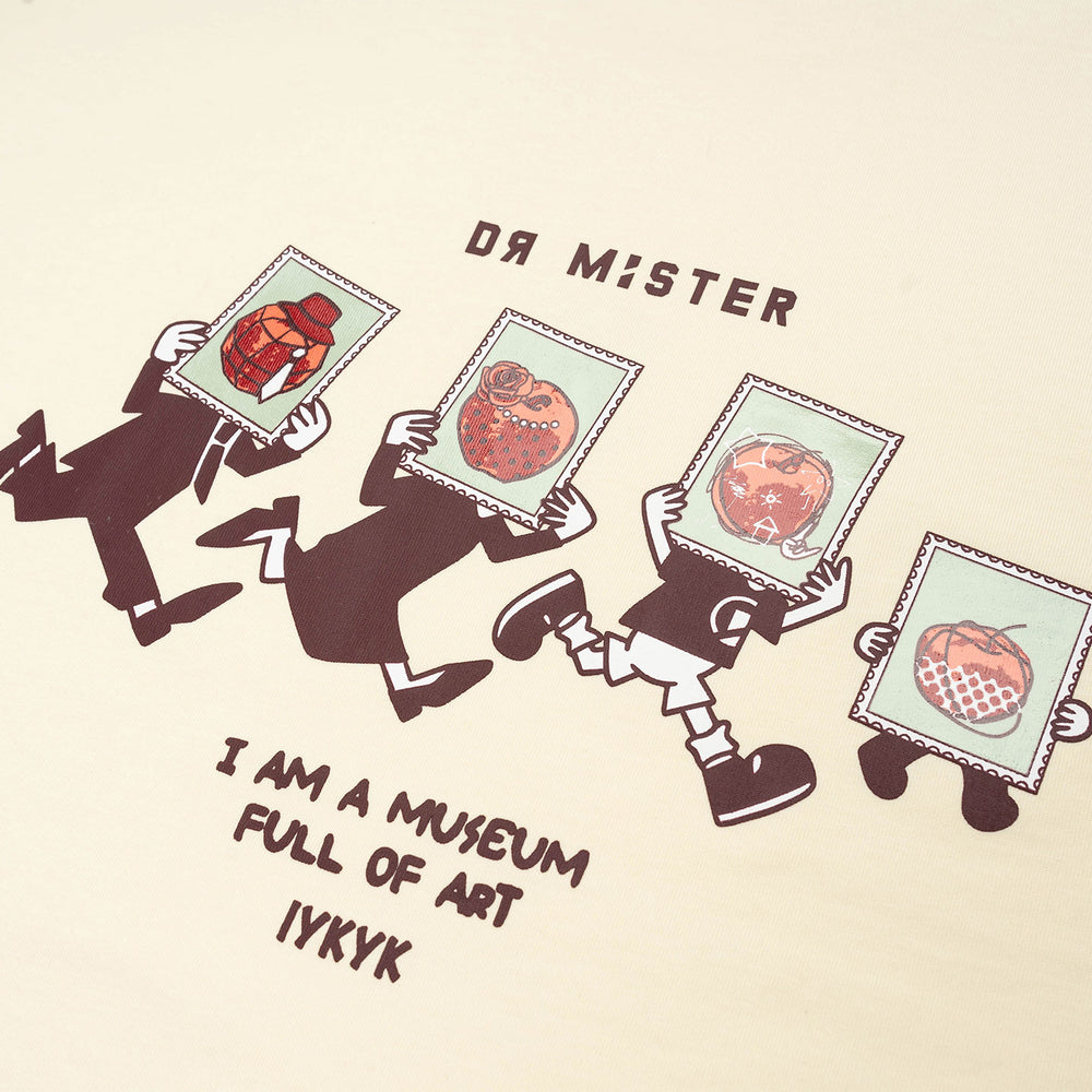Made from interlock cotton, this cream yellowbroad tee features an apple graphic with its net and the tagline “I am a museum full of art” on the front. The back showcases a family holding art frames of apples, accompanied by the same slogan and the abbreviation “IYKYK” (If You Know, You Know), along with the brand’s logotype.