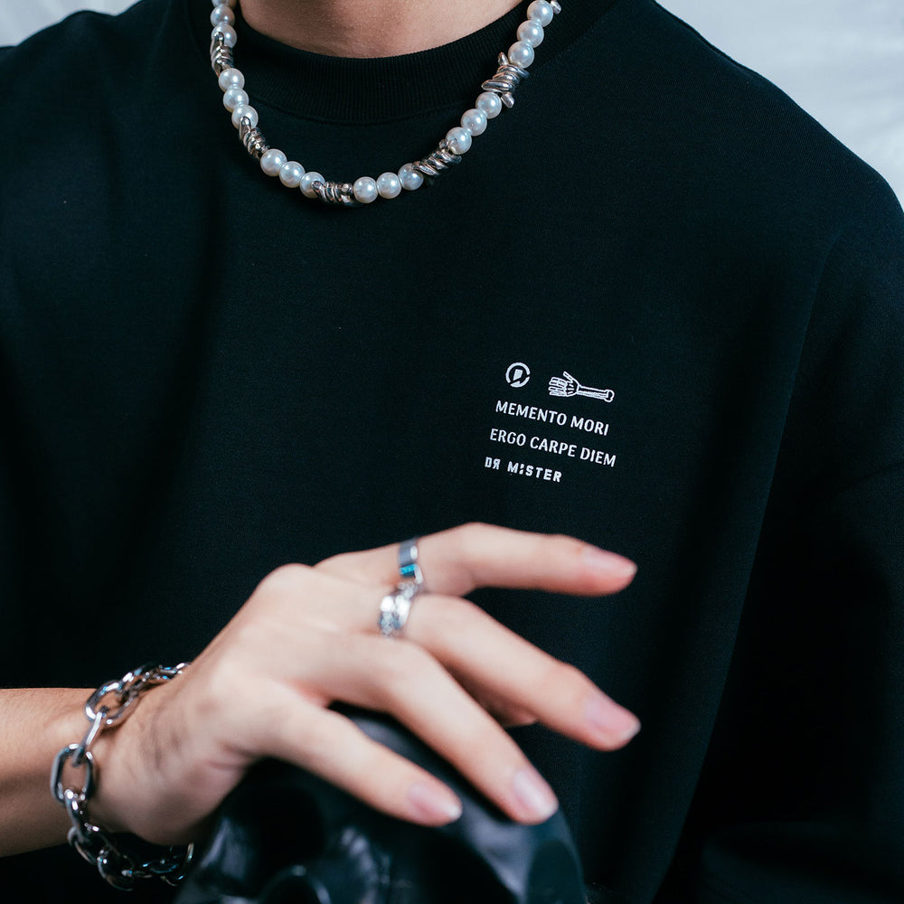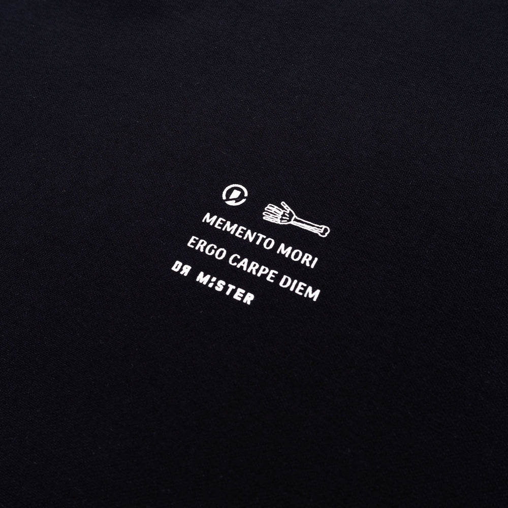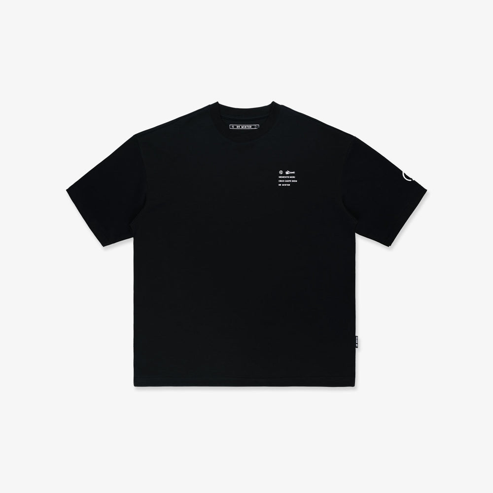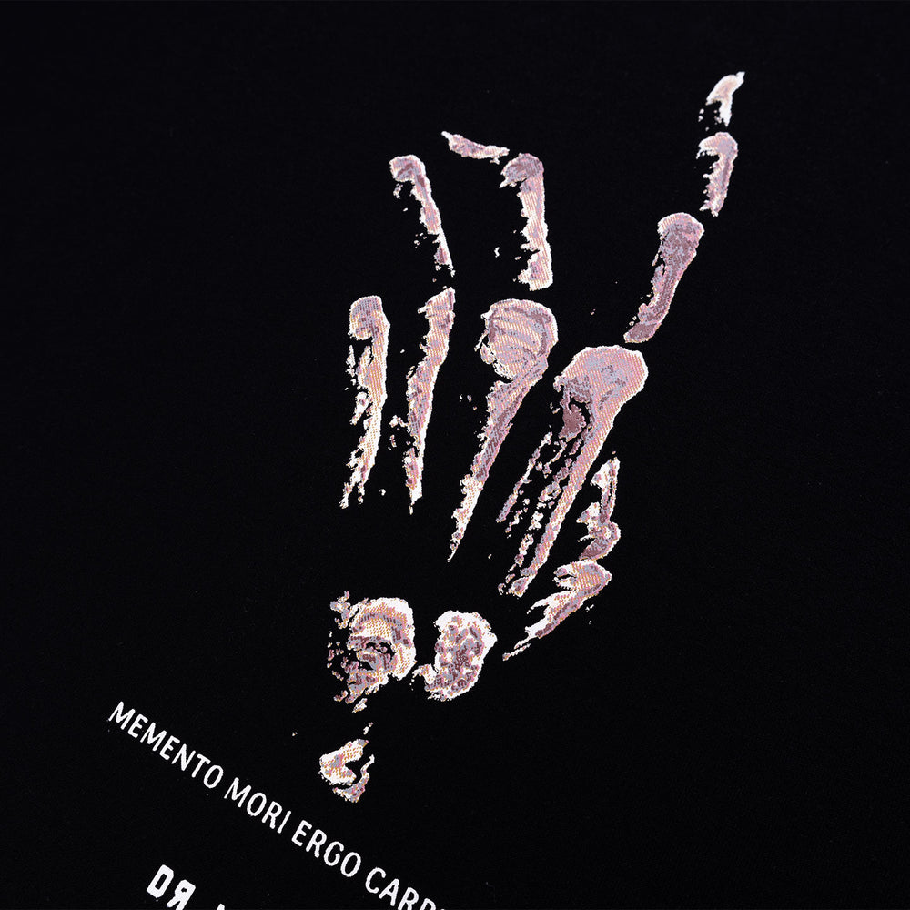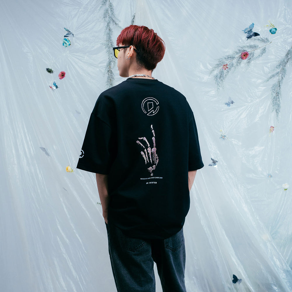This black, broad tee is crafted from a heavyweight cotton-polyester blend fabric. The standout design on the back features a skeleton hand touching our circular graphic logo, which resembles an igniting “logo.” The front boasts our branding and the collection's phrase. The round graphic logo is also printed on the left sleeve.