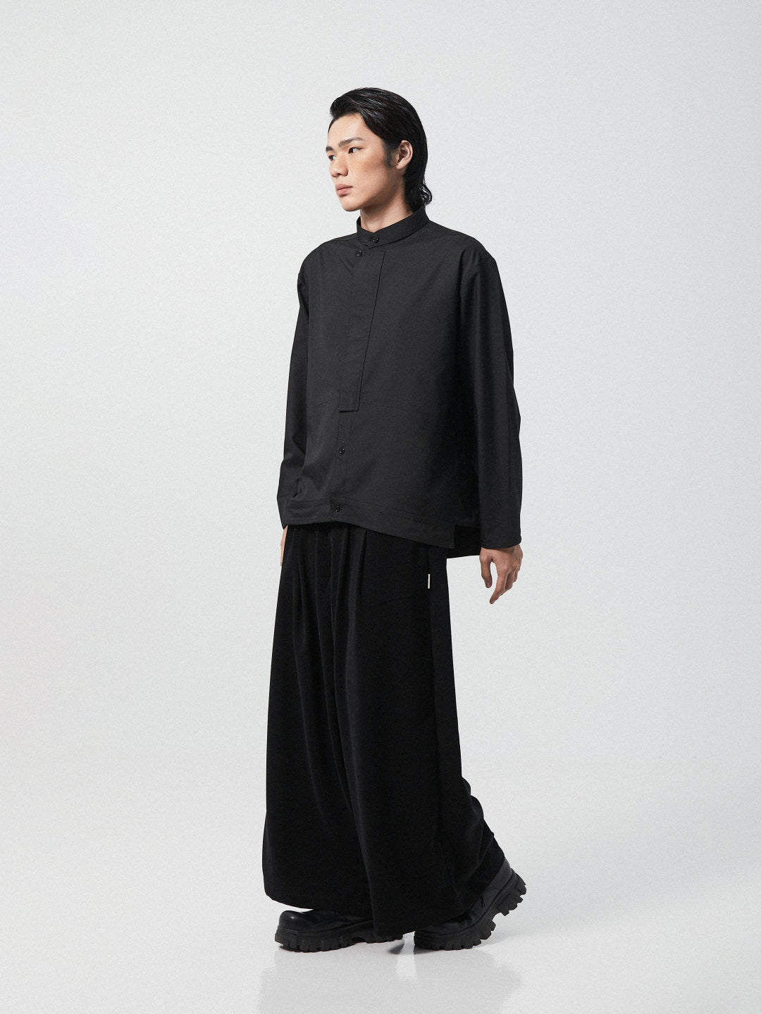 This oriental collar long sleeve shirt, crafted from poly lycra, exudes modern sophistication with its unique flap button tape design and sleek slim fit cut. The addition of a hem add-on elevates its style, while two side pockets offer practicality. Combining comfort and elegance, this shirt is a versatile wardrobe staple for those seeking both fashion-forward design and functionality.