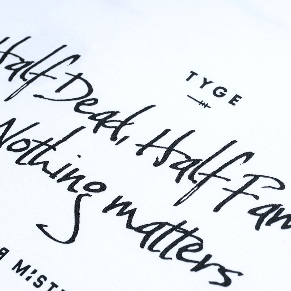 The white tee has been refined to a lighter 300gsm for improved breathability and comfort, and with the new dropped box cut. The tee features our signature dissected half-skull, half Tyge in full embroidery with a refreshed colour outline. The back showcases an oversized tagline alongside our logotype.
