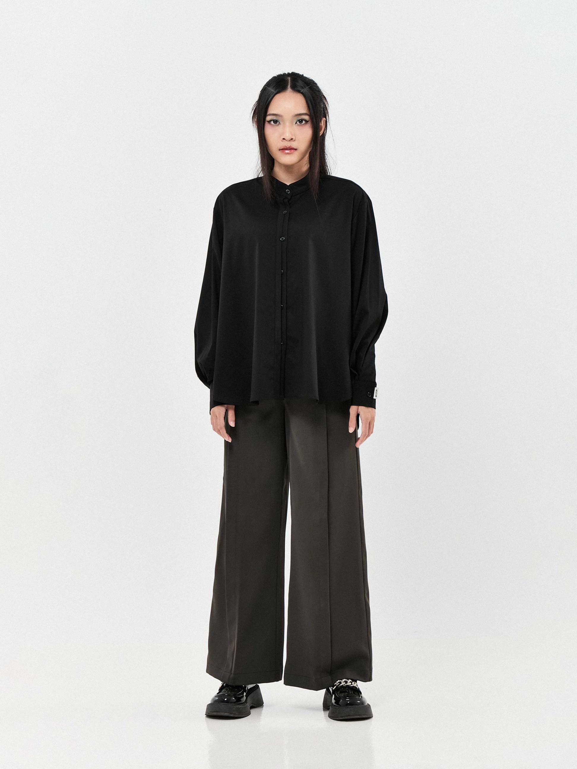 The Office Bow Long Sleeve Shirt features a chic bow collar, balloon sleeves, and a half-covered button tape for a relaxed office look. Back cutlines add subtle structure to this effortlessly stylish piece.