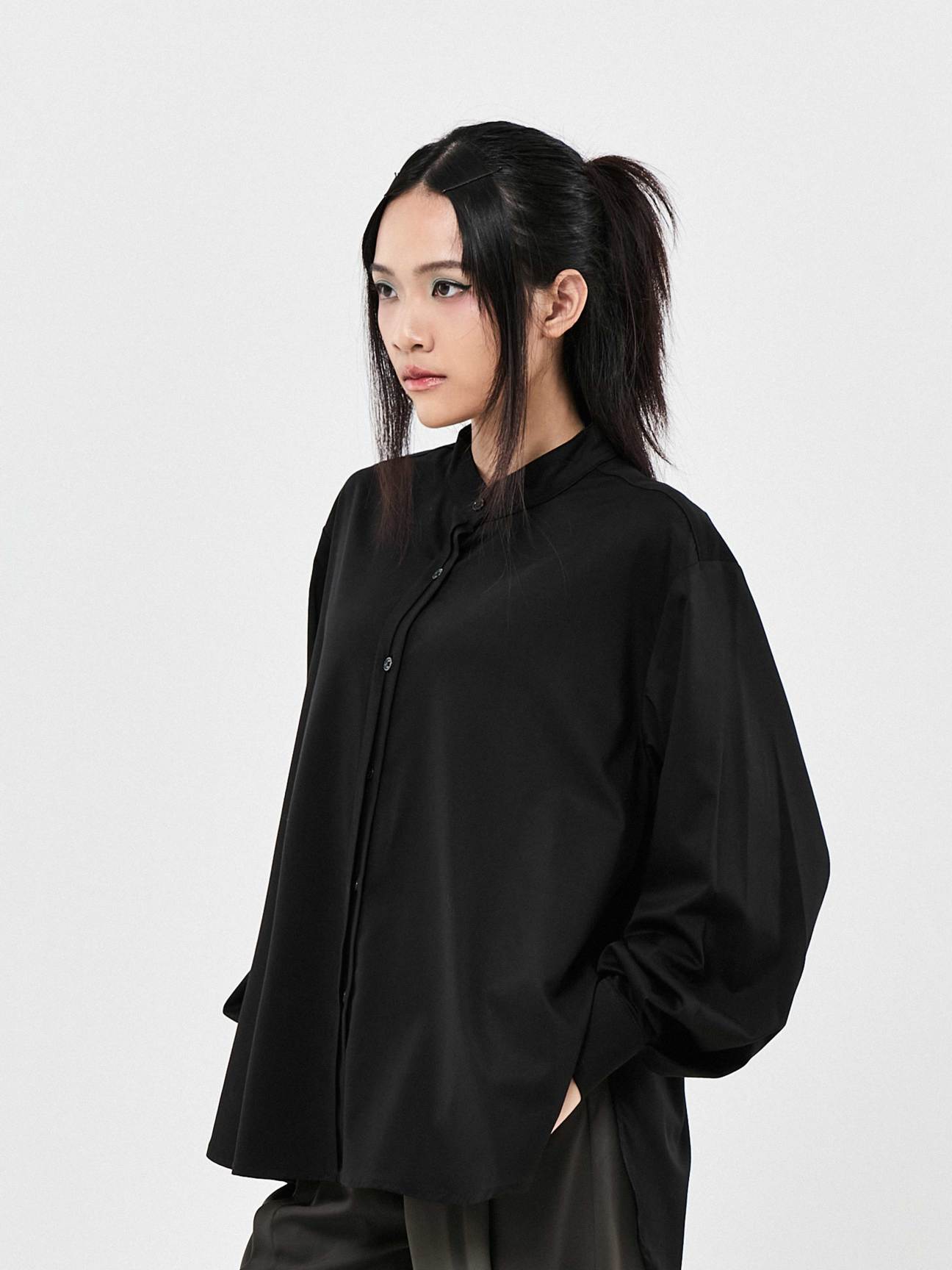 The Office Bow Long Sleeve Shirt features a chic bow collar, balloon sleeves, and a half-covered button tape for a relaxed office look. Back cutlines add subtle structure to this effortlessly stylish piece.