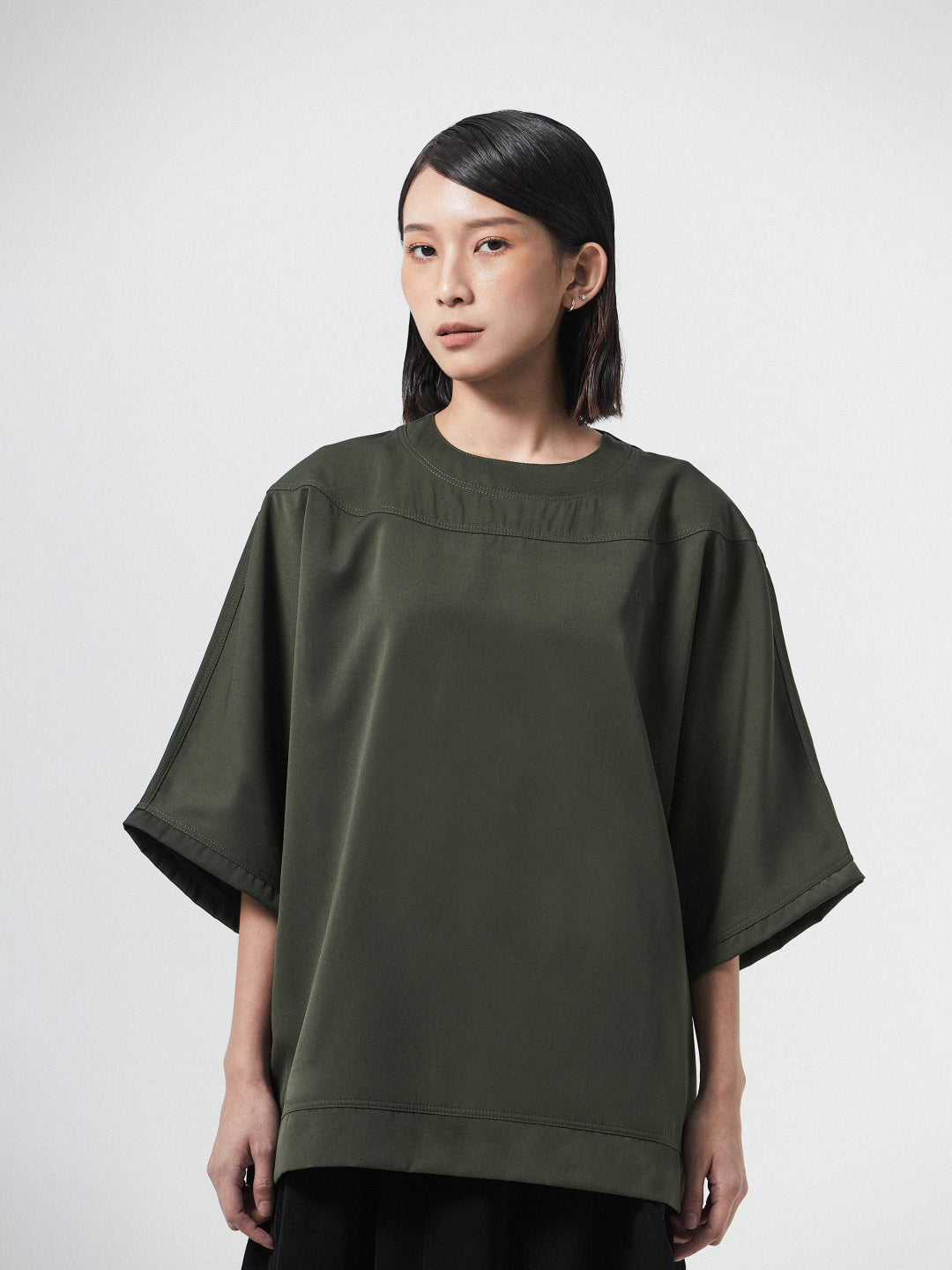 Crafted from mafela fabric, this oversized pattern tee showcases a contemporary flair with an upper chest cutline and a back placket adorned with a single button. Its distinctive butterfly-cut armholes add whimsy, complemented by subtle logo embroidery for branding. With side slits enhancing mobility and style, this tee effortlessly combines comfort and trendiness for a standout wardrobe essential