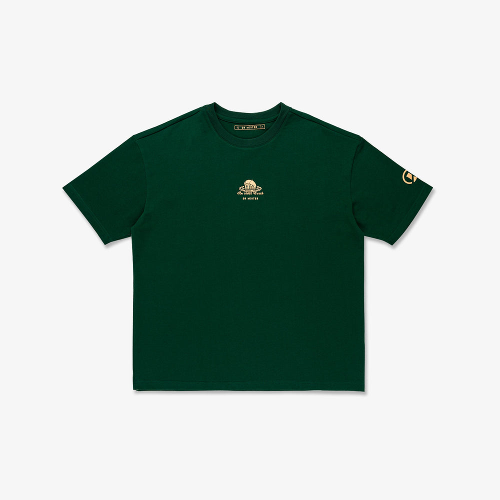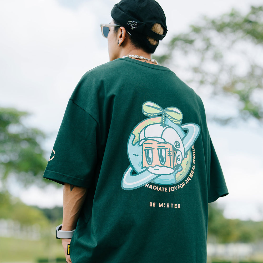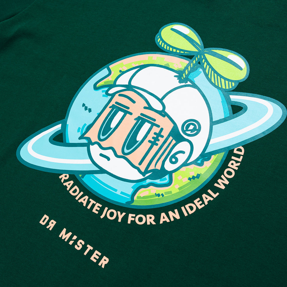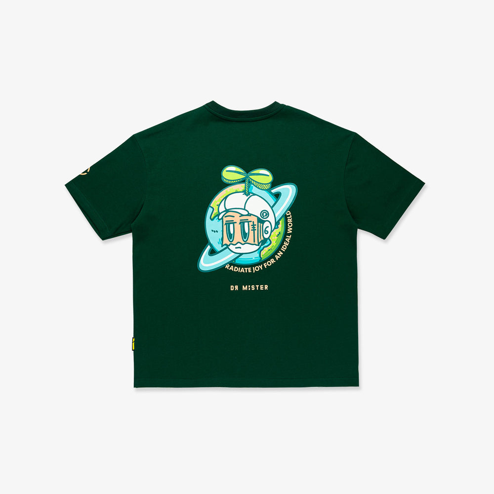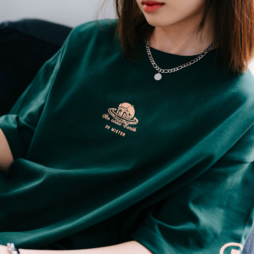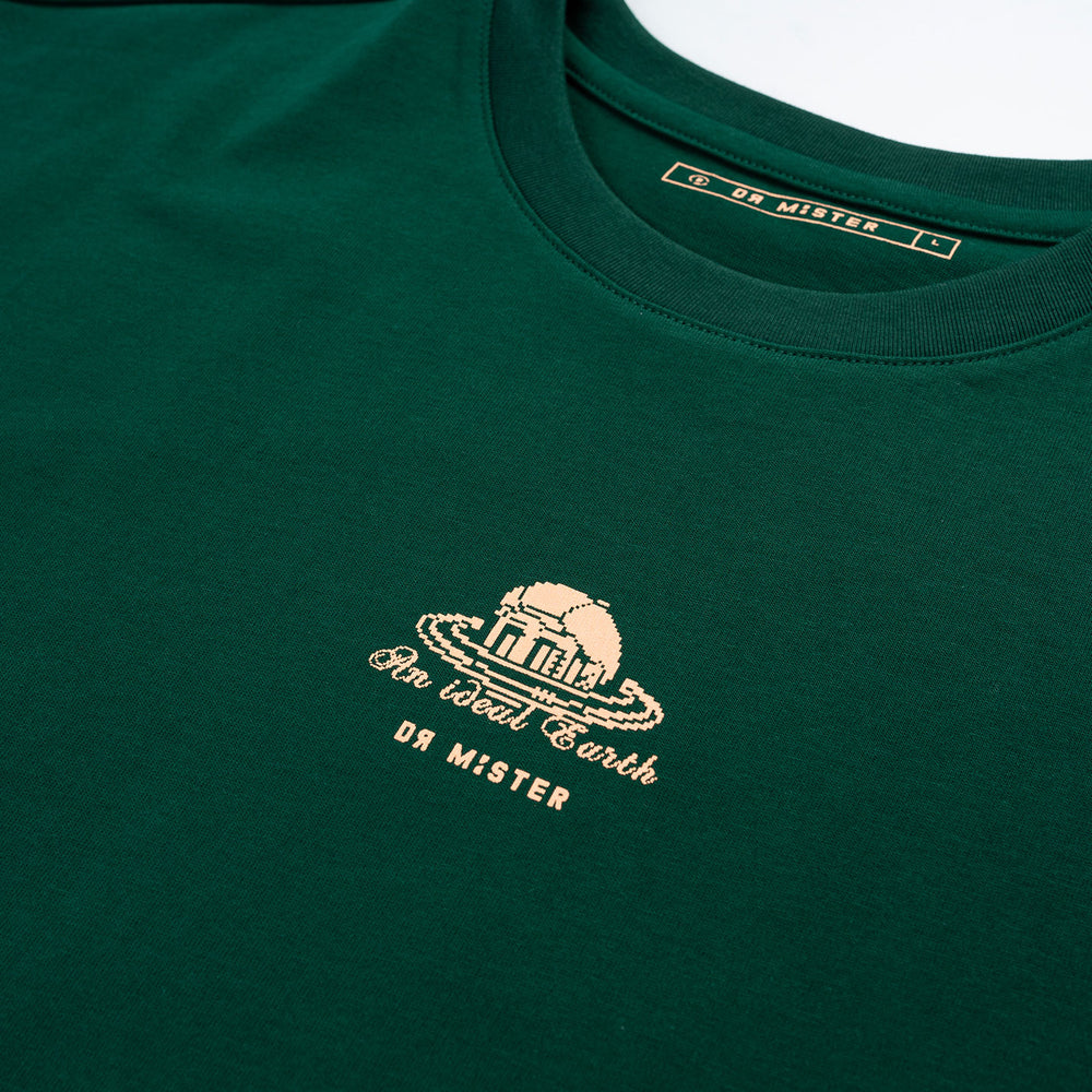 Pine Green Broad tee created with weighted combed cotton, printed at the back with the Tyge in sprout form layering with planet earth at the back. The front features a pixelated and minimal graphic with the word “An Ideal Earth” The usual round graphic logo on left sleeve.