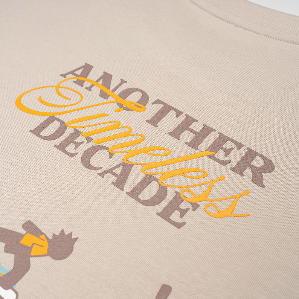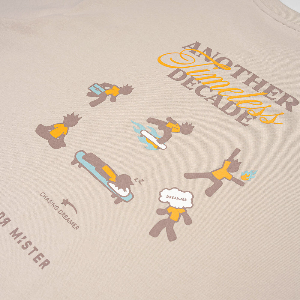Crafted in a broad cut fit, the pre-washed beigetee features a playful graphic of a spiky-haired character walking across a flying star, alongside the brand's logotype. The back displays the same character going through his routine in a grid layout, topped with the anniversary slogan and finished with a mini flying star graphic and “CHASING DREAMER” typography.