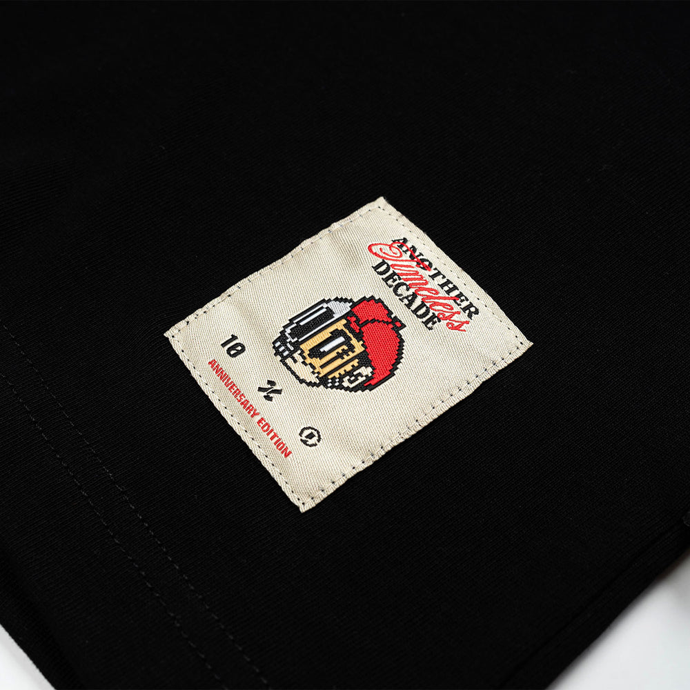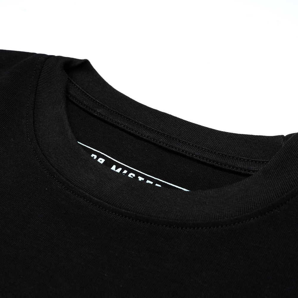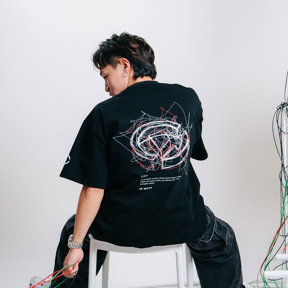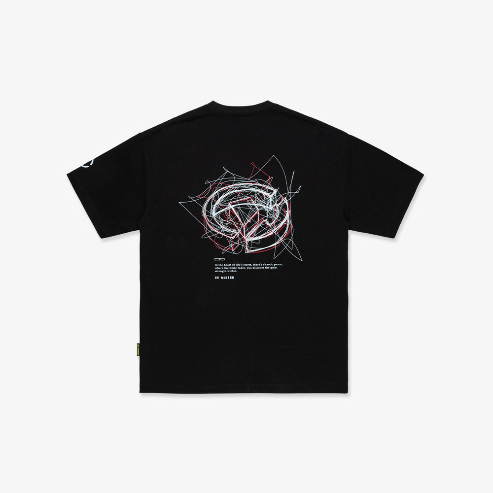 Made from heavyweight cotton, the tee is available in black colorways. The back features a central print of a scribbled 3D graphic logo in a two-toned design, positioned above the tagline “In the heart of life’s storm, there’s chaotic peace; where the noise fades, you discover the quiet strength within” and a brand motif. The front features a minimal scribbled 2D graphic logo.