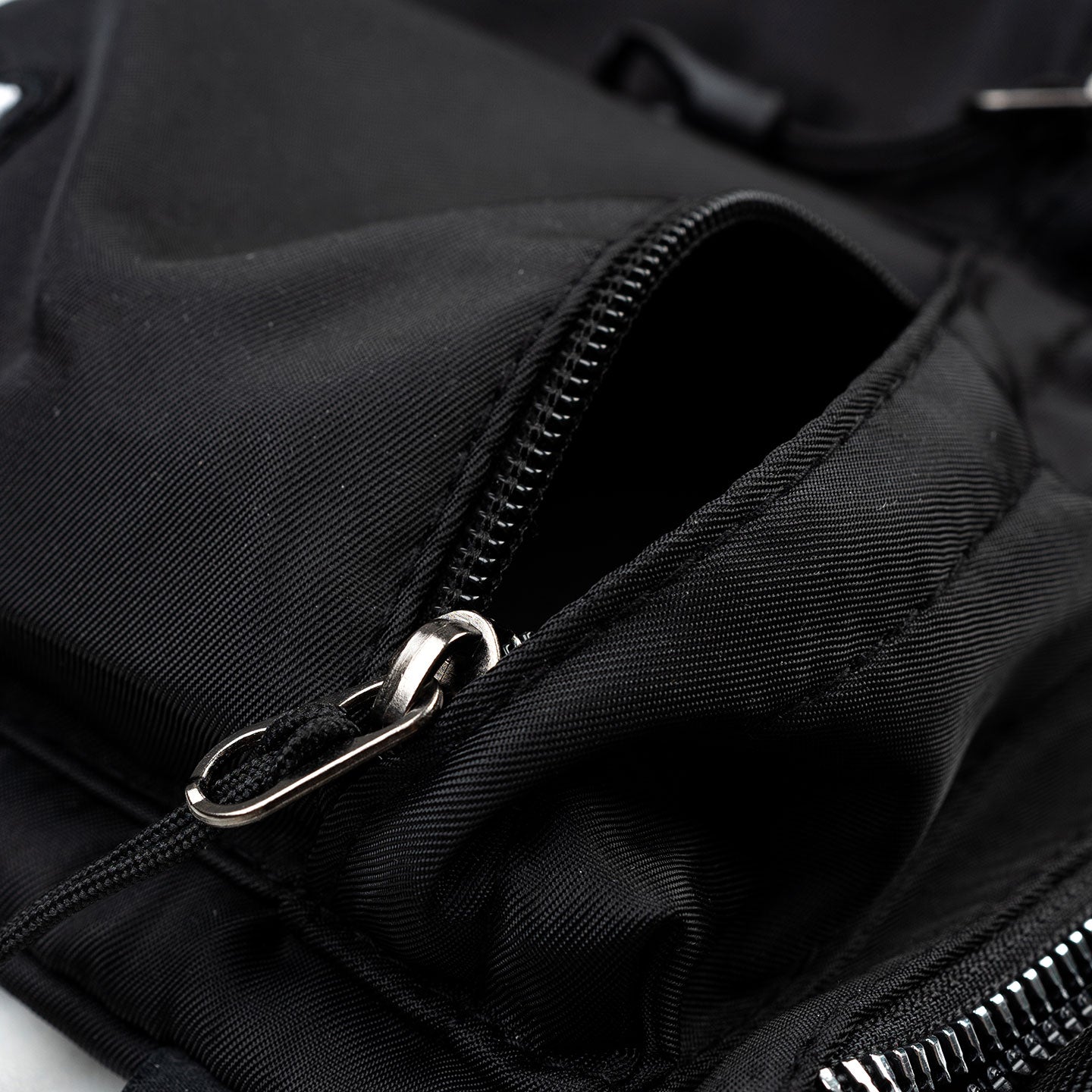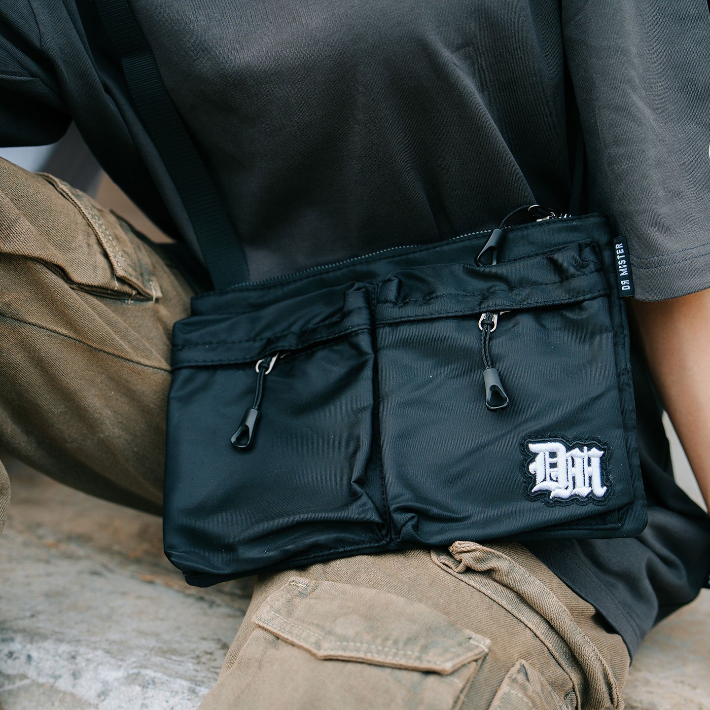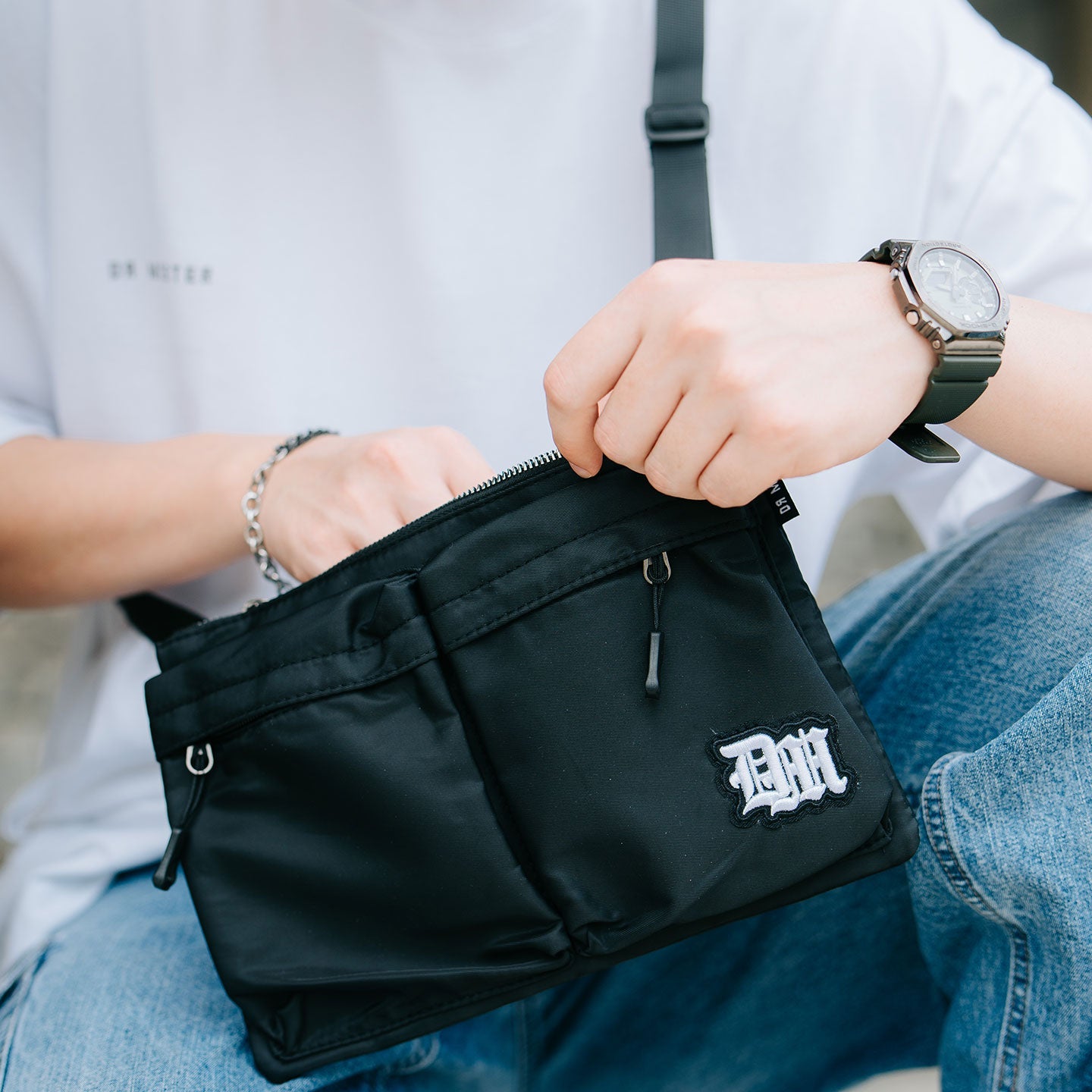 Black Nylon Sling Bag features four compartment pockets - The main one with hidden pocket and two front pockets. zipper with extended grip for easy pulling; The bottom right is sewn with our scripted initial branding label.