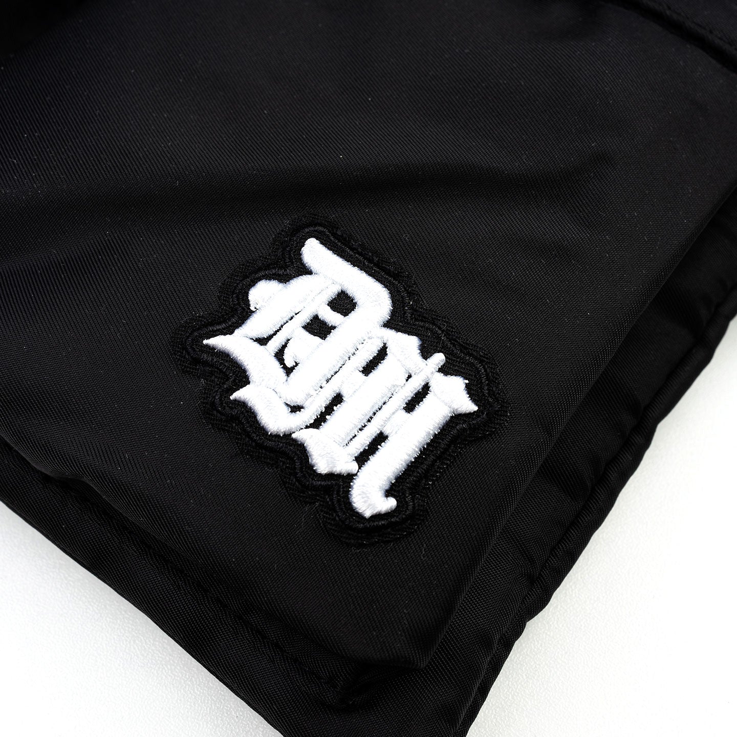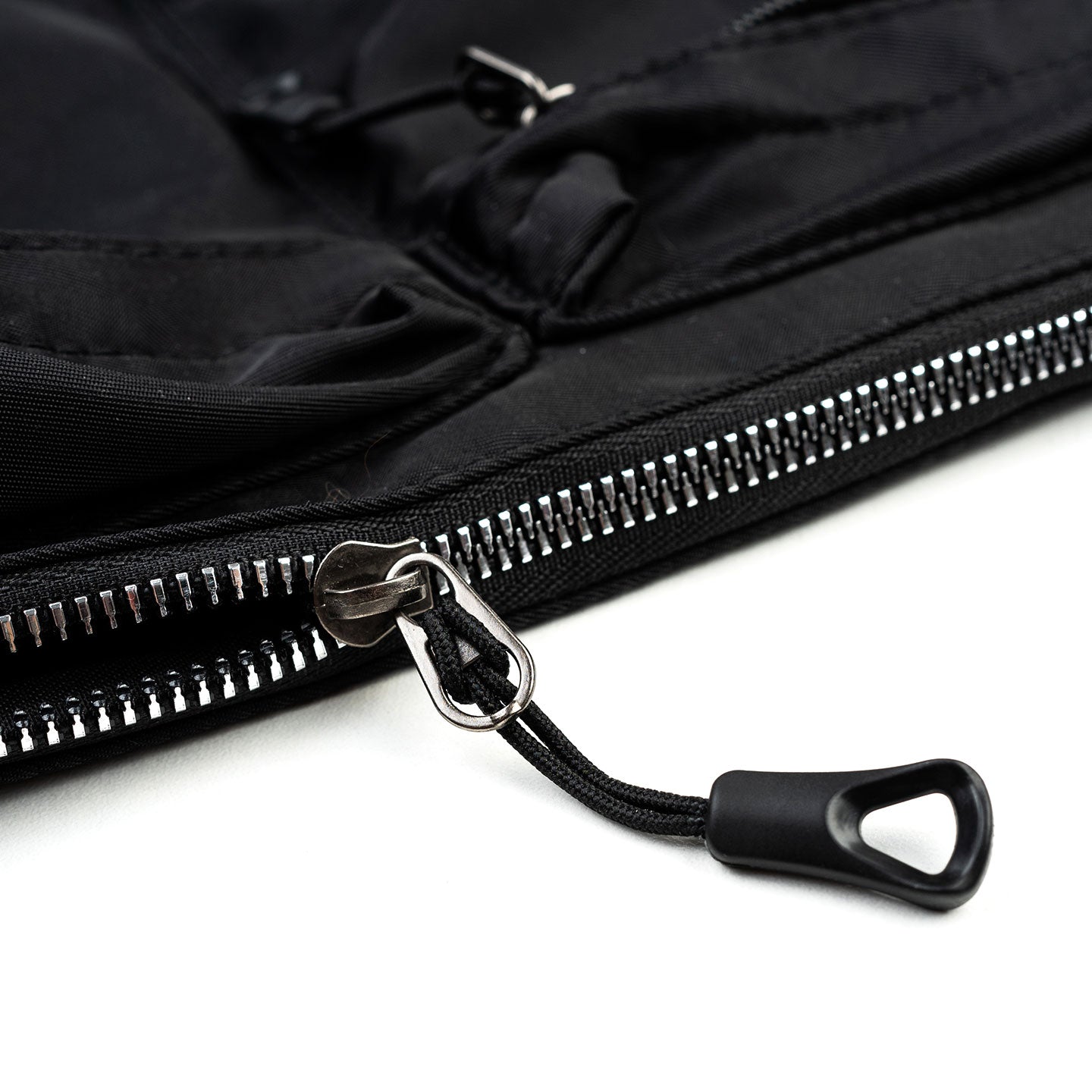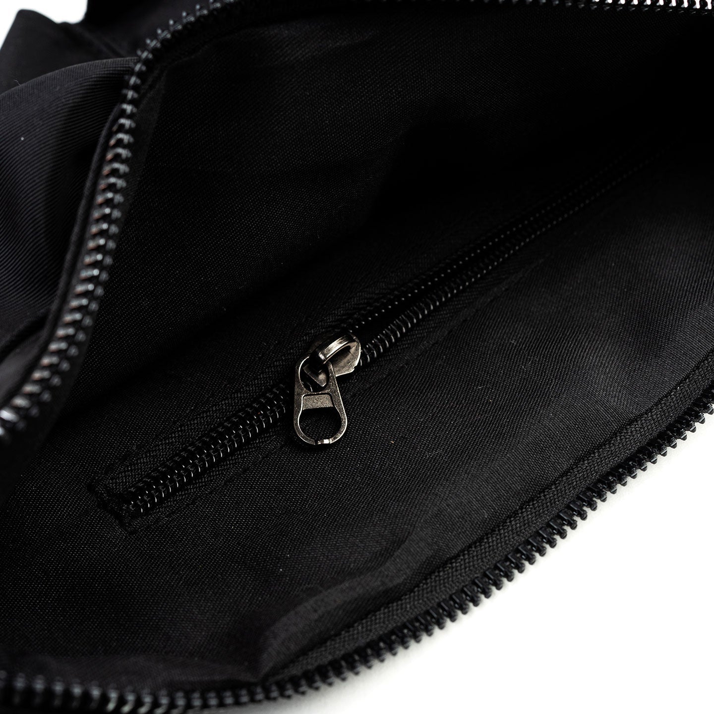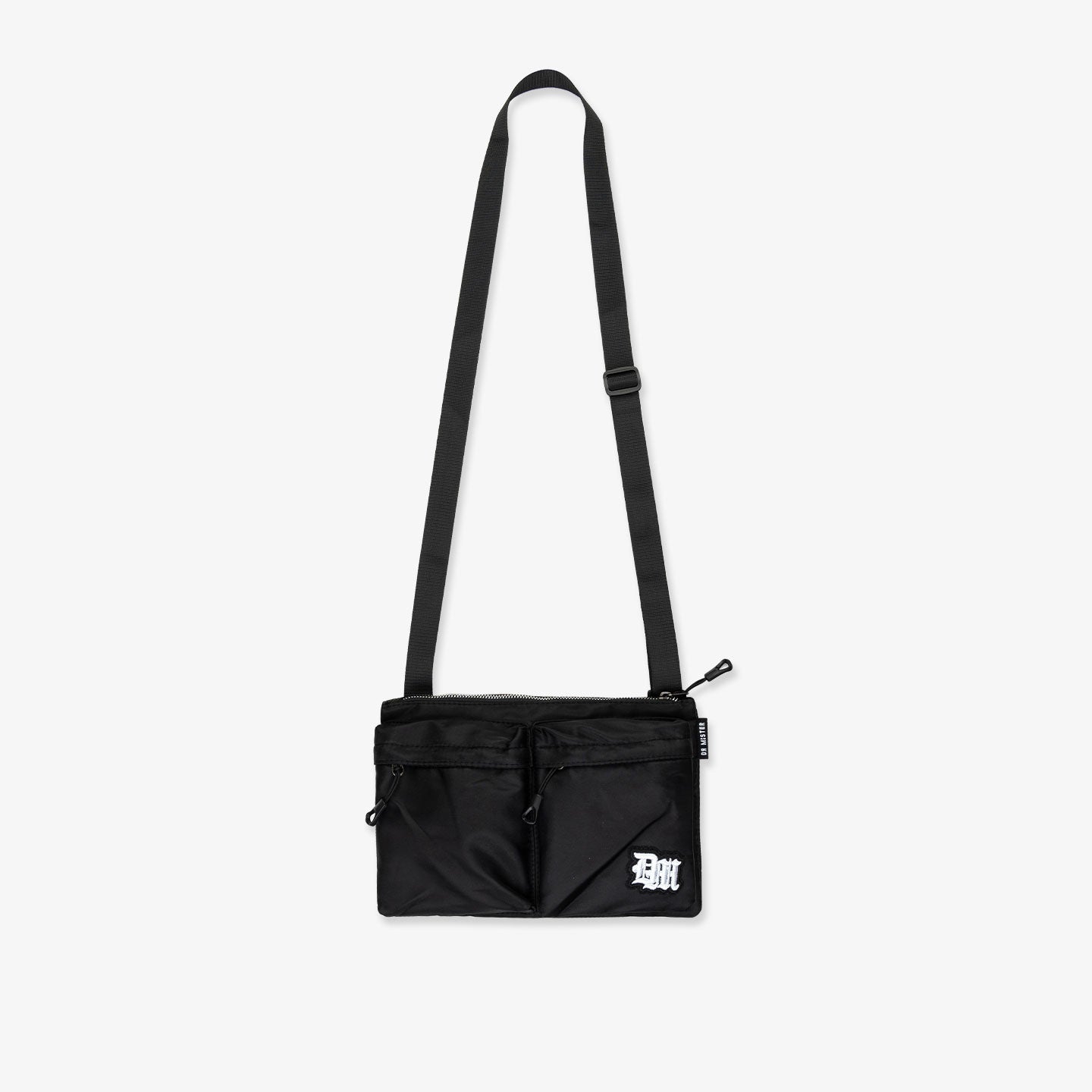 Black Nylon Sling Bag features four compartment pockets - The main one with hidden pocket and two front pockets. zipper with extended grip for easy pulling; The bottom right is sewn with our scripted initial branding label.