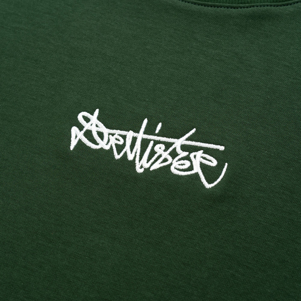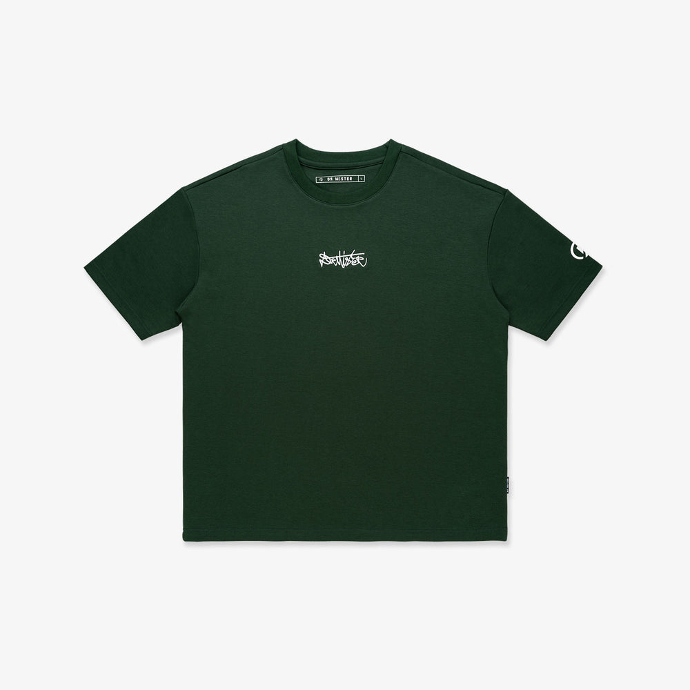 Green broad tee created from heavy weight cotton polyester fabric designed for minimal lovers. Embroidered with our signature logo at the front and brand motif at both sides at the bottom. Round graphic logo is printed on the left sleeve.