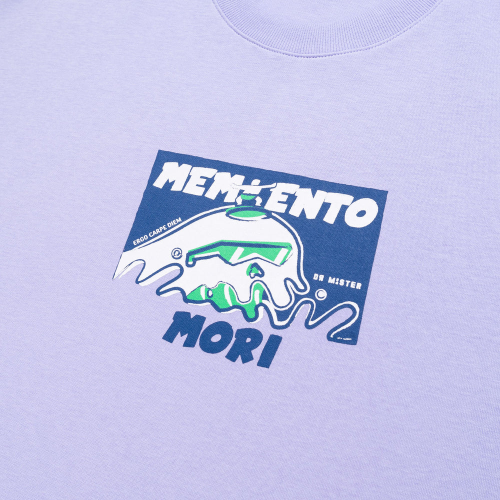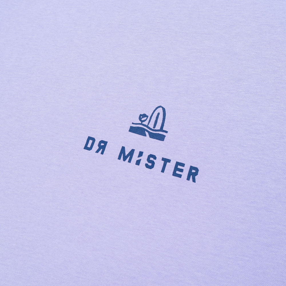 This light purple broad tee is crafted from heavyweight cotton-polyester fabric, showcasing a vibrant twist on the collection. The main graphic on the front features a character surfing on a skull wave, rendered in a special single-tone color scheme. This light-hearted yet modern theme extends to the back, which displays our branding and a subtle graphic of a surfboard shaped like a tombstone with a flower. The round graphic logo is printed on the left sleeve.