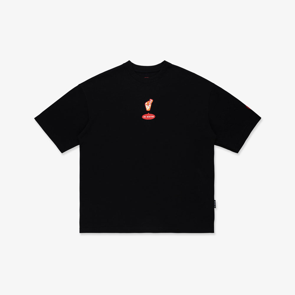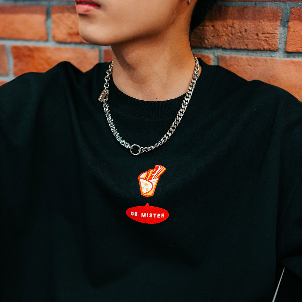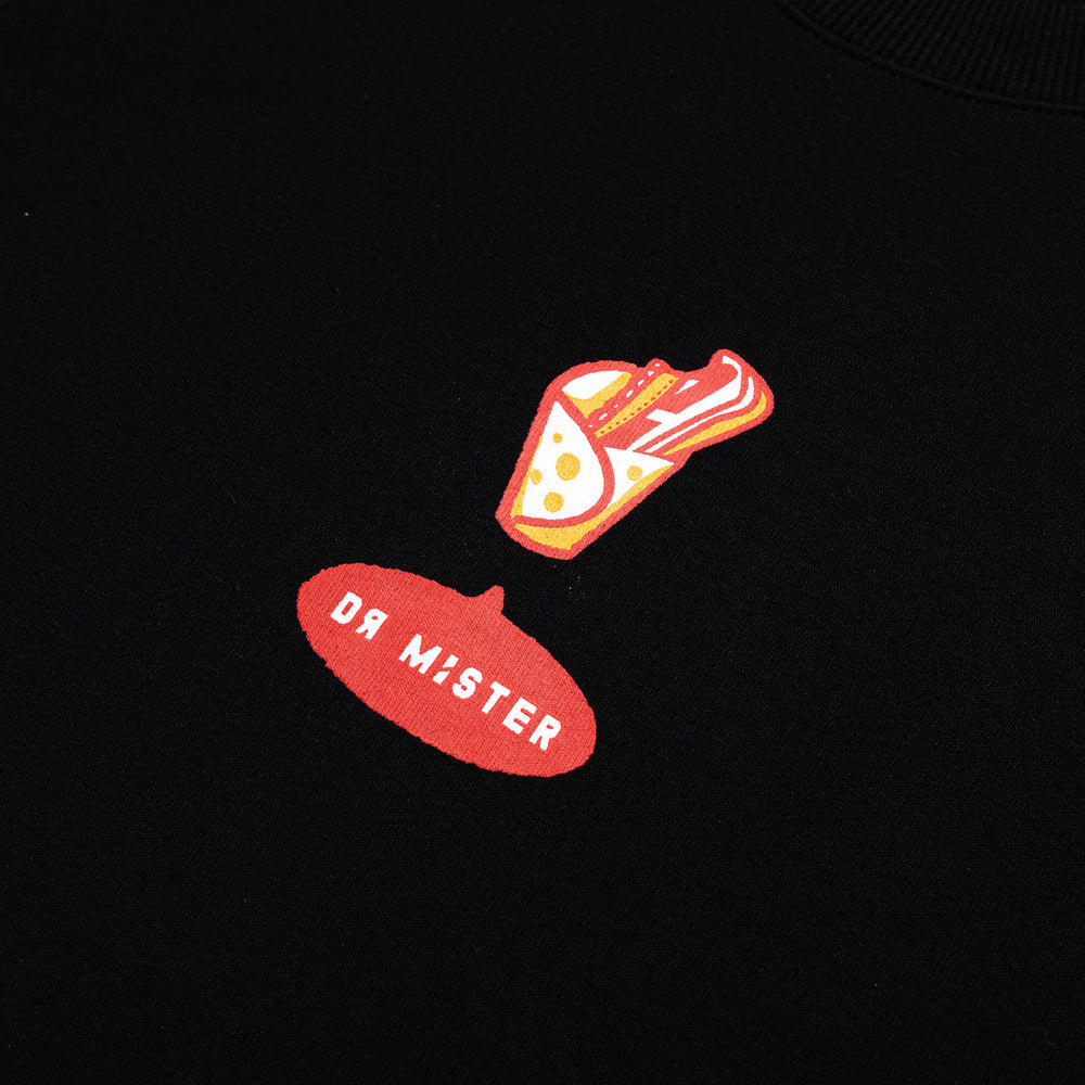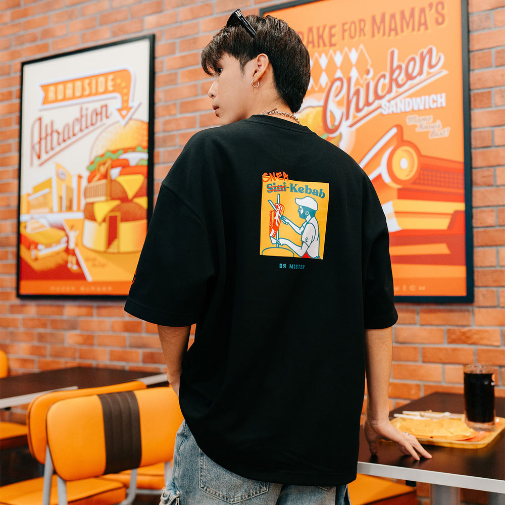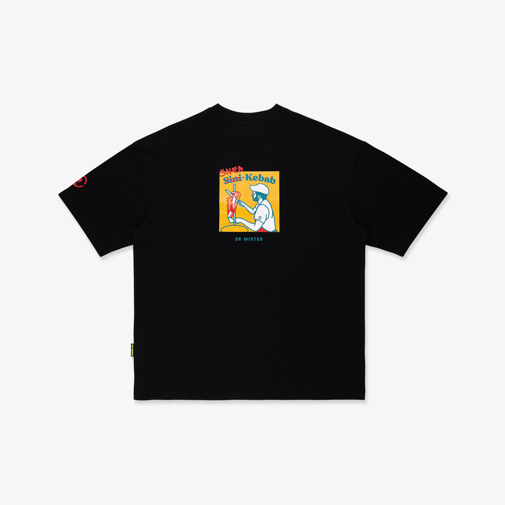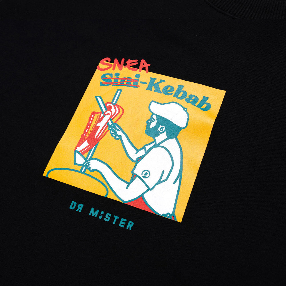 Made from black combed interlock cotton, the back displays a graphic of a person slicing a kebab, with a sneaker disguised as meat. The graphic includes a wordplay from “Sini-kebab” to “Snea-kebab”, referring to sneakers. The front features a mini “Sneakebab” logo with the logotype inside a speech bubble.