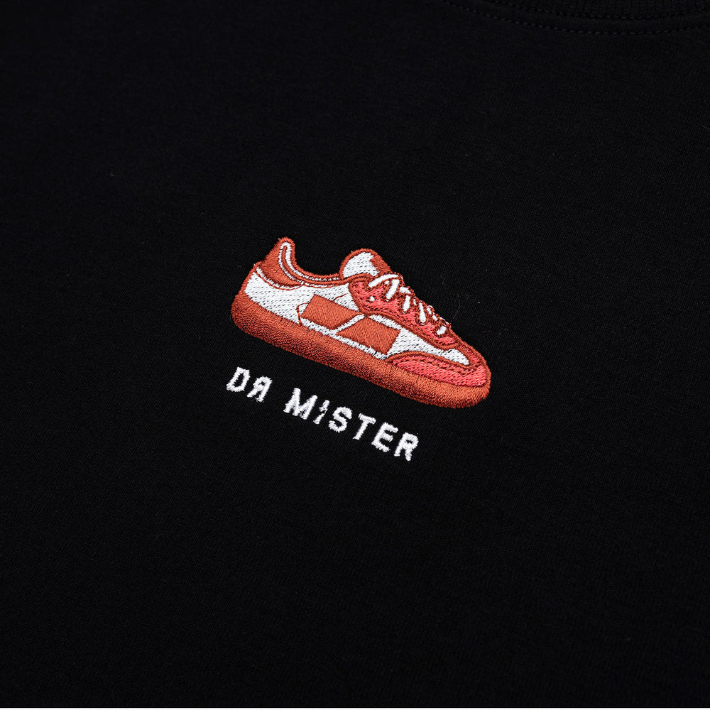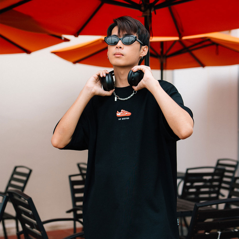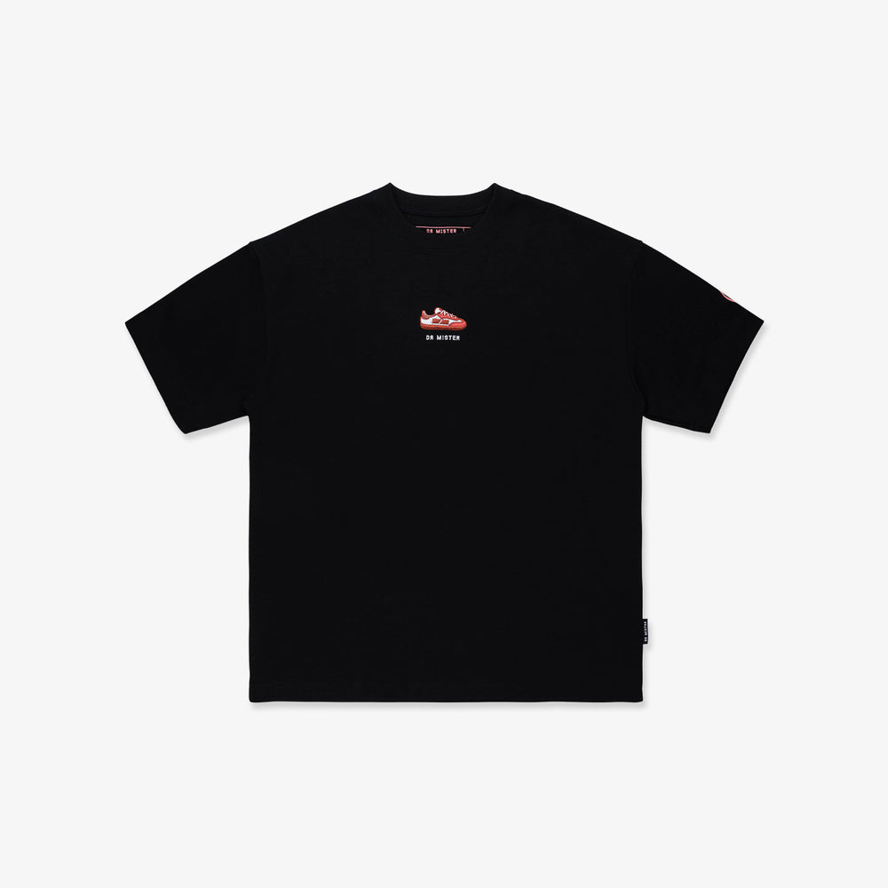 Made from black combed interlock cotton interlock, it features a graphic of hands putting sneakers to a foot, with a story-like narrative: “Once upon a time, in a bustling city where streetwear reigned supreme…”. The front showcases an embroidered sneakers logo along with the logotype.