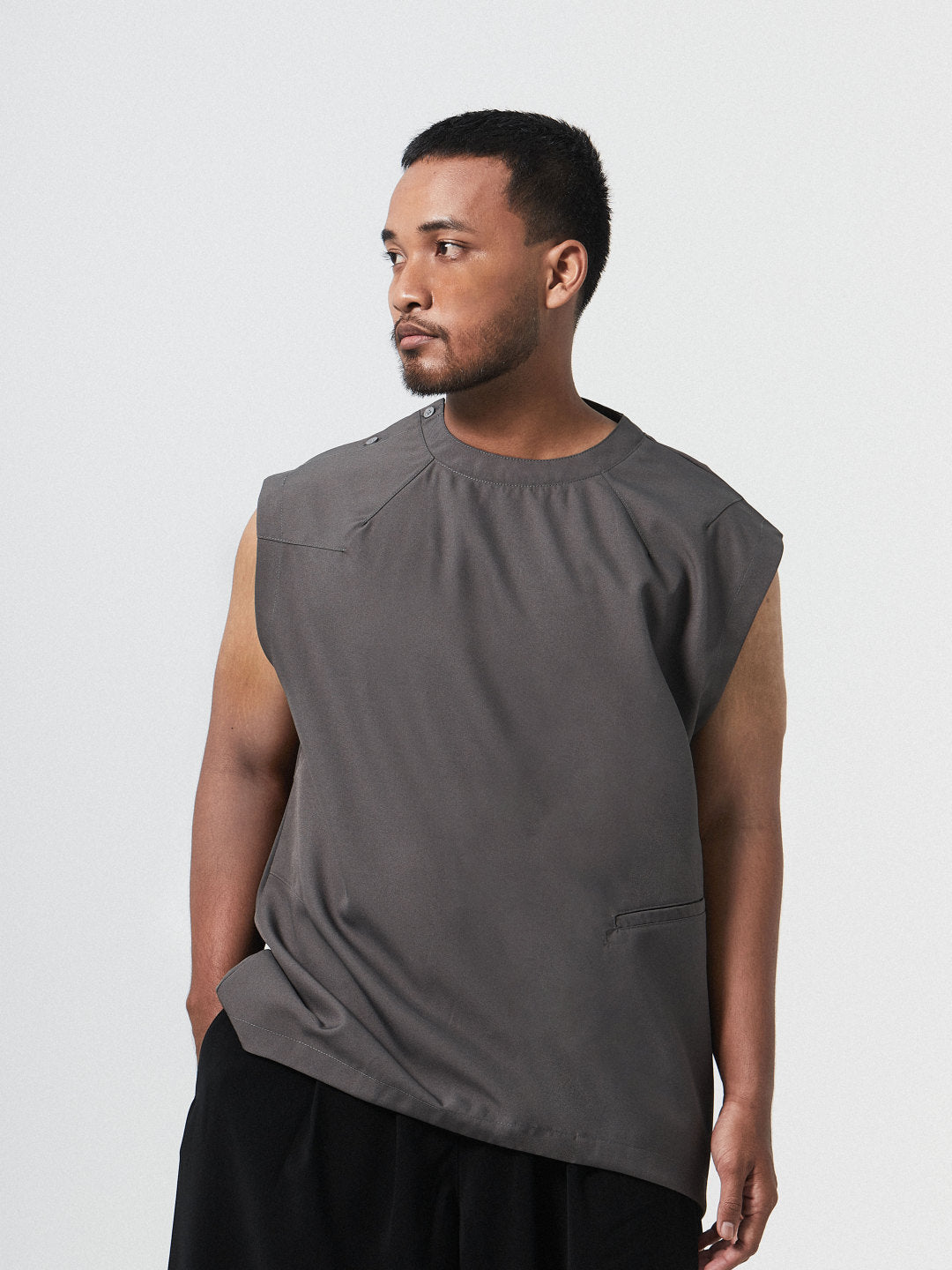 This sleeveless vest, made from microfine fabric, radiates sophistication with intricate asymmetrical pleats. It features a side placket with two buttons and a front welt pocket, balancing modernity and classic refinement. A versatile essential for any wardrobe.