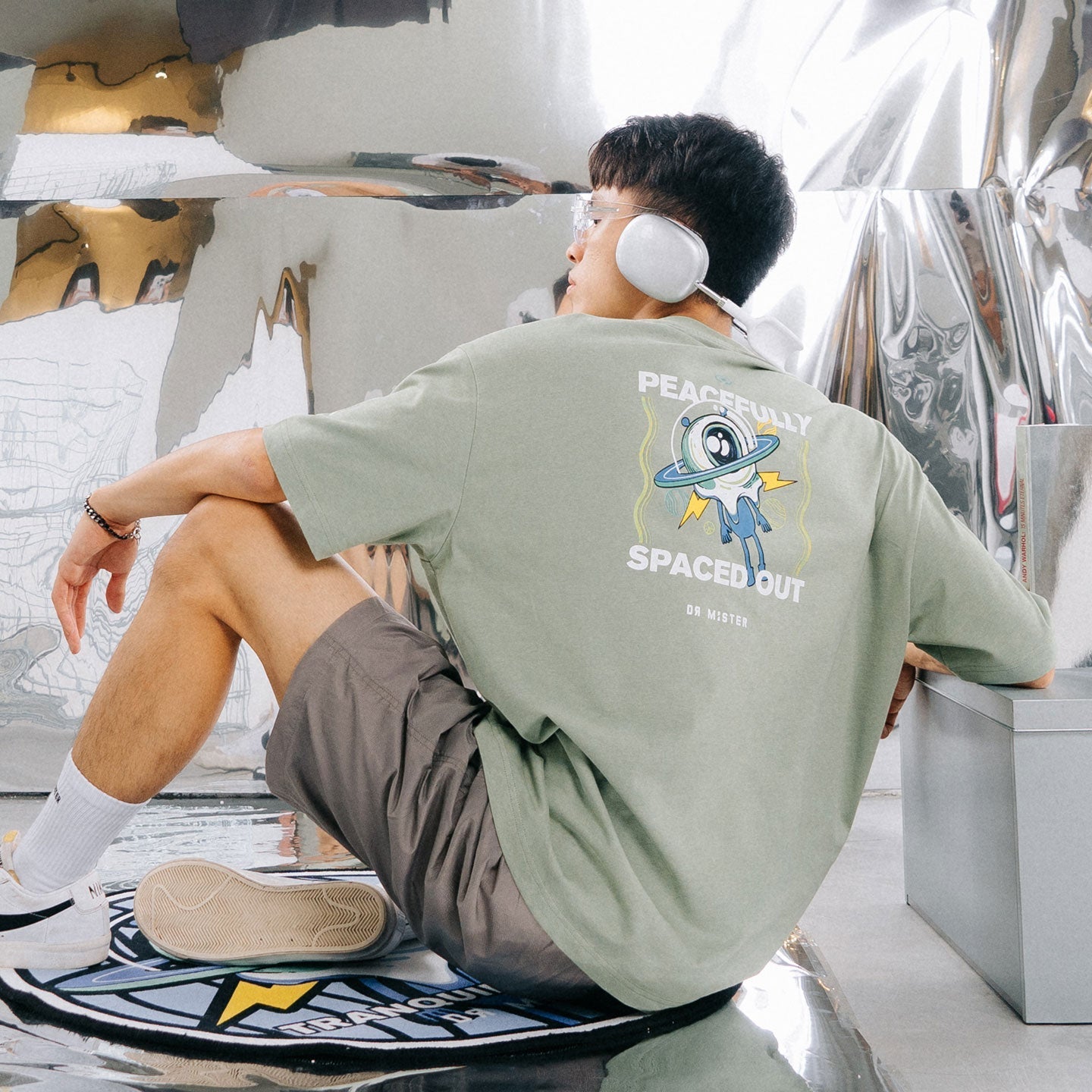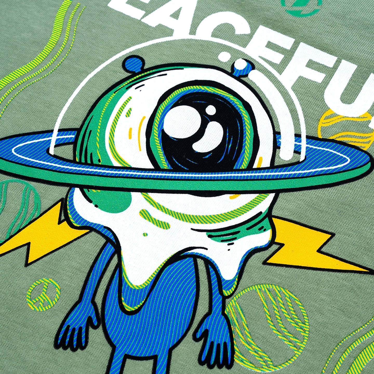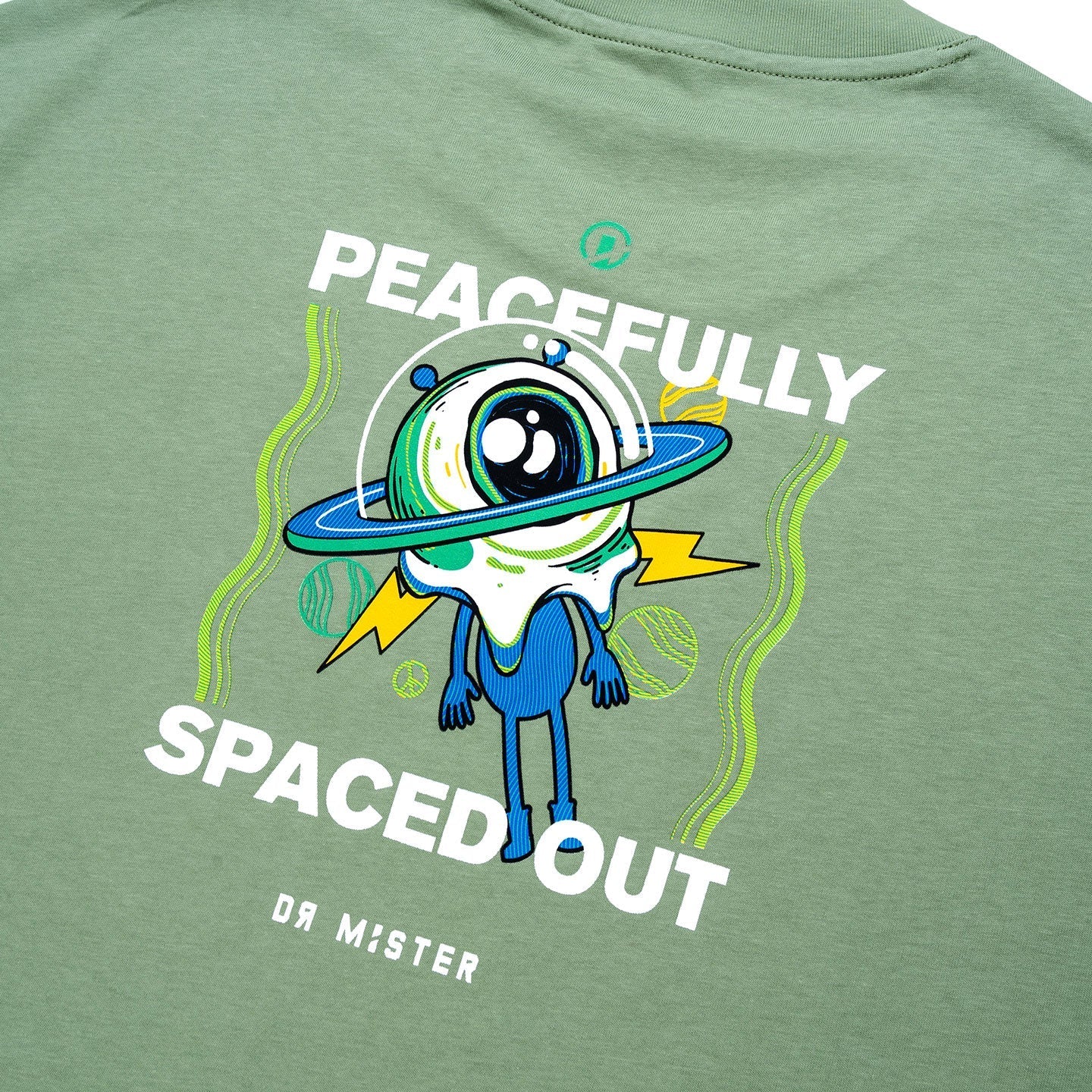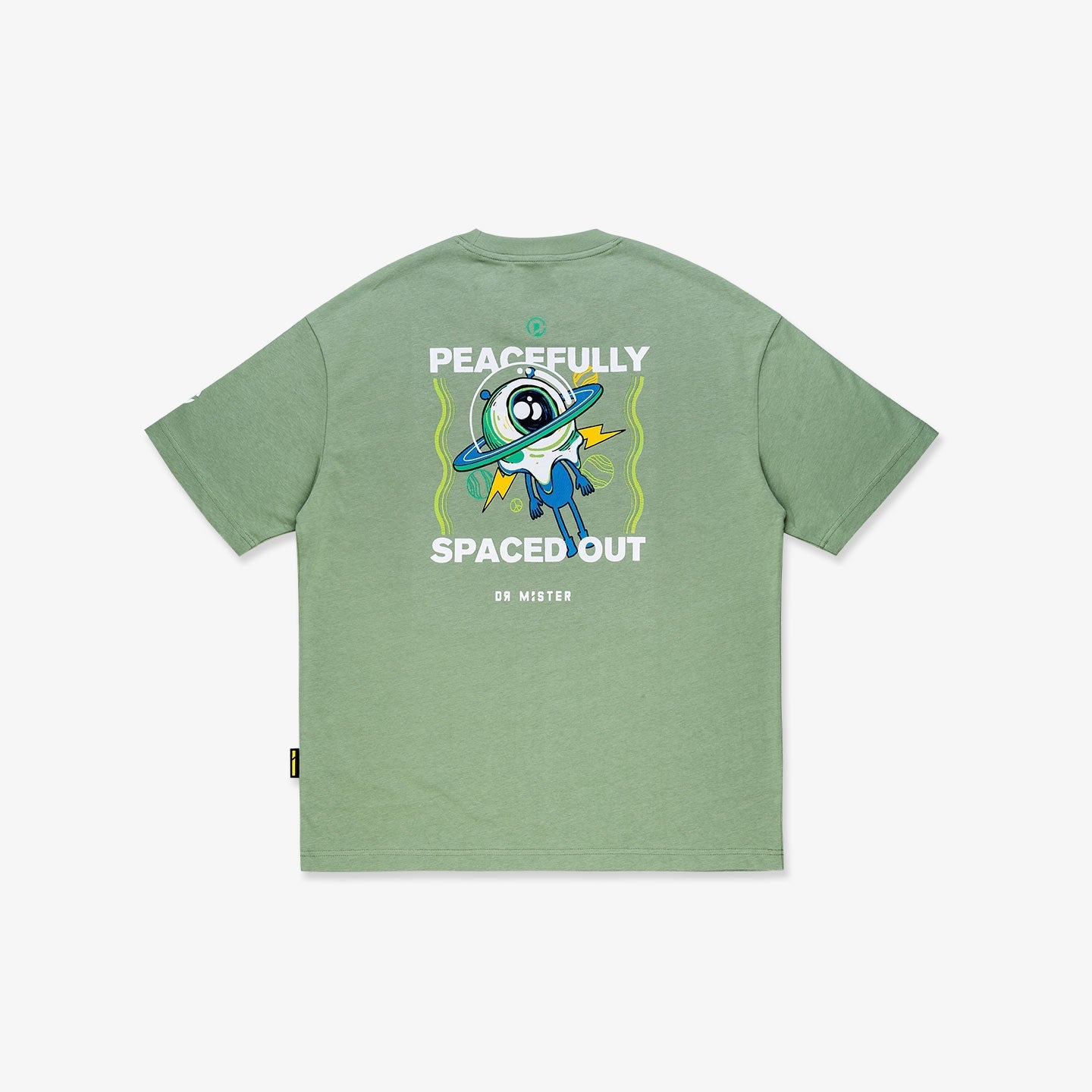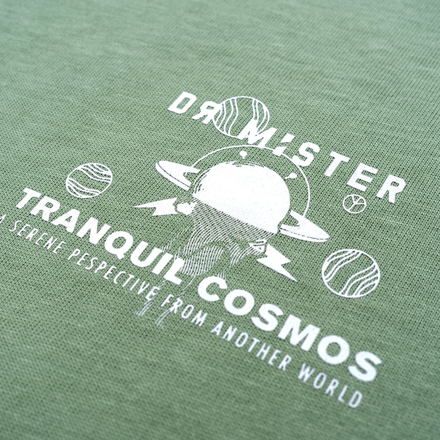 Moss green color oversized fit t-shirt made of Heavy Interlock Combed Cotton. Blend of tranquil cosmos wording and an alien graphic displayed on the front of the t-shirt. The back of the shirt showcases an alien peacefully spaced out and unfazed by the chaos, and our brand logo is printed on the left sides of the sleeves.