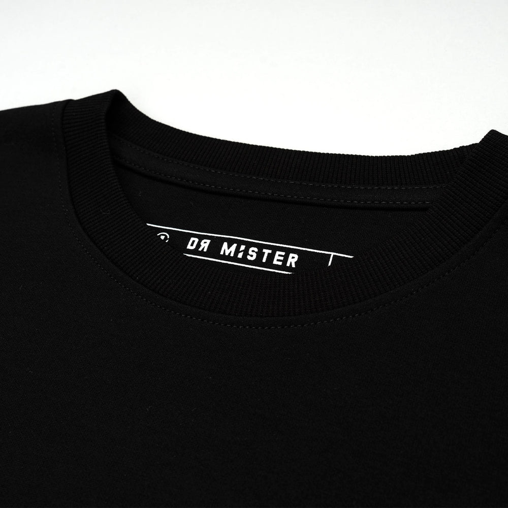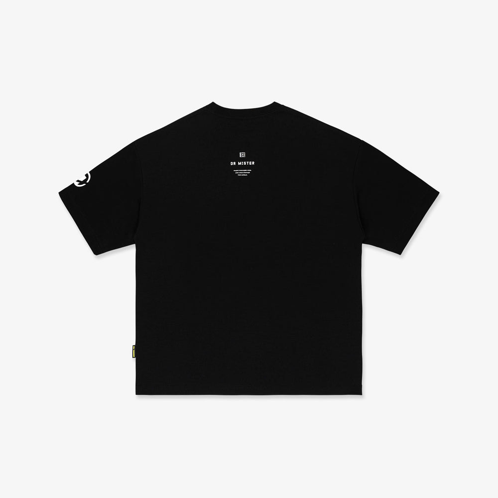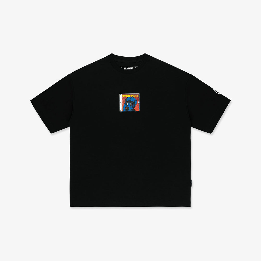 This black broad tee is made from cotton-polyester and comes in an oversized cut. It features a “Startyge” album cover graphic, inspired by The Weeknd’s Starboy at the front. The back showcases a mini disc case with our brand logo along with the brand name and collection phrase in distinctive font.