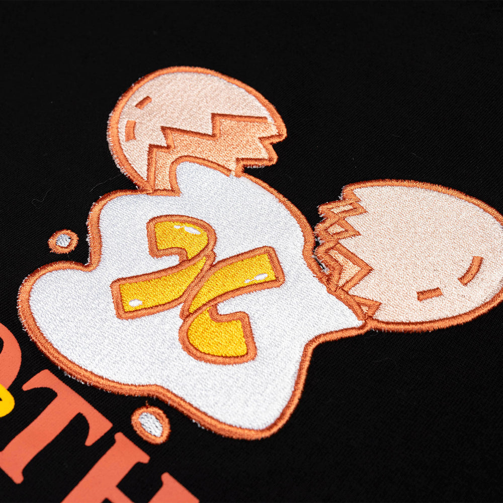 Cut from premium combed cotton with minimal shrinkage, the black tee features the “X” anniversary logo above the brand logotype on the front. The back showcases an embroidered cracked egg graphic, with the running yolk forming the “X” logo, layered over the anniversary slogan graphic in matching tones.