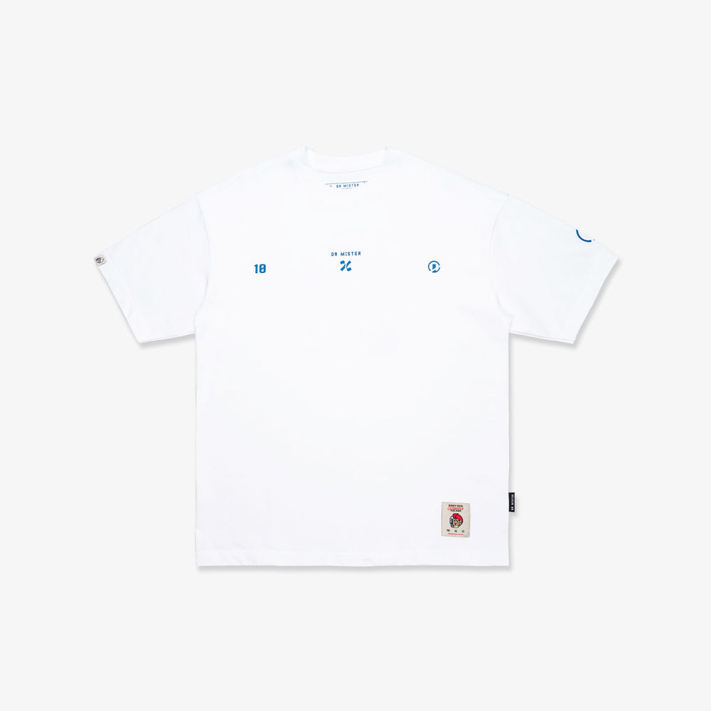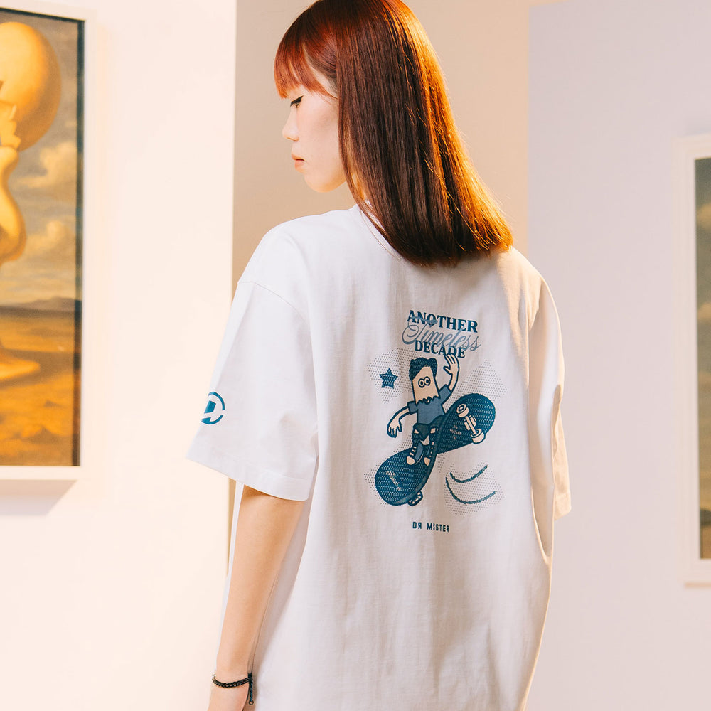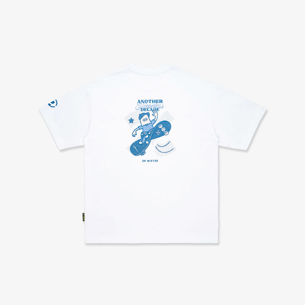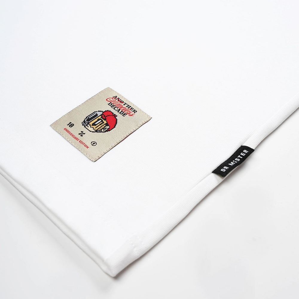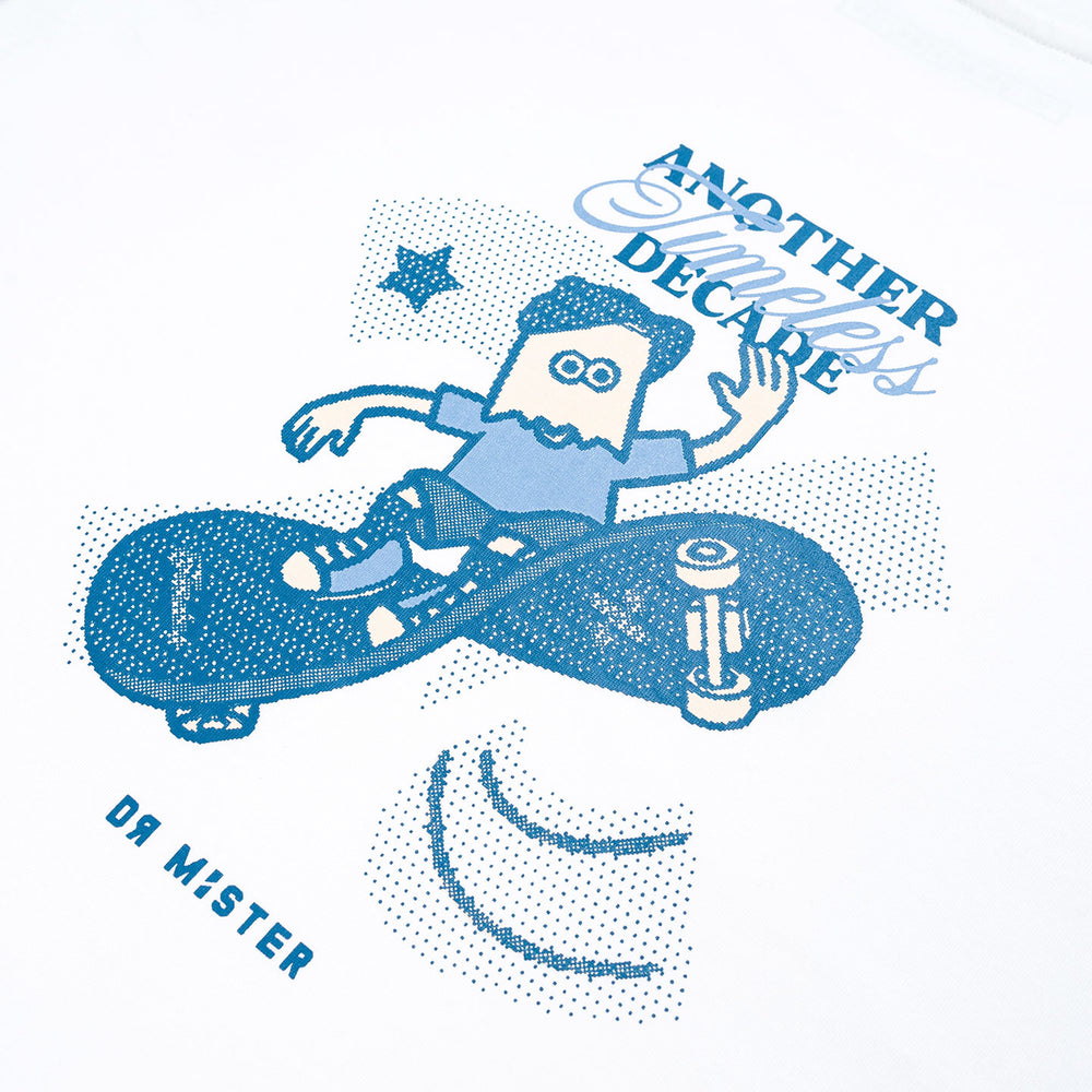Made from heavy combed cotton, the white broad tee features our classic Paper Bag Boy character performing an ollie skateboard trick in mid-air, layered over a halftone-style “X” anniversary design. A minimal, multi-logo anniversary graphic is subtly placed at the centre front.
