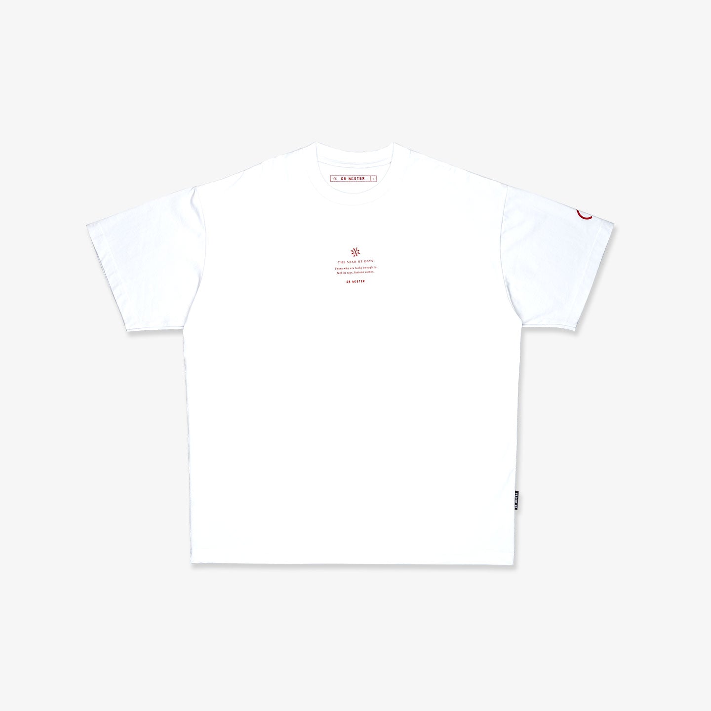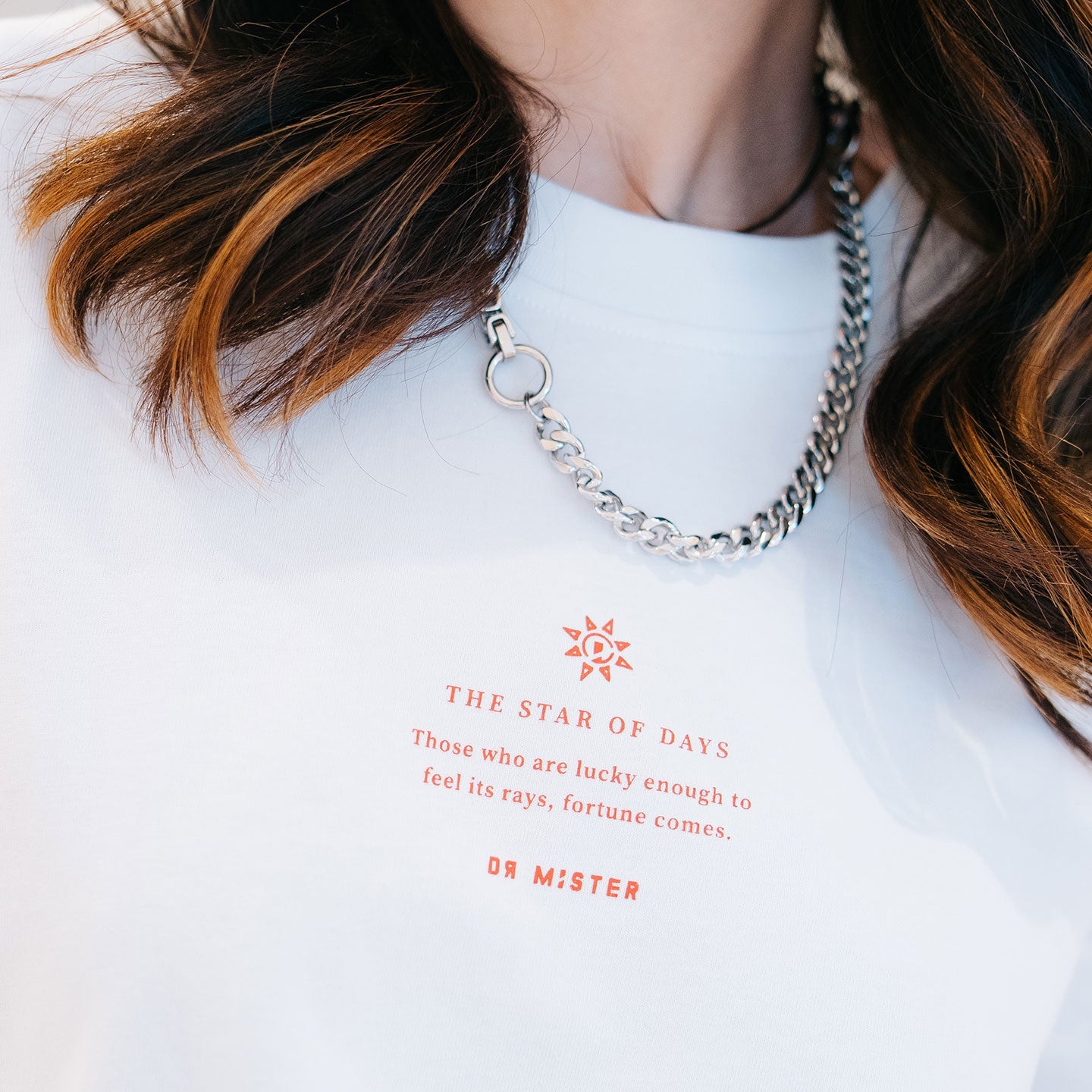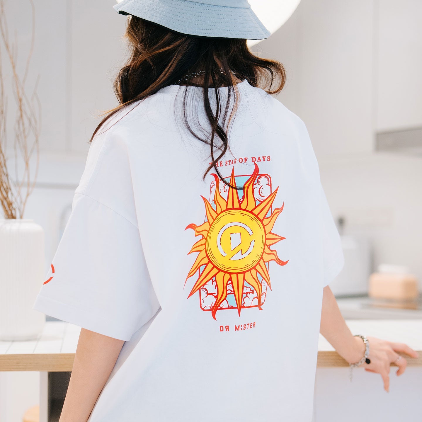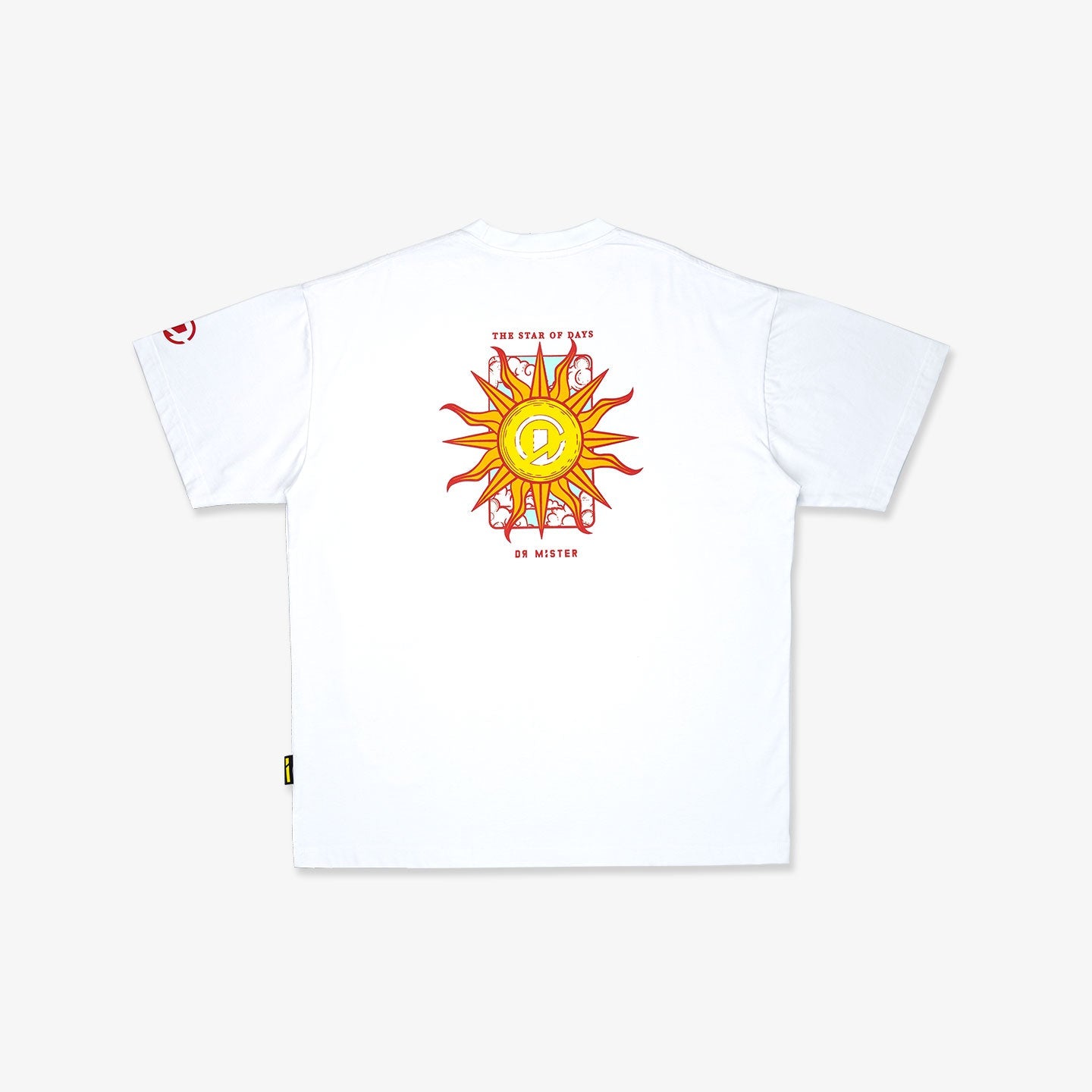 White broad tee designed from combed cotton that displays an inspiring tagline, brand logo, and collection graphic on the front. A sun graphic inspired by a tarot card style on the back and the graphic logo printed on the left sleeve.
