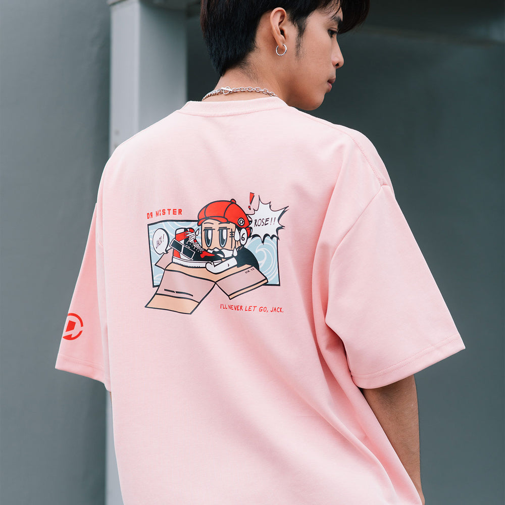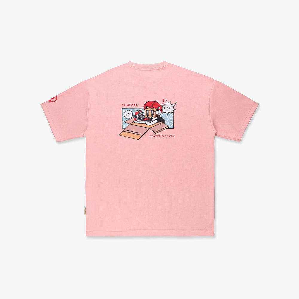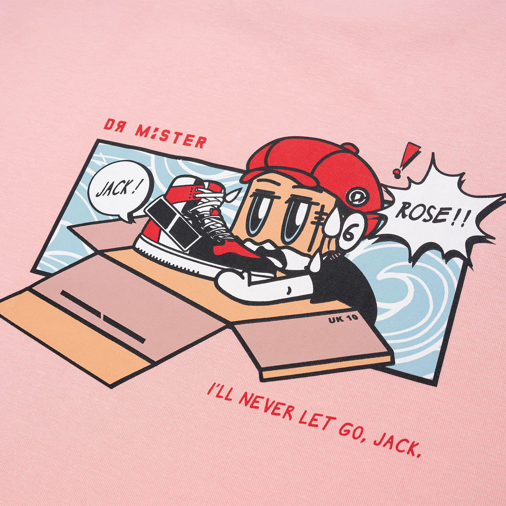 Crafted from beige pink combed interlock cotton, it features a vibrant off-panel comic graphic with a fun speech bubble. Near the main graphic, the line “I’ll Never Let Go, Jack” is displayed alongside the logotype. The front features a mini monochromatic logo with the logotype.