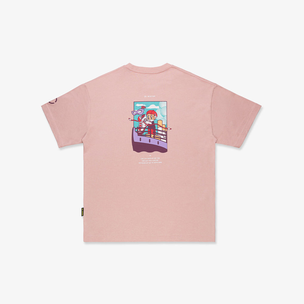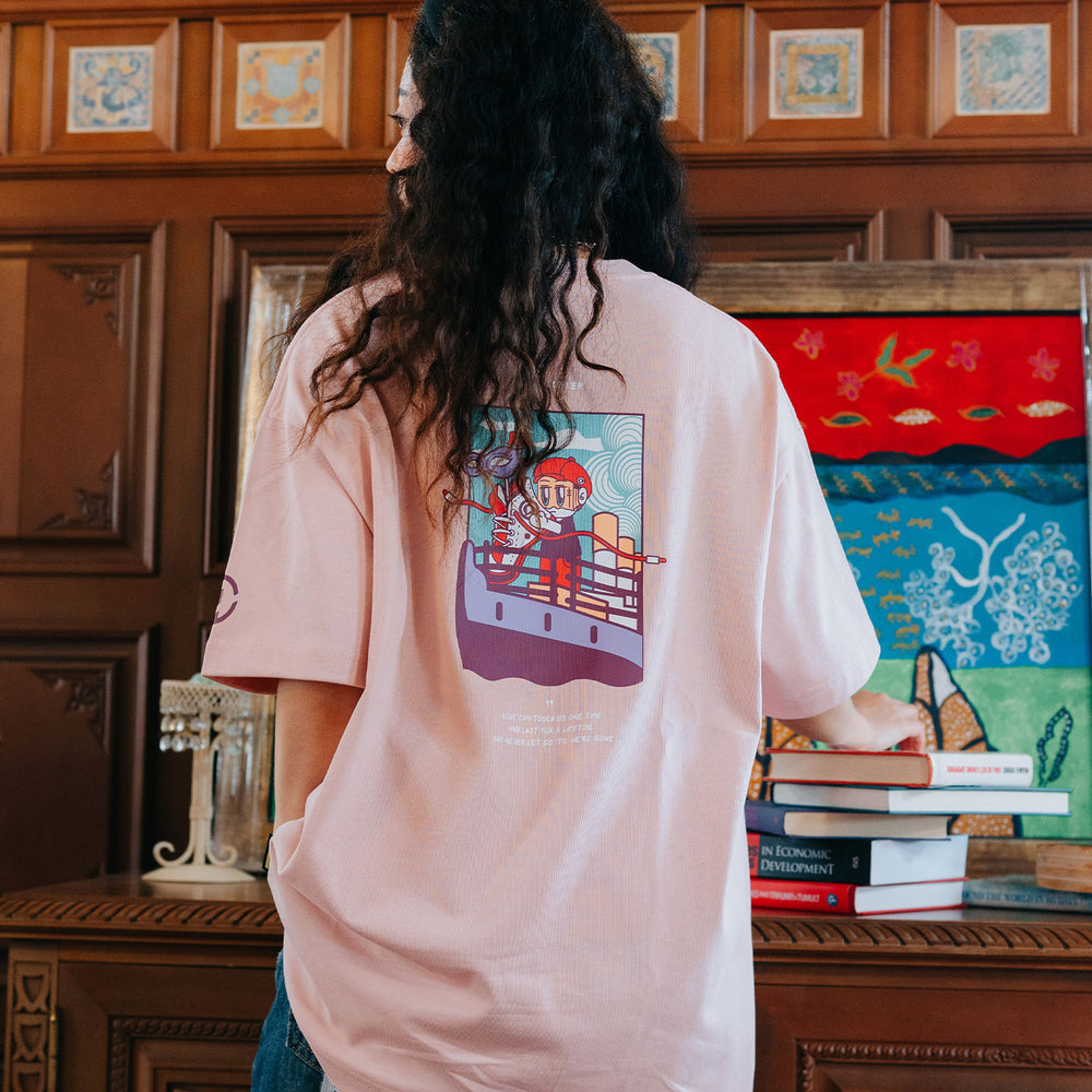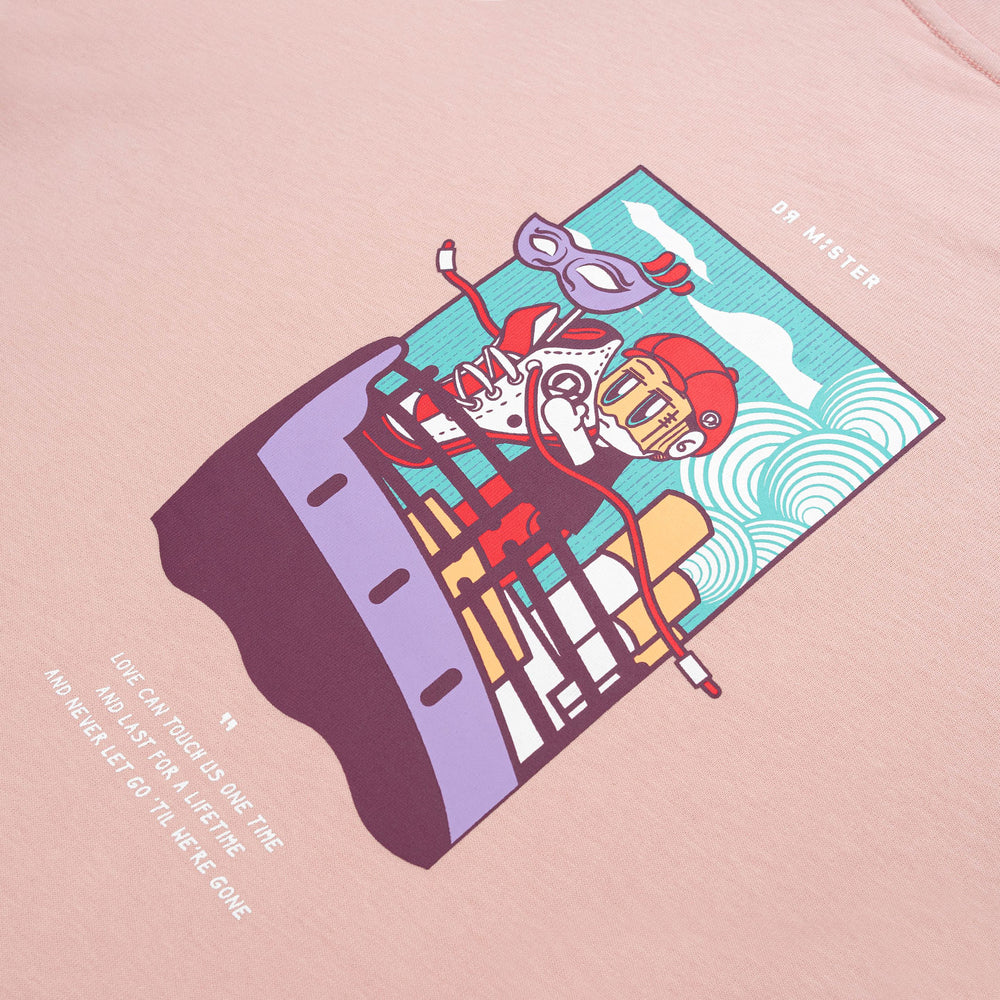 Available in dust pink, the cotton broad tee features a graphic of the Titanic breaking the frame, creating an illusion of movement. Tyge, depicted as Jack from Titanic, is shown holding a sneaker with a masquerade mask, while the shoelace resembles an outstretched arm, symbolizing Rose. Below the graphic is a lyric quote from My Heart Will Go On, the movie’s original soundtrack.