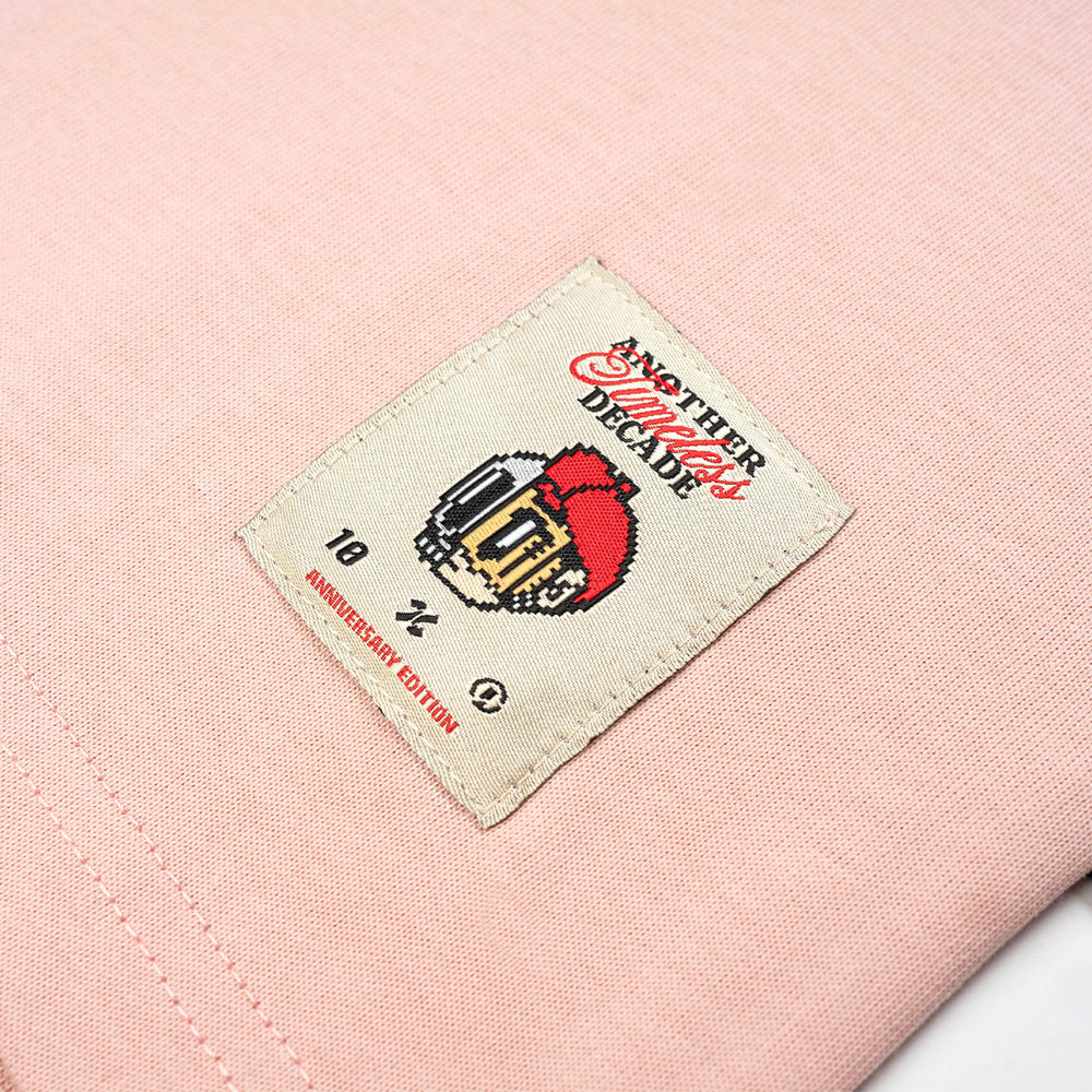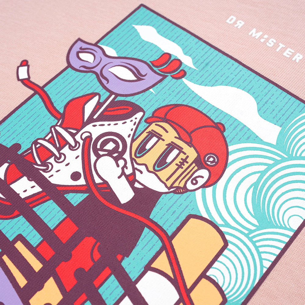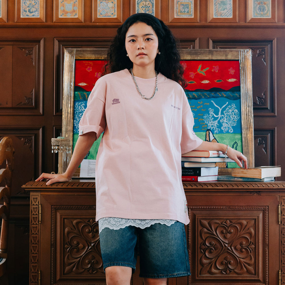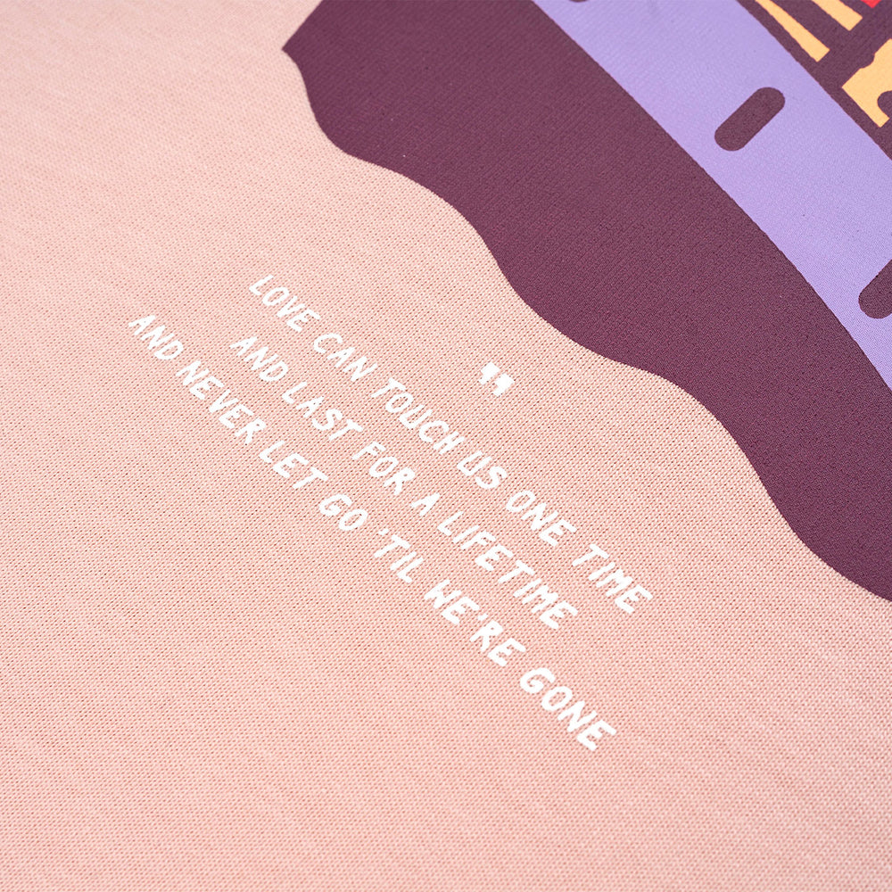 Available in dust pink, the cotton broad tee features a graphic of the Titanic breaking the frame, creating an illusion of movement. Tyge, depicted as Jack from Titanic, is shown holding a sneaker with a masquerade mask, while the shoelace resembles an outstretched arm, symbolizing Rose. Below the graphic is a lyric quote from My Heart Will Go On, the movie’s original soundtrack.