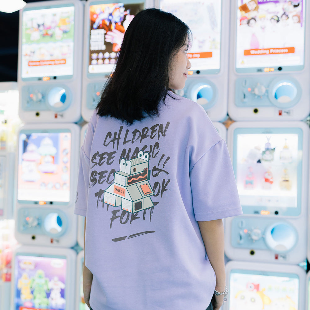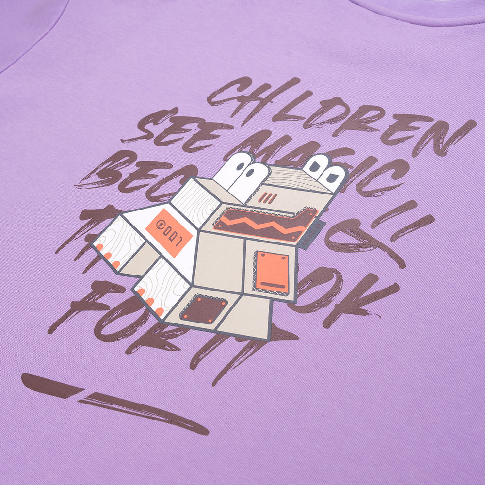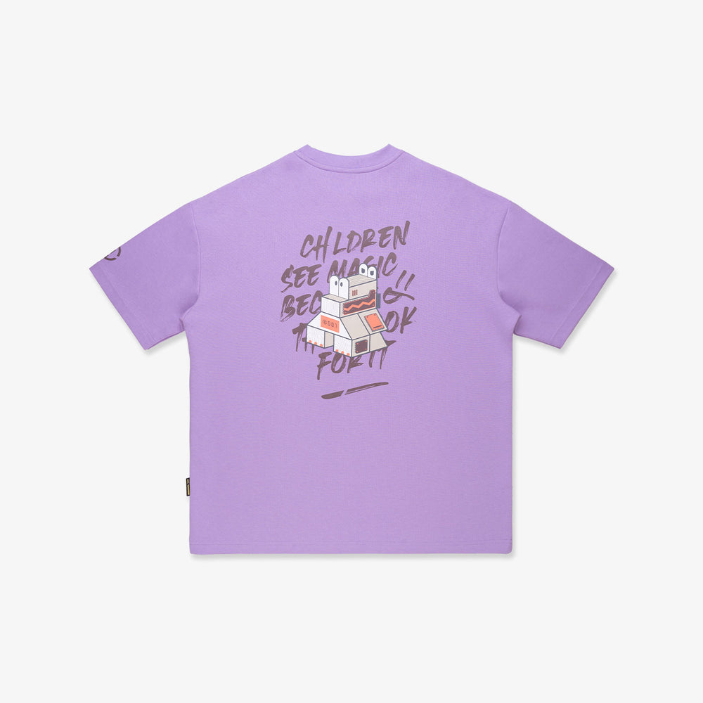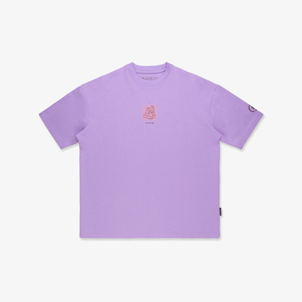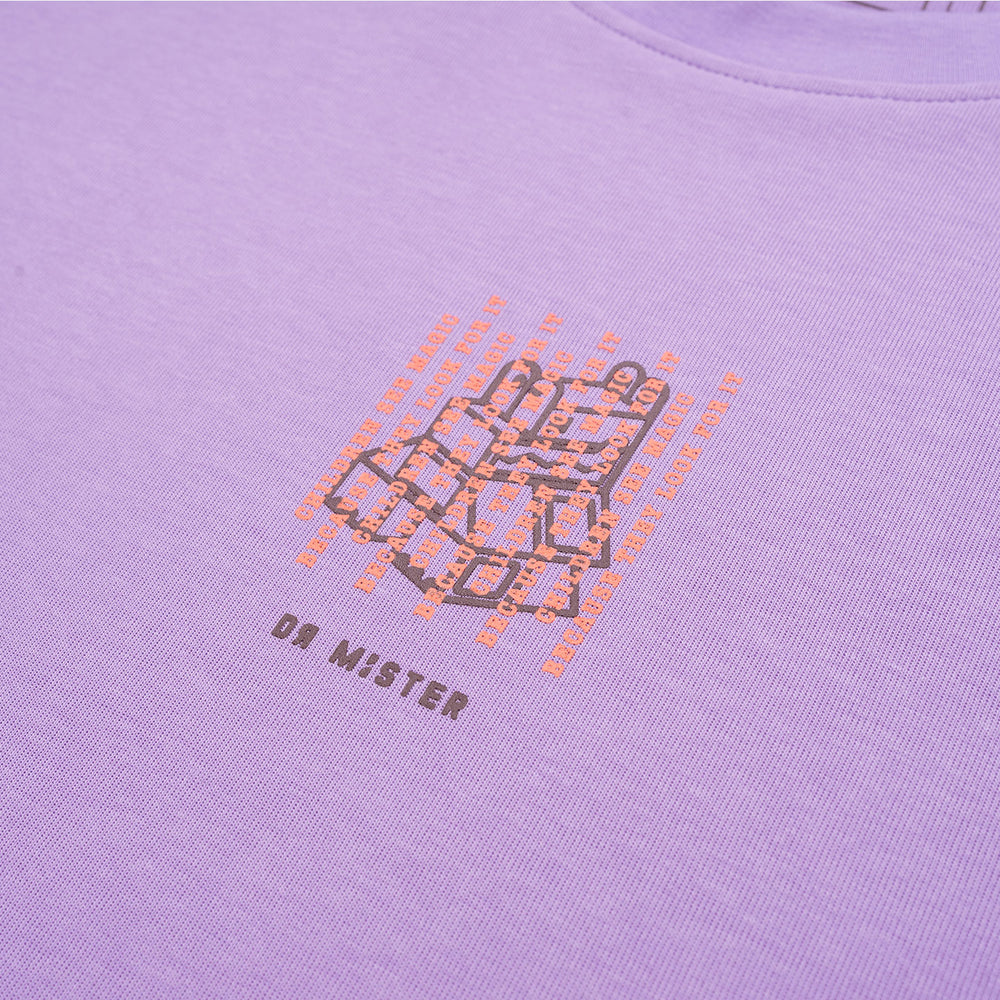 The Purple Broad Tee showcases a minimal outlined Wooden Dino overlay with the collection's phrase in a matrix-inspired pattern. The back features a full-color printing with Wooden Dino overlapped with the collection's phrase.